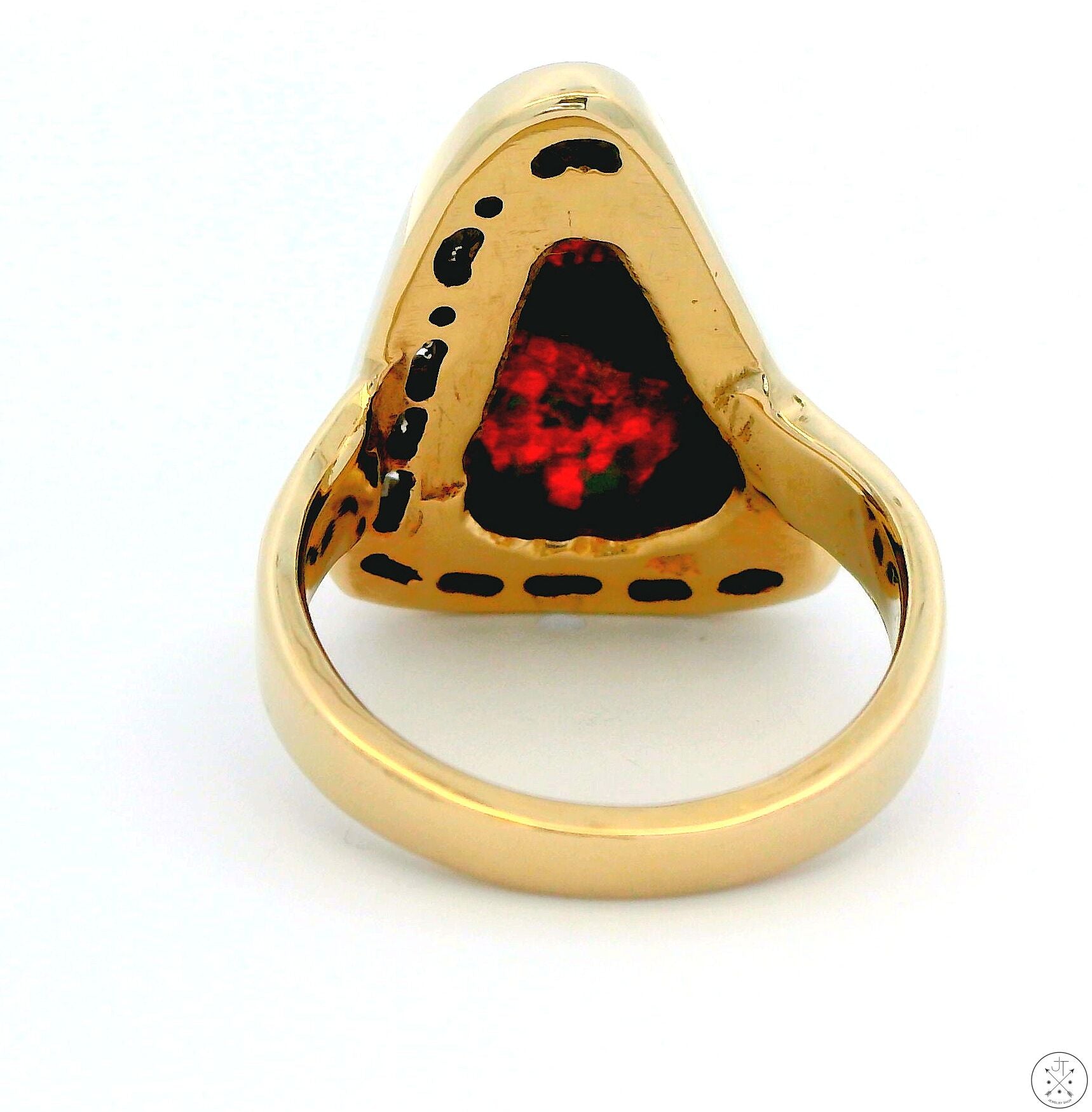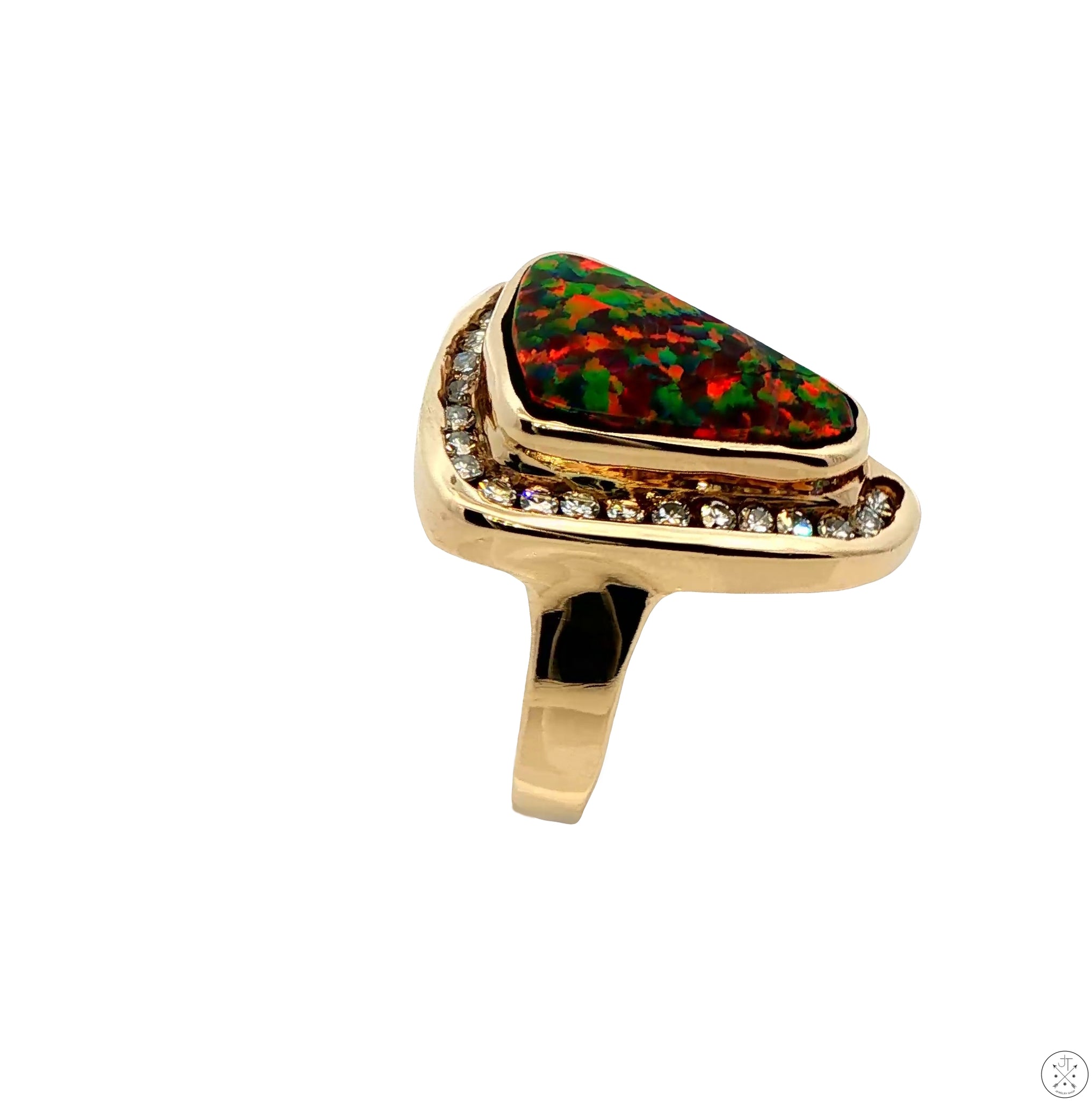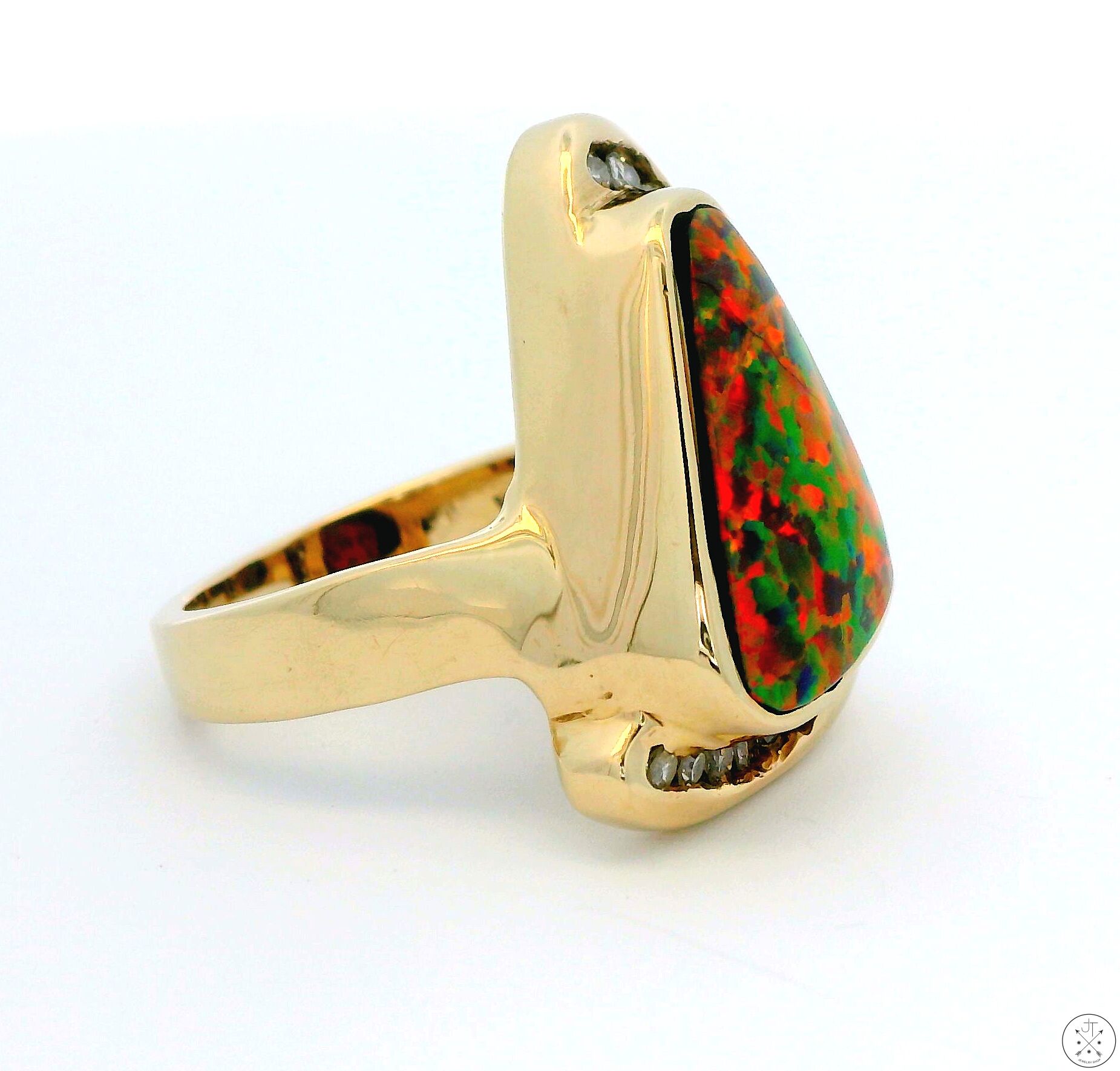 This stunning, custom statement ring is crafted of solid 14k Yellow Gold and features a large, approximately 4.70 carat natural Black Opal with intense orange-red play of color. The opal is mostly surrounded by approximately .45 ctw of round-faceted natural Diamonds, averaging approximately I-color and SI1-clarity, which enhance the ring's overall beauty and sparkle. This beautiful size 7.5 ring is perfect for any occasion. The Black Opal is the star of the show, and its unique play of color is sure to turn heads; the orange-red hues are vibrant and eye-catching, and the touches of green and blue help add glamour to any outfit. Originally handcrafted in the early 1990s, this pre-loved ring is a truly unique and special piece of jewelry that can last for generations. The stone has a fissure visible in some of the images - it is barely noticeable without magnification, and has been professionally stabilized. Includes an independently evaluated Retail Replacement Value card ($7,900) dated 2023, see images for details.