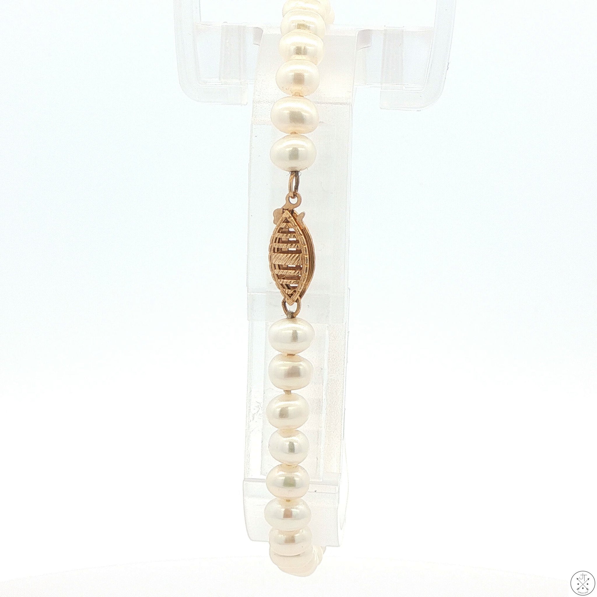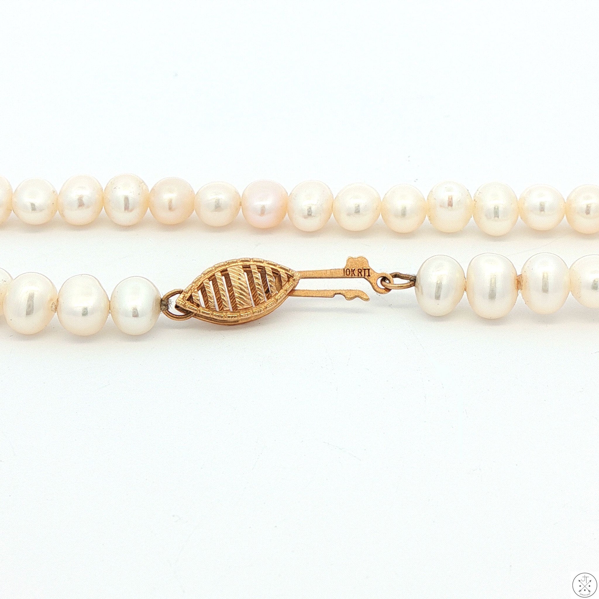 This exquisite bracelet features a stunning array of lustrous Pearls with a solid 10k Gold clasp. Perfect for both casual and formal occasions, this bracelet is a timeless addition to your jewelry collection. Stamped '10k RTI' on the clasp, this wonderful, vintage, 7.75-inch long bracelet weighs approximately 6.78 grams, and is in excellent condition. The 40 oval-shaped Pearls average approximately 5.5 mm long, are slightly pinkish to pearly to slightly grey, and appear to be cultured.