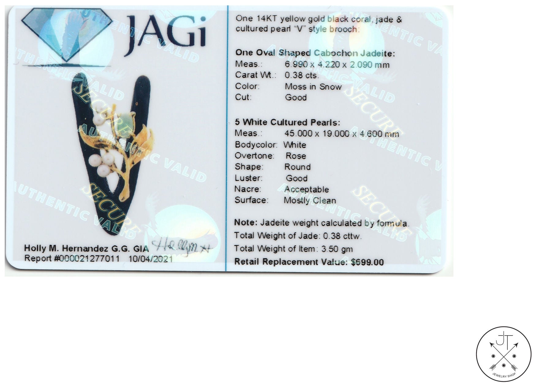 Beautiful mid-century black Coral brooch with a 14k Yellow Gold pin and accents holding a natural Jadeite cabochon and 5 cultured Pearls. With a 22 mm pin, this wonderful brooch measures approximately 44 mm wide and 20 mm tall and is in excellent condition, especially for its age. Includes an independent Retail Replacement Value card dated 2021 ($699), see images for details.