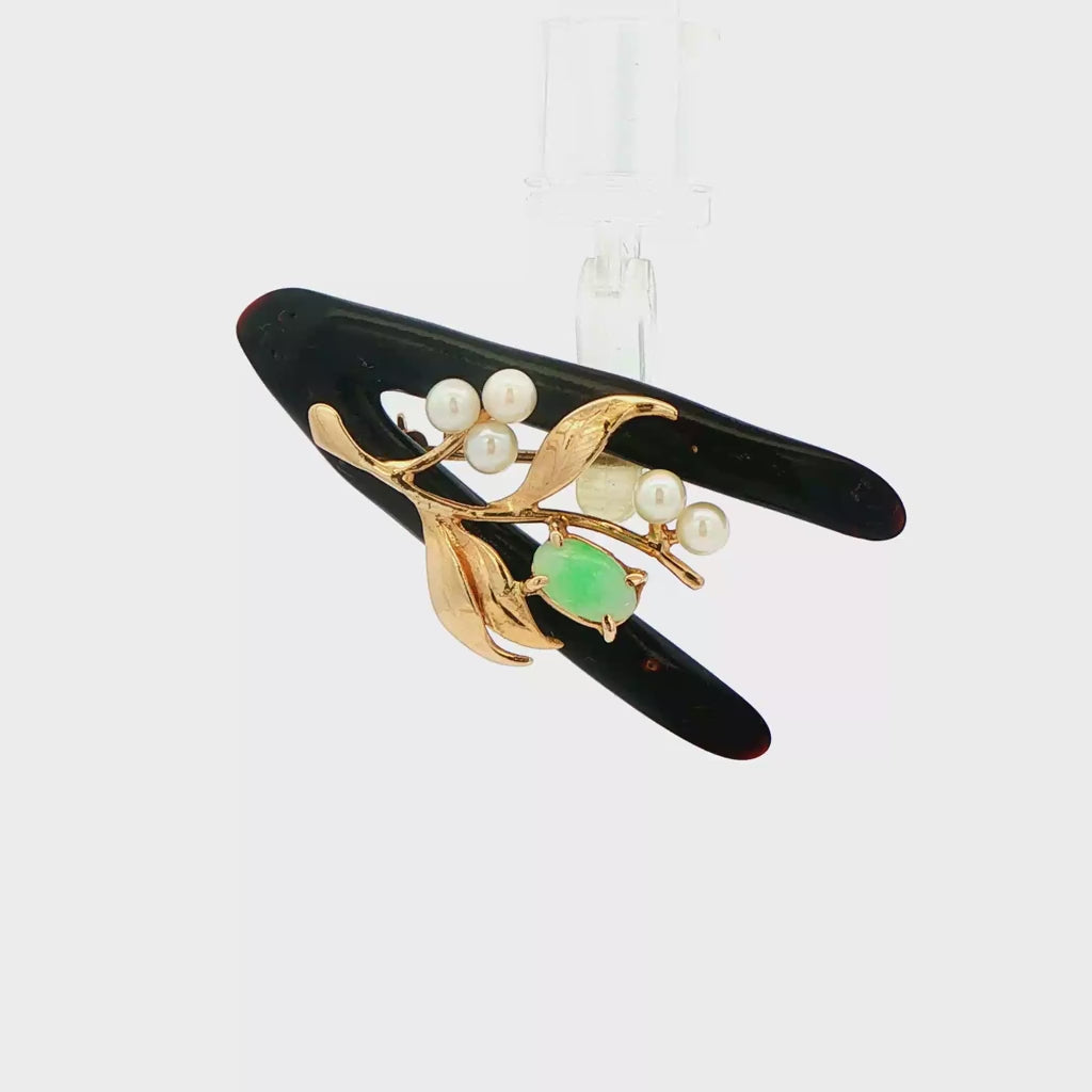 Vintage Brooch with 14k Yellow Gold Black Coral Jade and Pearl Pin Certified