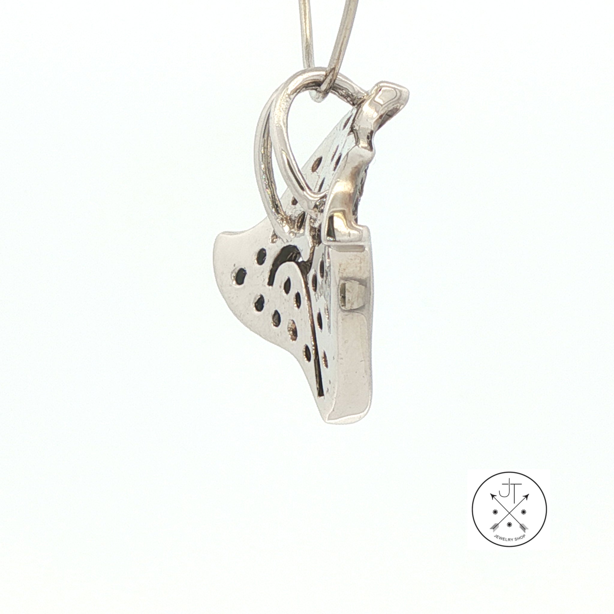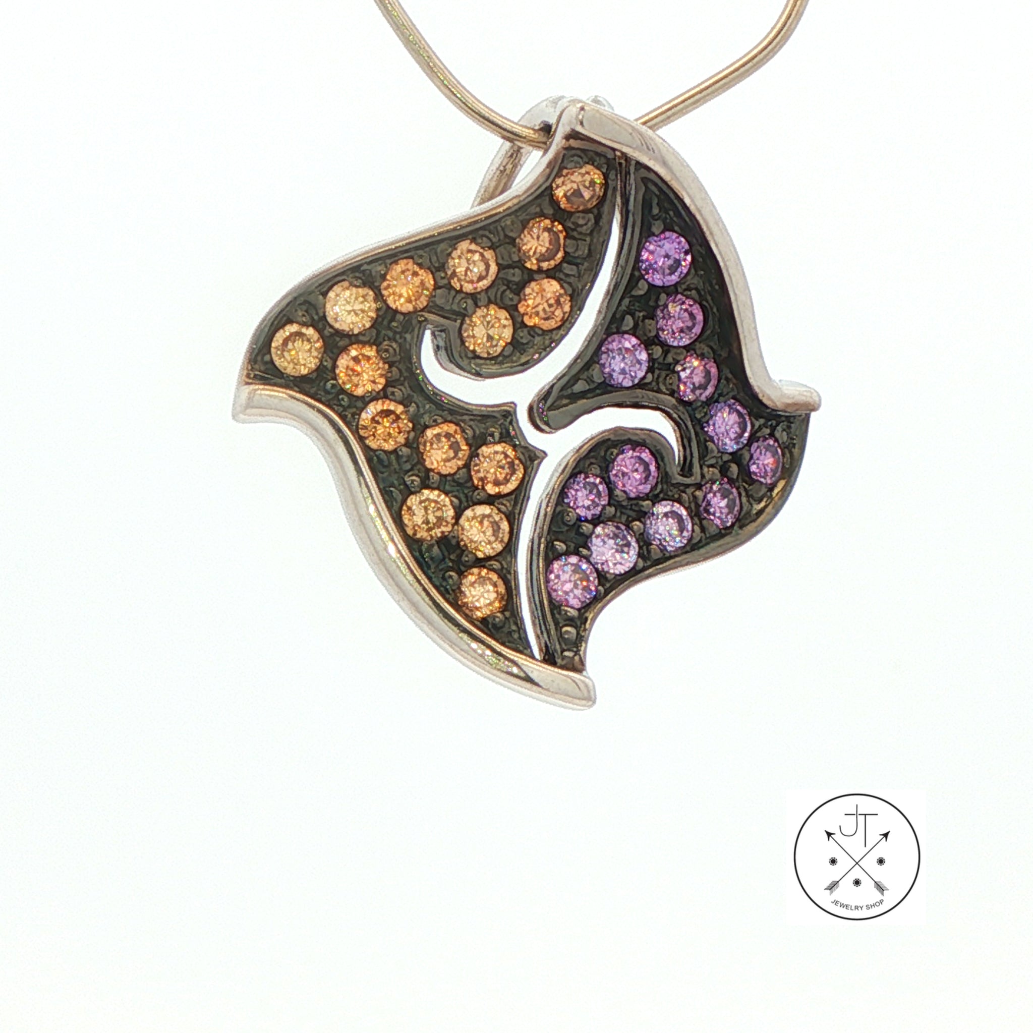Beautiful Sterling Silver pendant from LeVians' Carlo Viani Grand Sample (pre-production for jewelry conventions) collection showcasing a spread of 27 orange and purple gemstones set in a unique design. Elevate your jewelry collection with this stunning piece that embodies both elegance and artistry. Stamped 'CV925' on the back, this pendant measures approximately 19.5 mm tall and 19.8 mm wide, and features a hidden bale which can accommodate up to a 3 mm chain. This beautiful pendant is new, with its original wholesale tag dated 2003.
