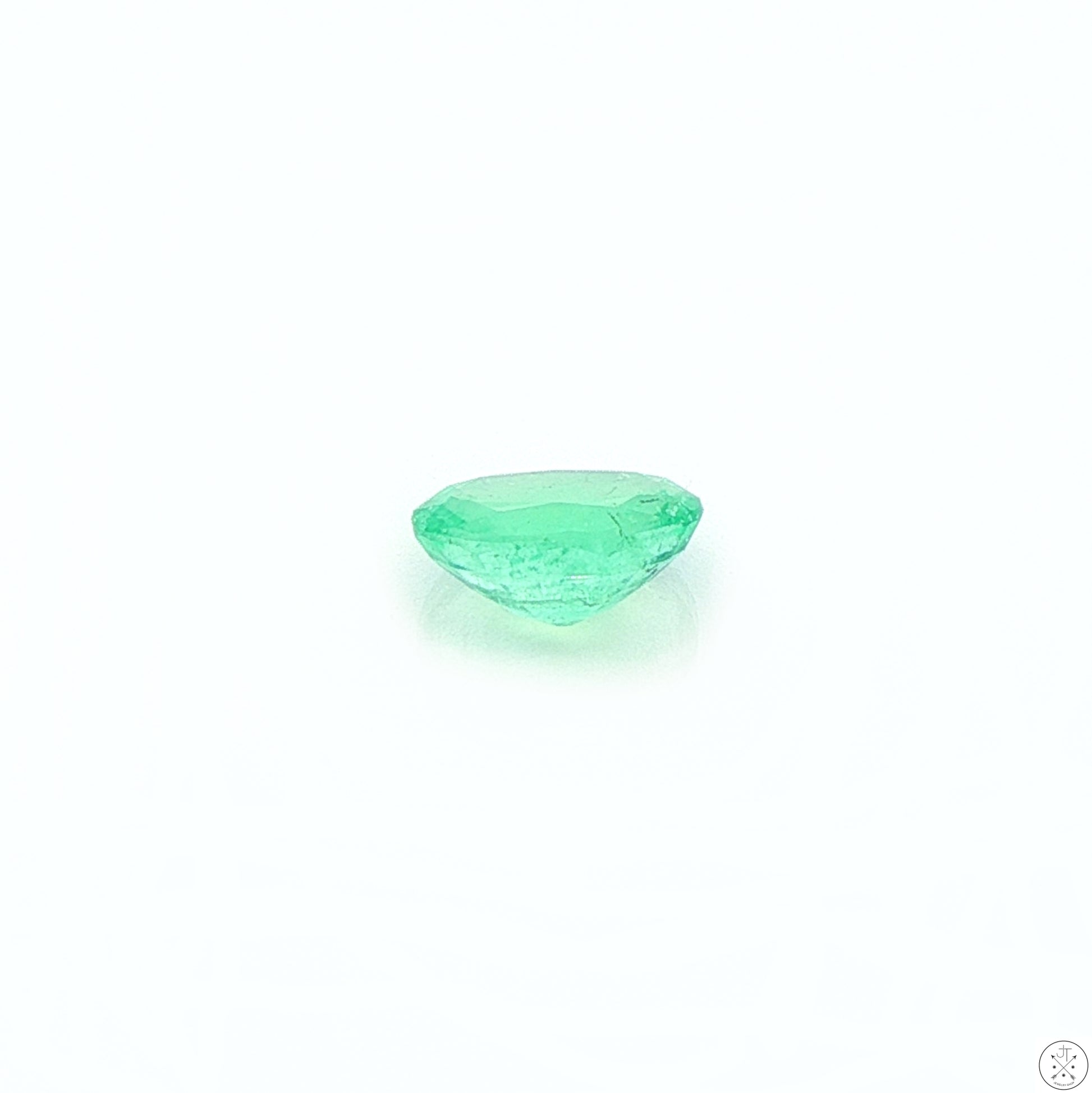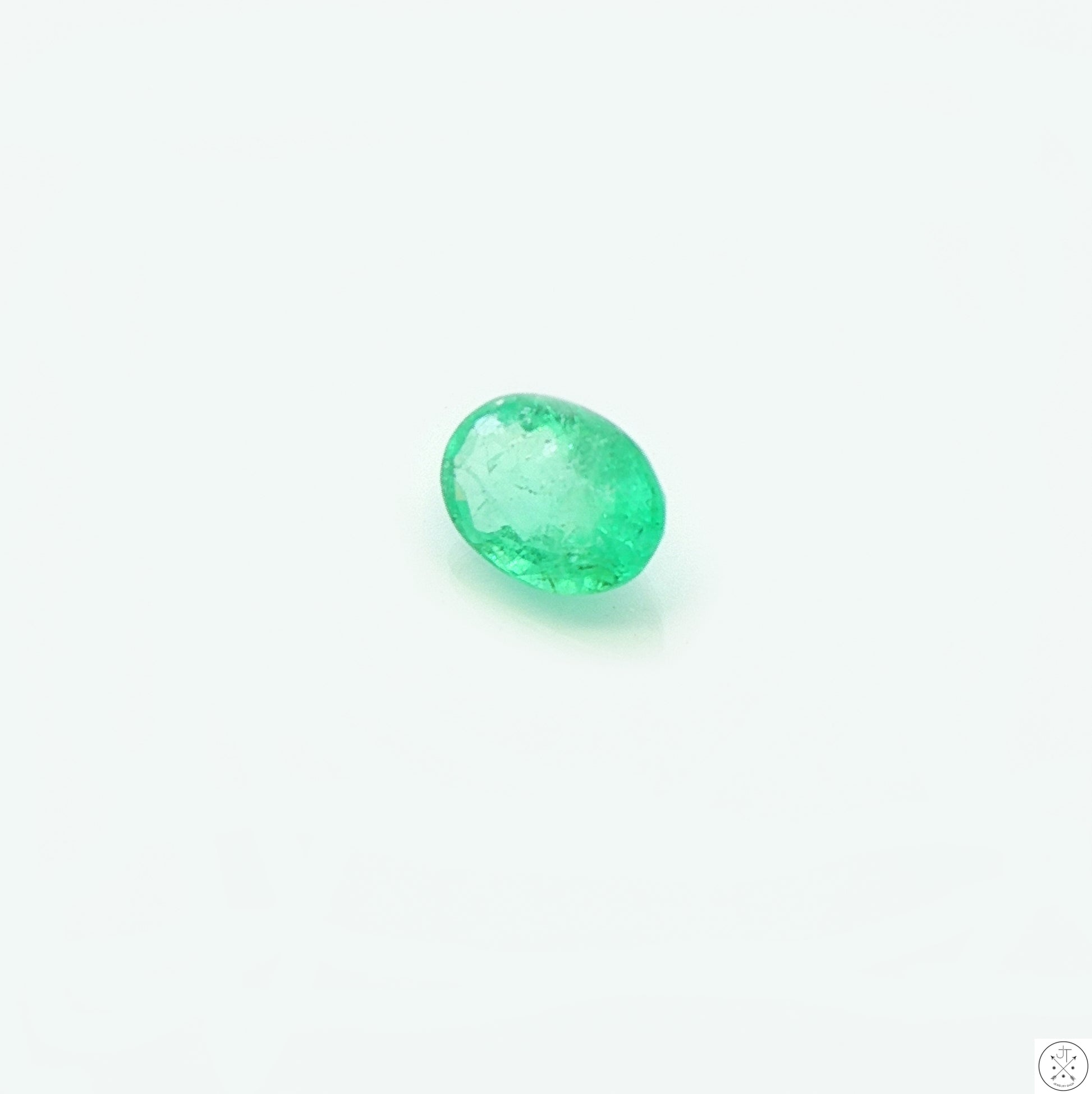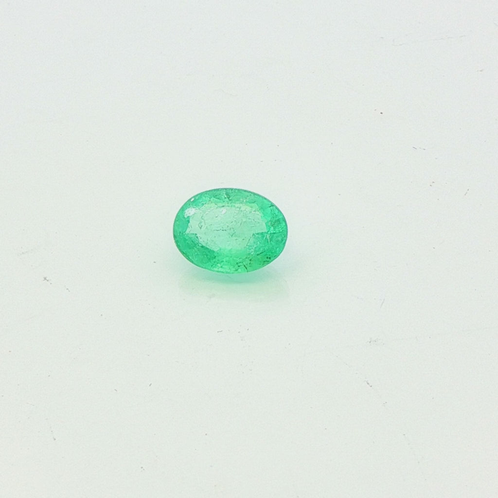 Gorgeous oval-faceted natural Emerald gemstone mined in Colombia, approximately 1.26 carats and 8.21 x 6.08 x 4.04 mm. This beautiful, light mint-green gemstone is moderately included. New and ships in a gem jar.