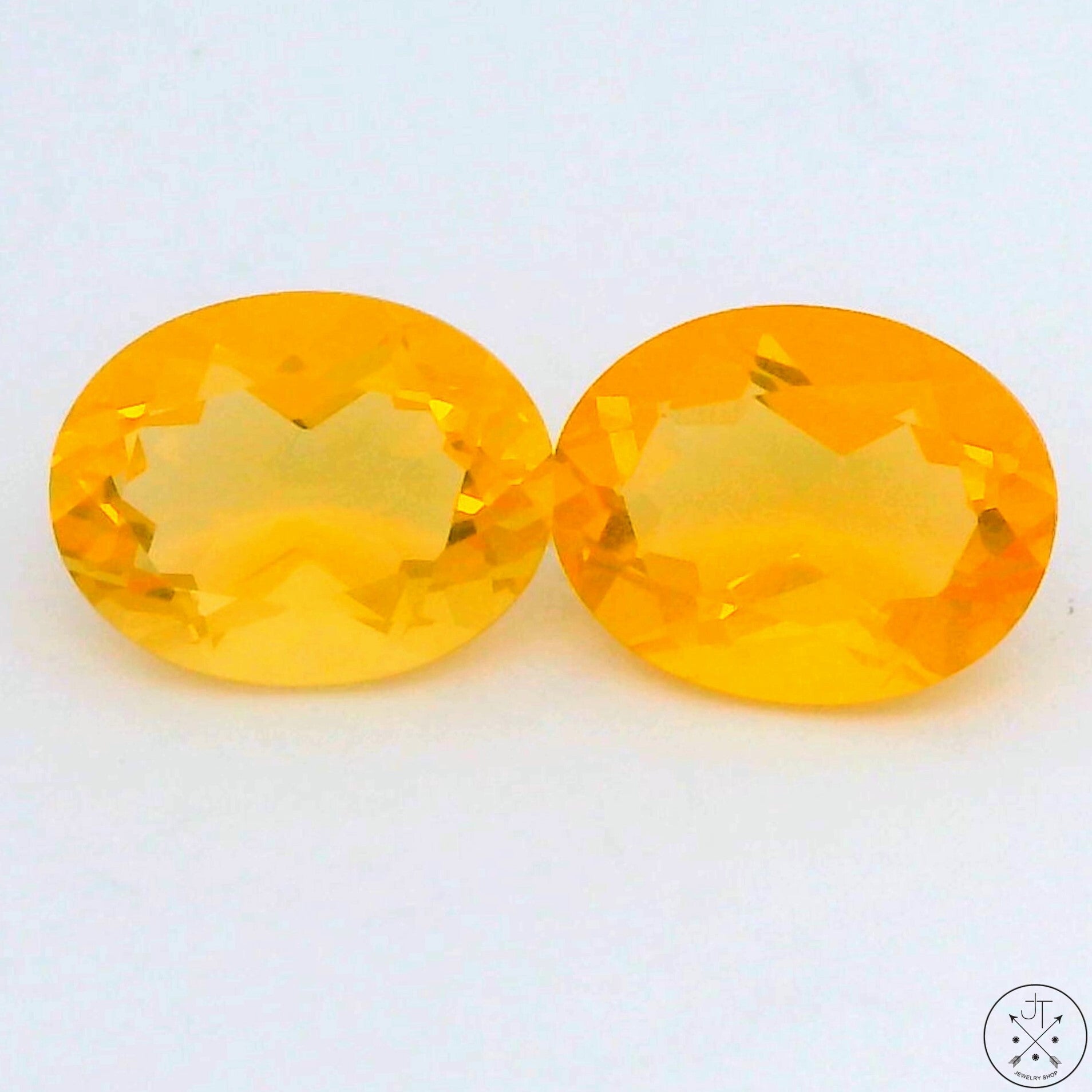Gorgeous pair of oval-faceted natural Fire Opal gemstones mined in Brazil, approximately 1.30 ctw, 9.05 x 7.08 x 4.53 and 8.95 x 7.01 x 4.72 mm. These beautiful eye-clean yellowish-orange gemstones are new and ship in a gem jar.