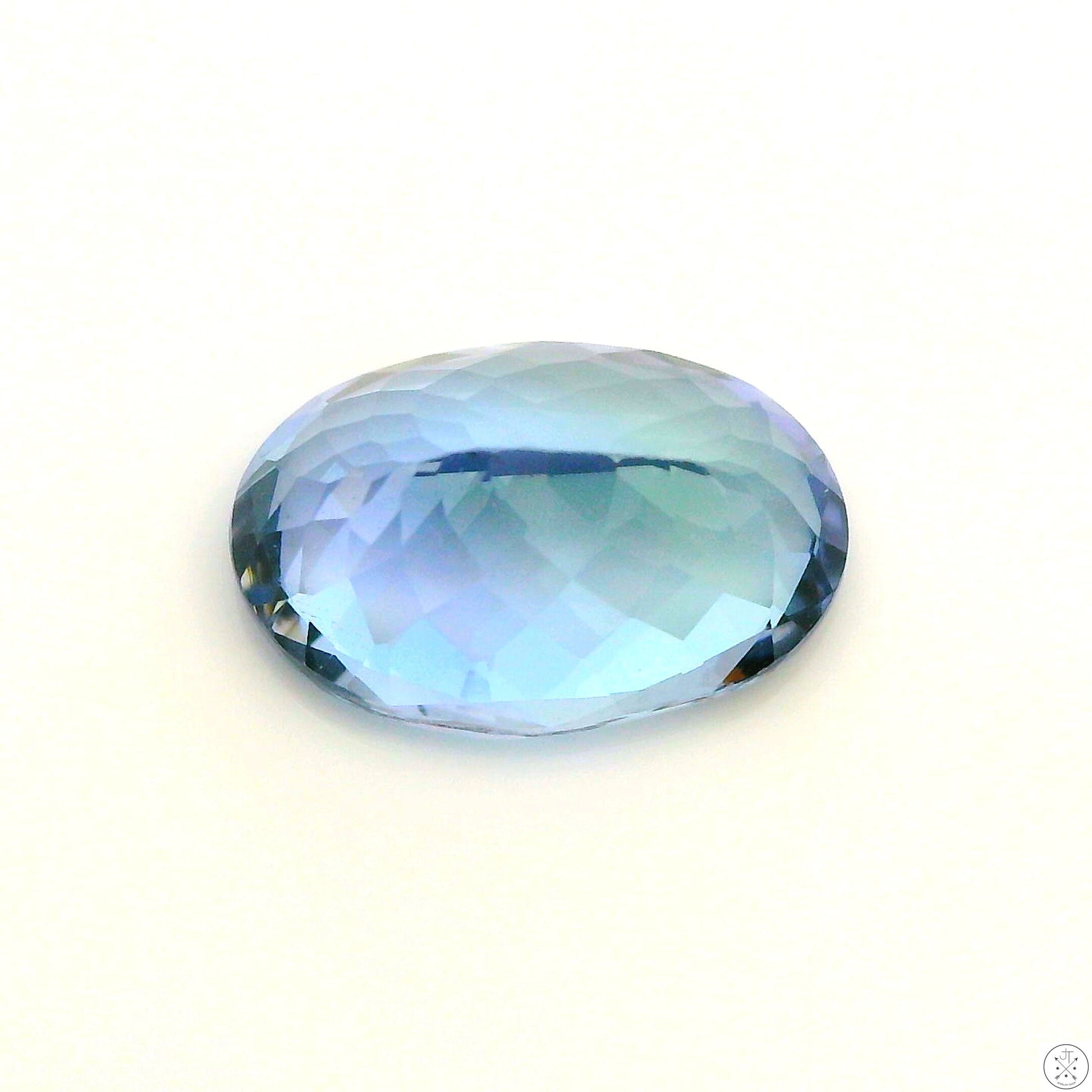 Gorgeous oval-faceted natural Tanzanite mined in Tanzania, approximately 1.59 Carats and 8.88 x 6.04 x 4.14 mm. This beautiful, slightly violetish-light blue gemstone has a light tone and slightly greyish saturation with medium color zoning, and is eye-clean. New and ships in a gem jar.