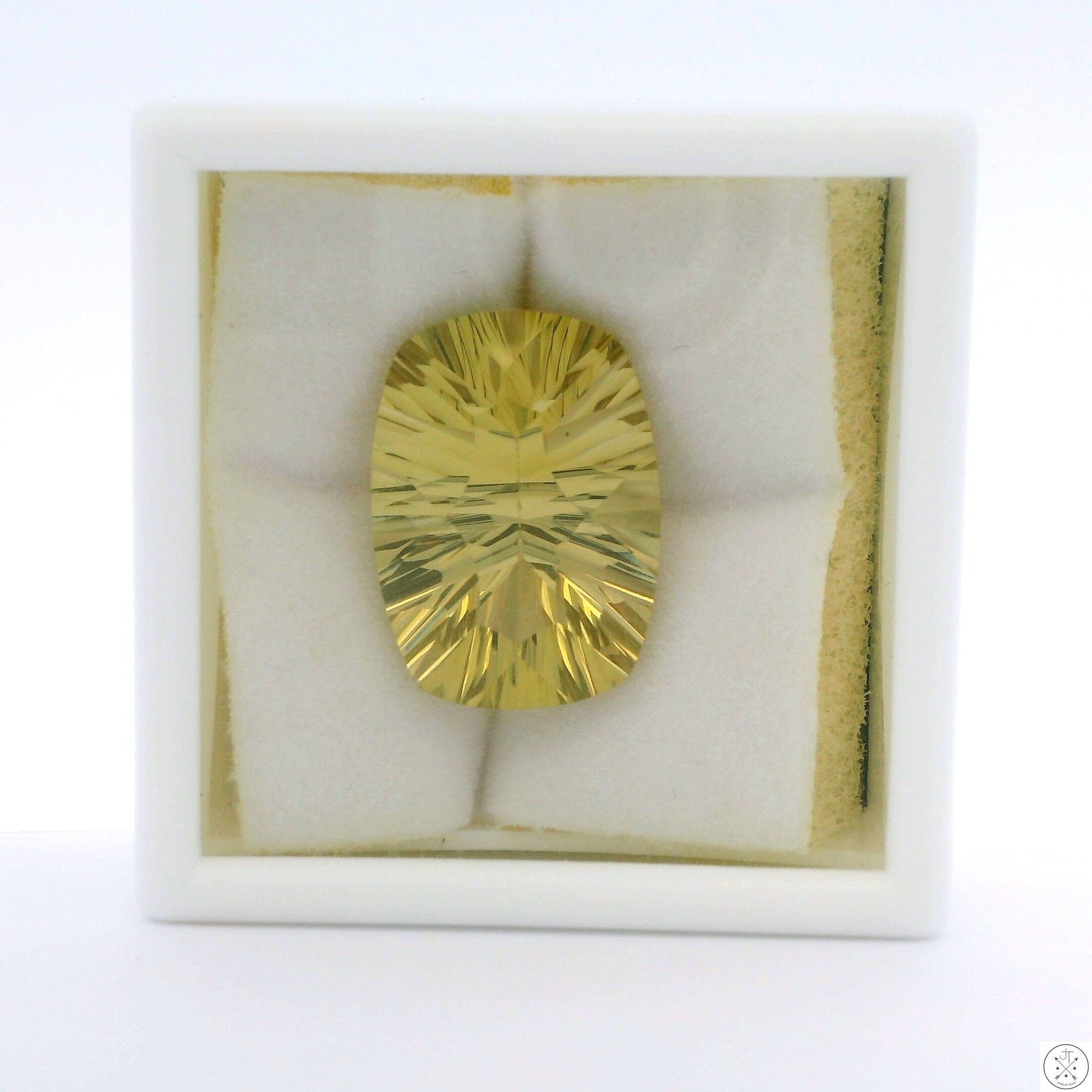 Gorgeous modified oval-faceted natural Lemon Quartz gemstone, approximately 11.67 Carats and 18.08 x 13.16 x 9.00 mm. New and ships in a gem jar.