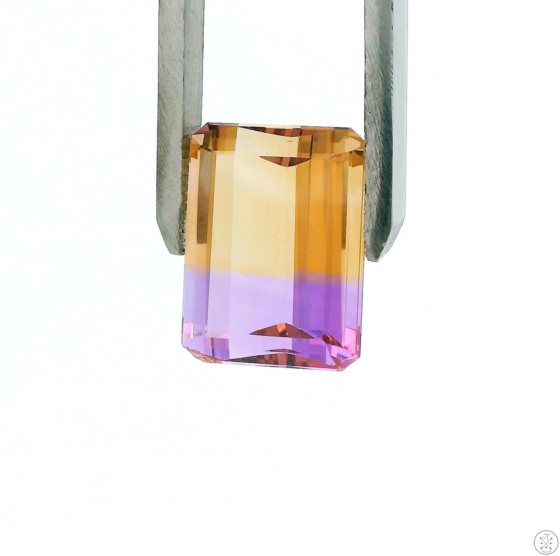Gorgeous emerald-cut natural Ametrine, approximately 11.75 carats and 15.86 x 12.08 x 7.85 mm. This beautiful gemstone displays a close to 70/30 split of mostly orange with purple color zoning, and is loupe clean. This gemstone is new and ships in a gem jar.