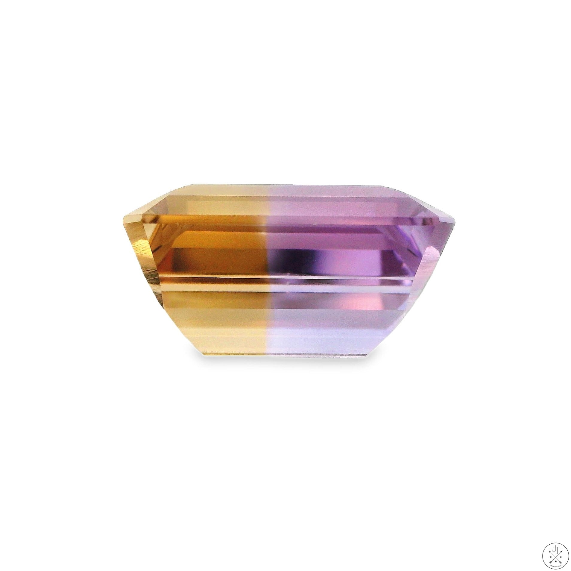 Gorgeous emerald-cut natural Ametrine gemstone, approximately 11.94 carats and 15.92 x 11.98 x 8.48 mm. This beautiful gemstone displays a close to 60/40 split of mostly light purple with light orange color zoning, and is loupe clean. This gemstone is new and ships in a gem jar.