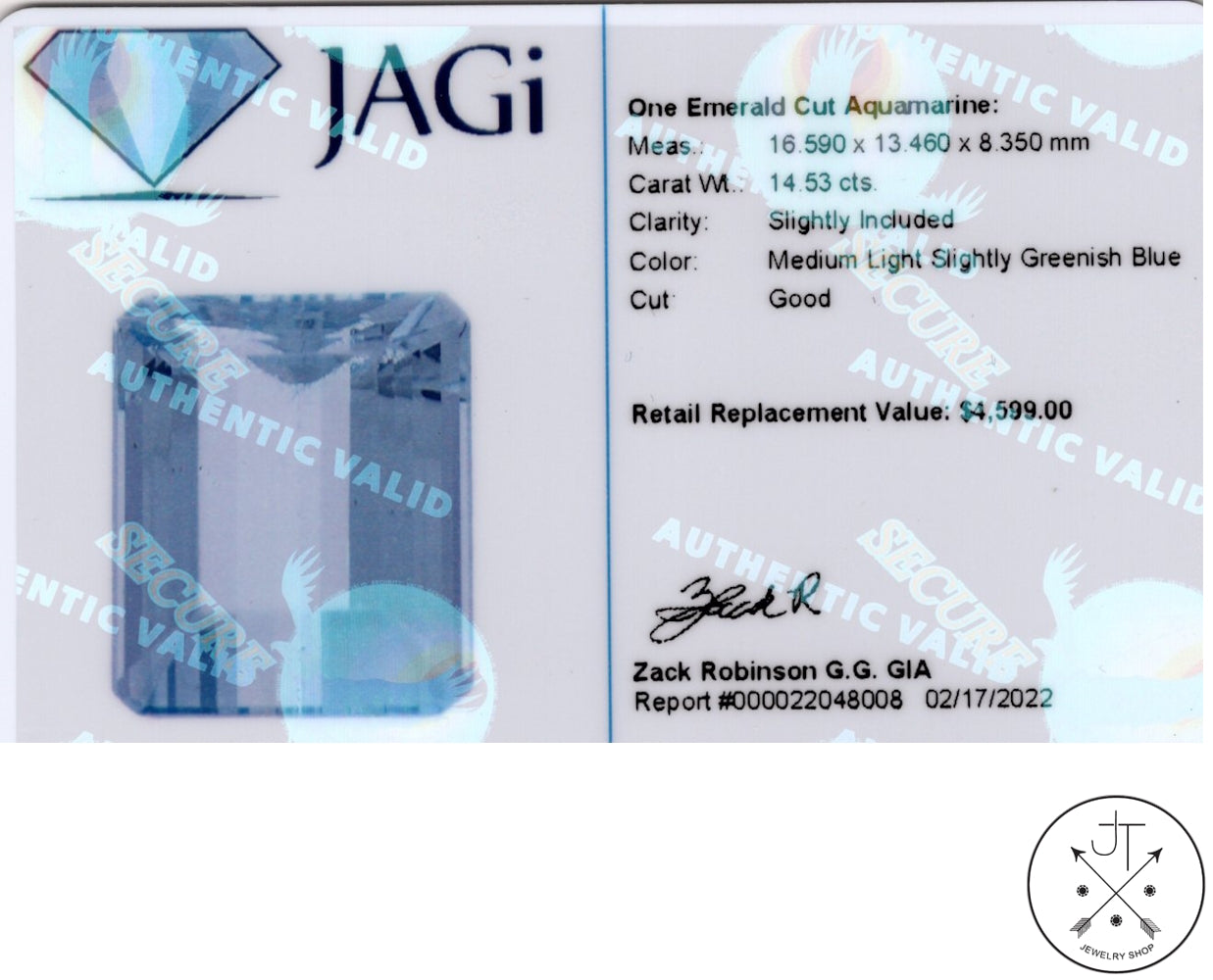 Stunning 14.53 carat emerald-cut natural Aquamarine gemstone measuring 16.59 x 13.46 x 8.35 mm. This slightly included gemstone is medium-light, slightly greenish-blue in color, and is best suited as a display specimen or set in a pendant. Includes an independent Retail Replacement Value card ($4,599) dated 2022 and a unique double-box display.
