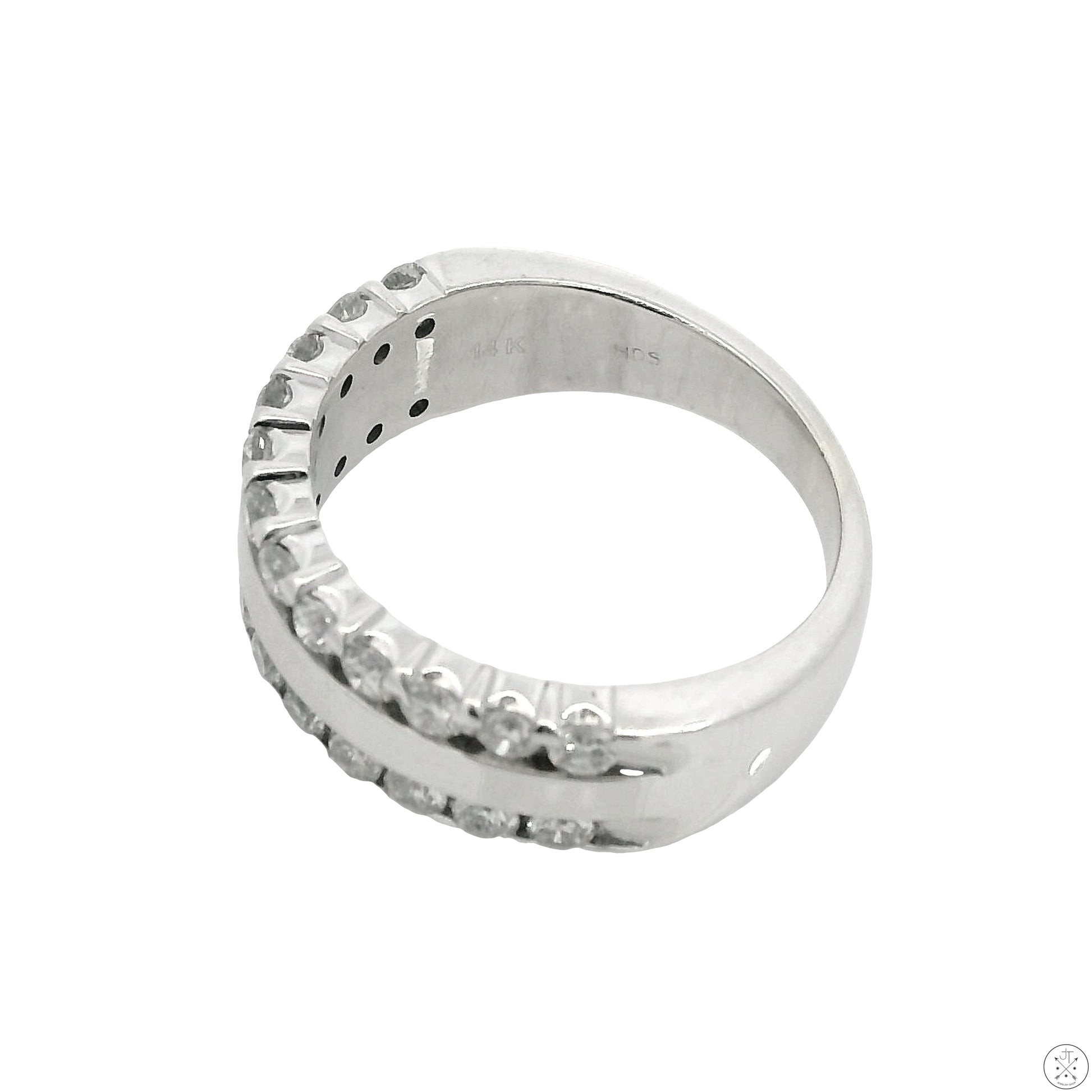 Exquisite eternity-style band crafted in lustrous 14k White Gold, showcasing a half-circle of 24 brilliant-cut natural Diamonds. This elegant piece symbolizes everlasting love and commitment, offering timeless beauty and sophisticated sparkle. Perfect for anniversaries, or as a luxurious everyday accessory. The top of the band is approximately 6.5 mm at its widest, tapering to 3.2 mm at the bottom for comfortable wear. The approximately .79 ctw of natural Diamonds average approximately I-color and SI2-clarity, and appear bright white and eye-clean in person without magnification. Stamped 'HDS' and laser-inscribed with a maker's mark and '14k', this wonderful size 6.5 pre-owned stackable band weighs approximately 6.42 grams and is in excellent condition.