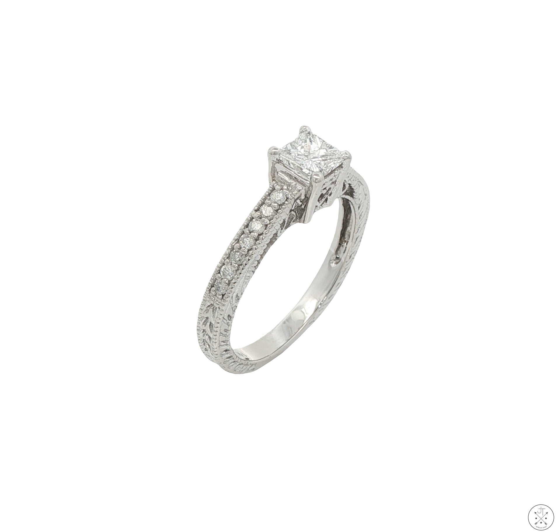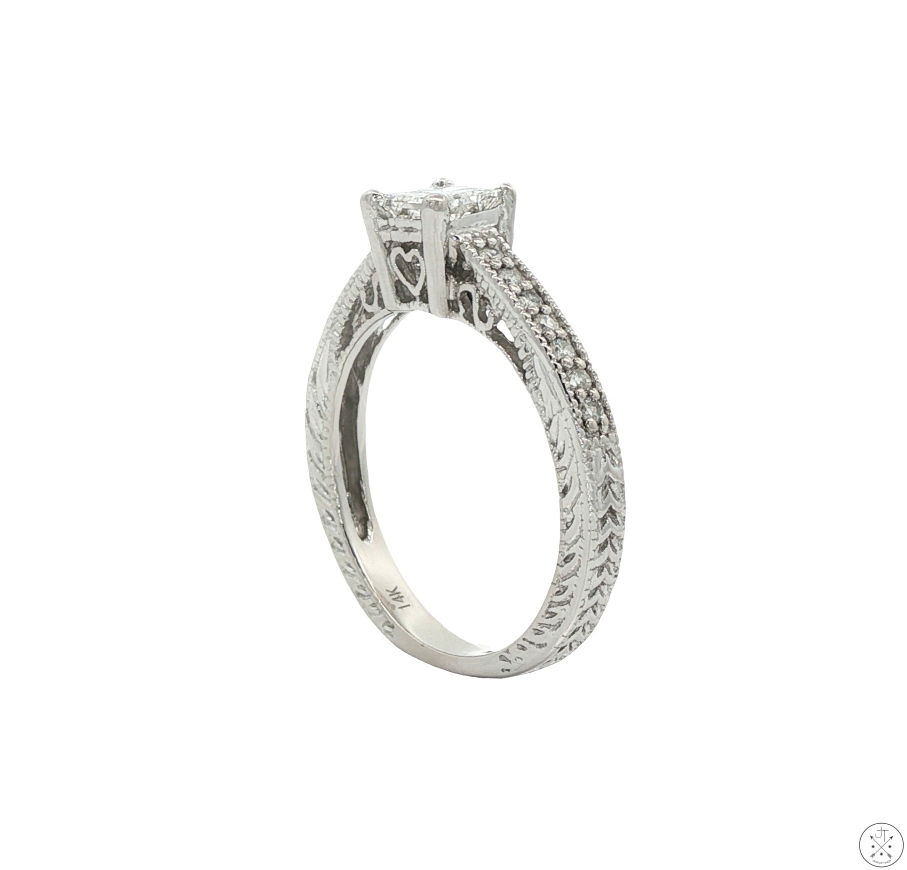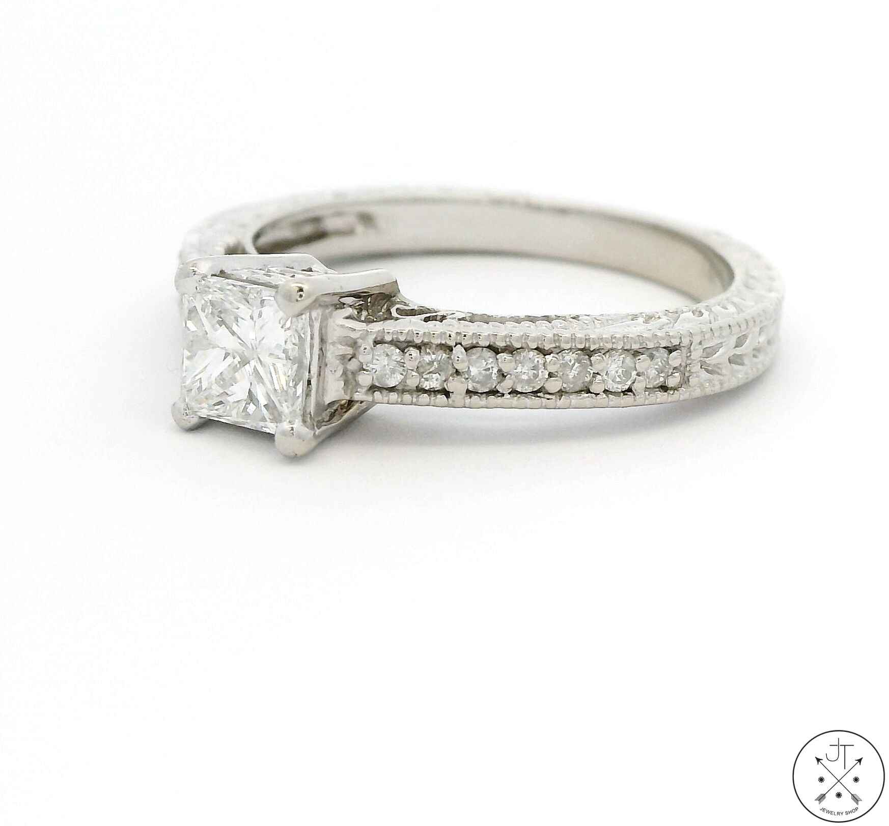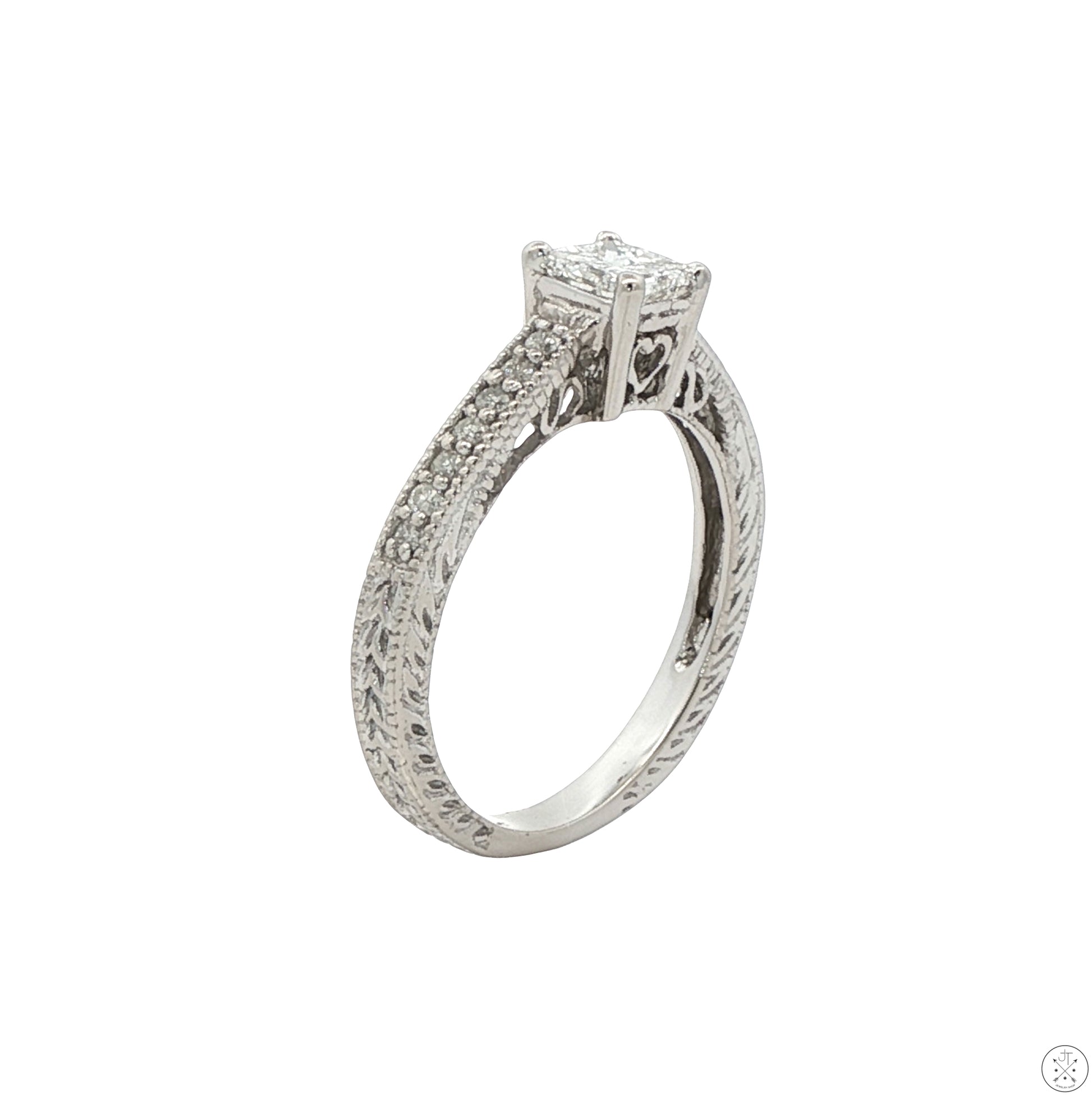 Sparkling solid 14k White Gold vintage style Engagement ring with an approximately .55 carat J-color and SI2-clarity Princess cut natural Diamond accented by 14 round faceted natural Diamonds running down the band. The top of the ring is 5.7 mm wide, tapering down to 2.4 mm at the bottom of the artfully designed Deco band for comfortable wear. Stamped '14k', this classy size 6.25 ring weighs approximately 3.34 grams and is in excellent condition.