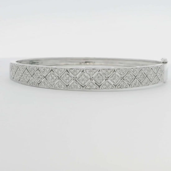 This gorgeous bracelet is a must-have for any jewelry lover. The solid 14k White Gold is beautifully highlighted by the 1 ctw of round-cut natural Diamonds, which average approximately G-color and VS2-clarity. The Diamonds sparkle like stars, and the bracelet's elegant design is sure to turn heads. The top of the bracelet is 7.6 mm at its widest and gently tapers to 4.6 mm at the bottom. The inside of the triple-secured slide lock clasp is stamped with a maker's mark and '14k'. This beautiful bracelet measures approximately 59 mm (2.3 in) wide and 53 mm (2 in) tall inside, creating an inner circumference of 176 mm (7 in), Ladies size Large/XL or Men's size Small/Med. The bracelet weighs approximately 19.00 grams and is in excellent pre-owned condition.
