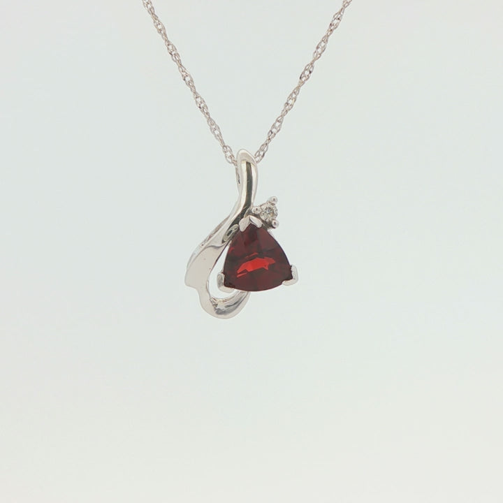 This beautiful pendant necklace makes a stunning addition to any occasion. The deep red 7 mm checkerboard trillion-cut natural Garnet sits below a single round-faceted natural Diamond with a sweeping design that creates a timeless elegance. Stamped with a maker's mark and '14k', the 18-inch-long 1 mm cable chain is secured with a spring ring closure. The pendant is stamped with a maker's mark and '14k' on the back of the bale, which can accommodate up to a 2.8 mm chain. This beautiful pre-owned necklace weighs approximately 2.42 grams and is in excellent condition.
