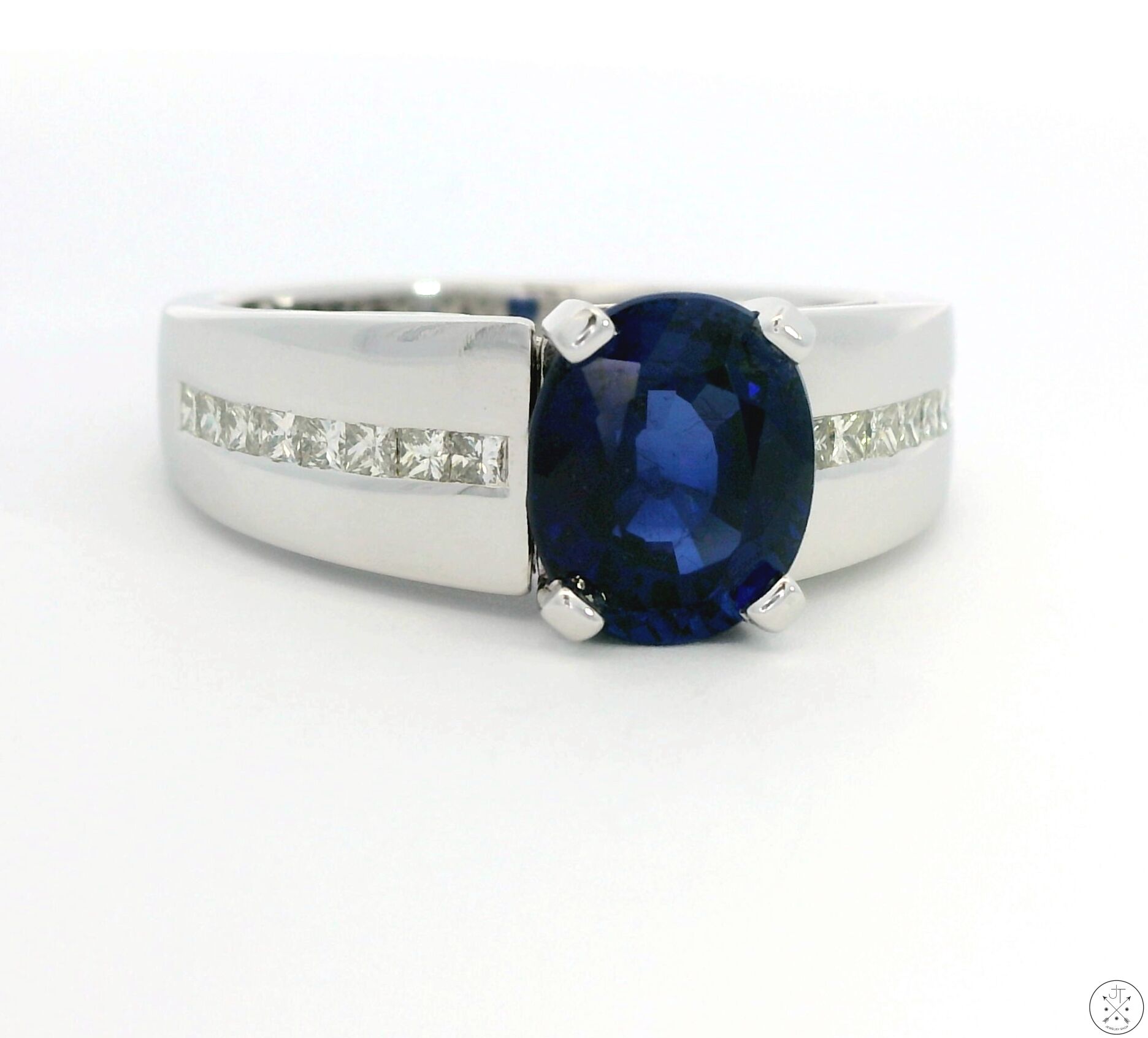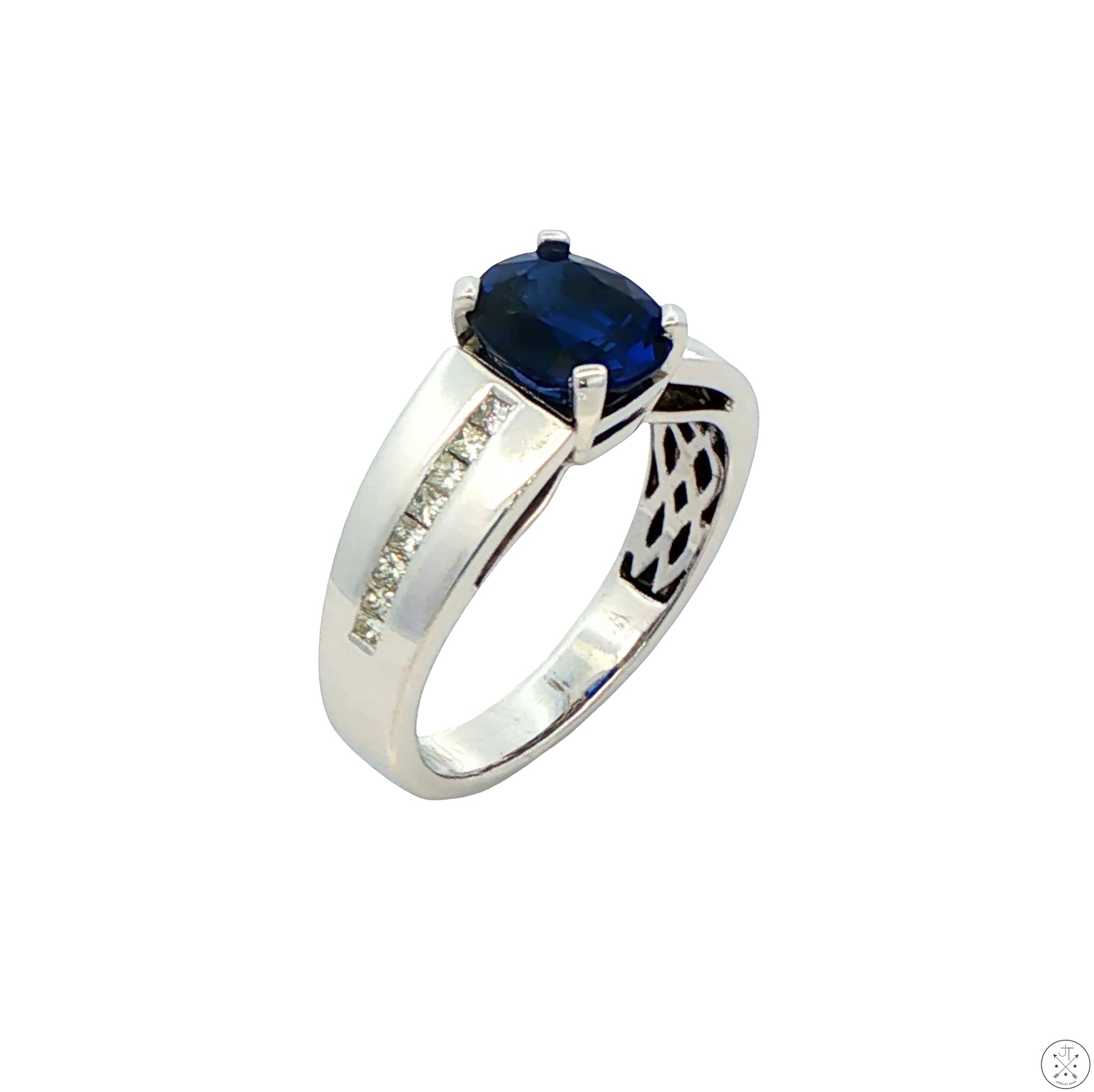 Gorgeous solid 14k White Gold ring with a beautiful blue 3.45 carat oval-faceted lab-created Sapphire flanked by .38 ctw of sparkling channel-set Princess-cut natural Diamonds averaging approximately H-color and VS2-clarity. Stamped '14k' and with a barely visible maker's mark, this stunning size 10.75 ring weighs approximately 7.74 grams and is in excellent condition.