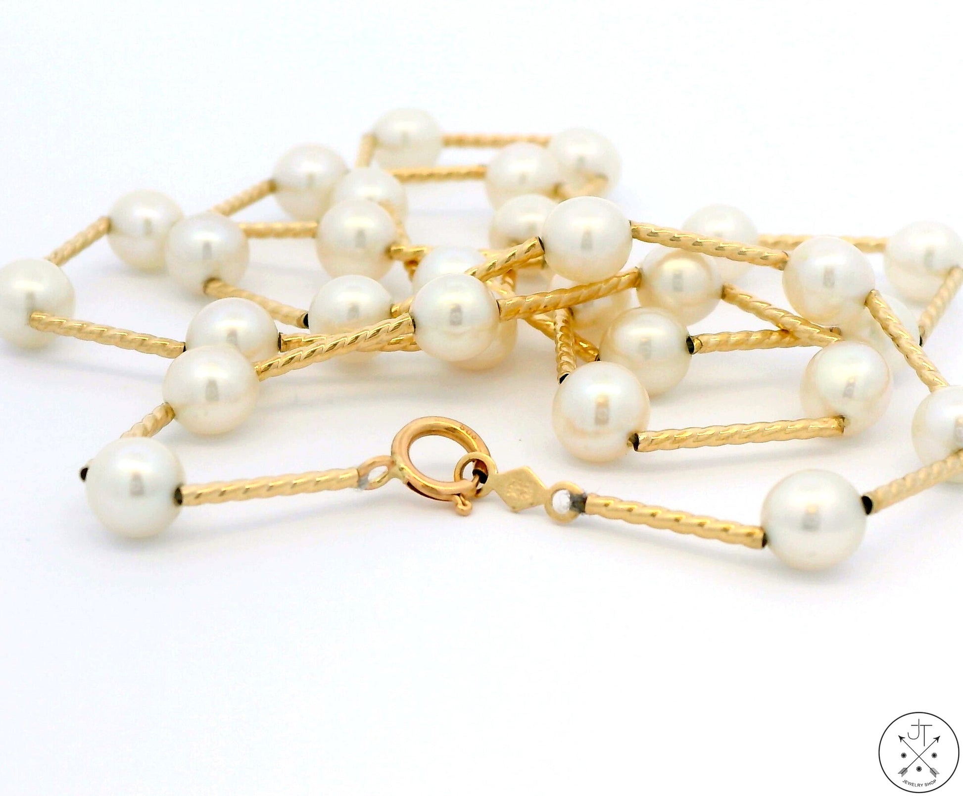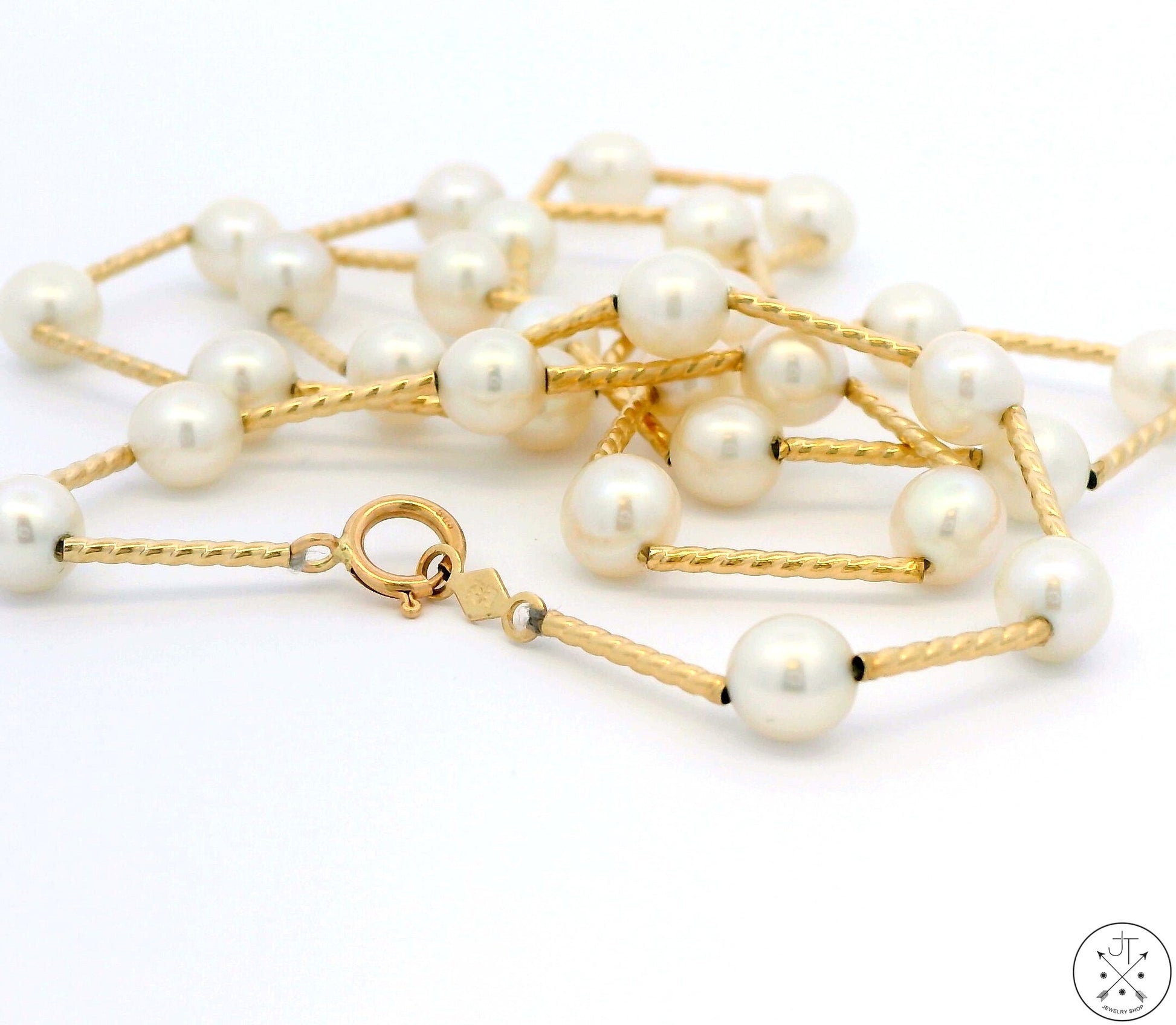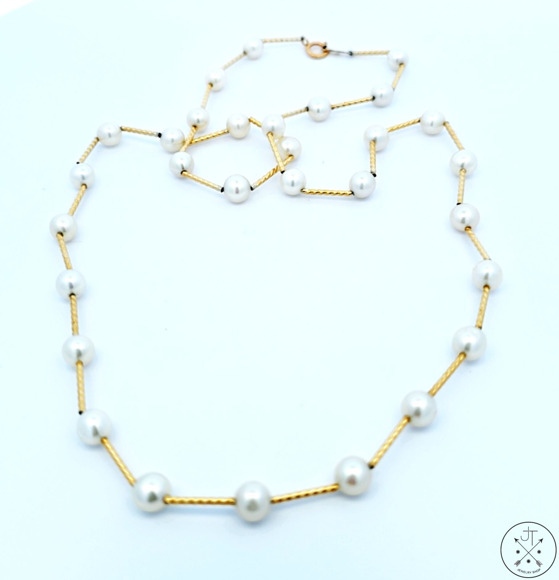 This stunning 18 inch long necklace features a beautiful combination of lustrous pearls and delicate gold accents. Perfect for adding a touch of elegance to any outfit, it’s an ideal accessory for both casual and formal occasions. The timeless design ensures that it will remain a cherished piece in your jewelry collection. Stamped '585' and '14k' on the spring ring clasp and end piece, this wonderful necklace weighs approximately 7.13 grams and is in very good condition. The 30 cultured Pearls range from approximately 4.9 - 5.3 mm in diameter between the approximately 9.5 mm long 14k Gold twisted-tube beads.