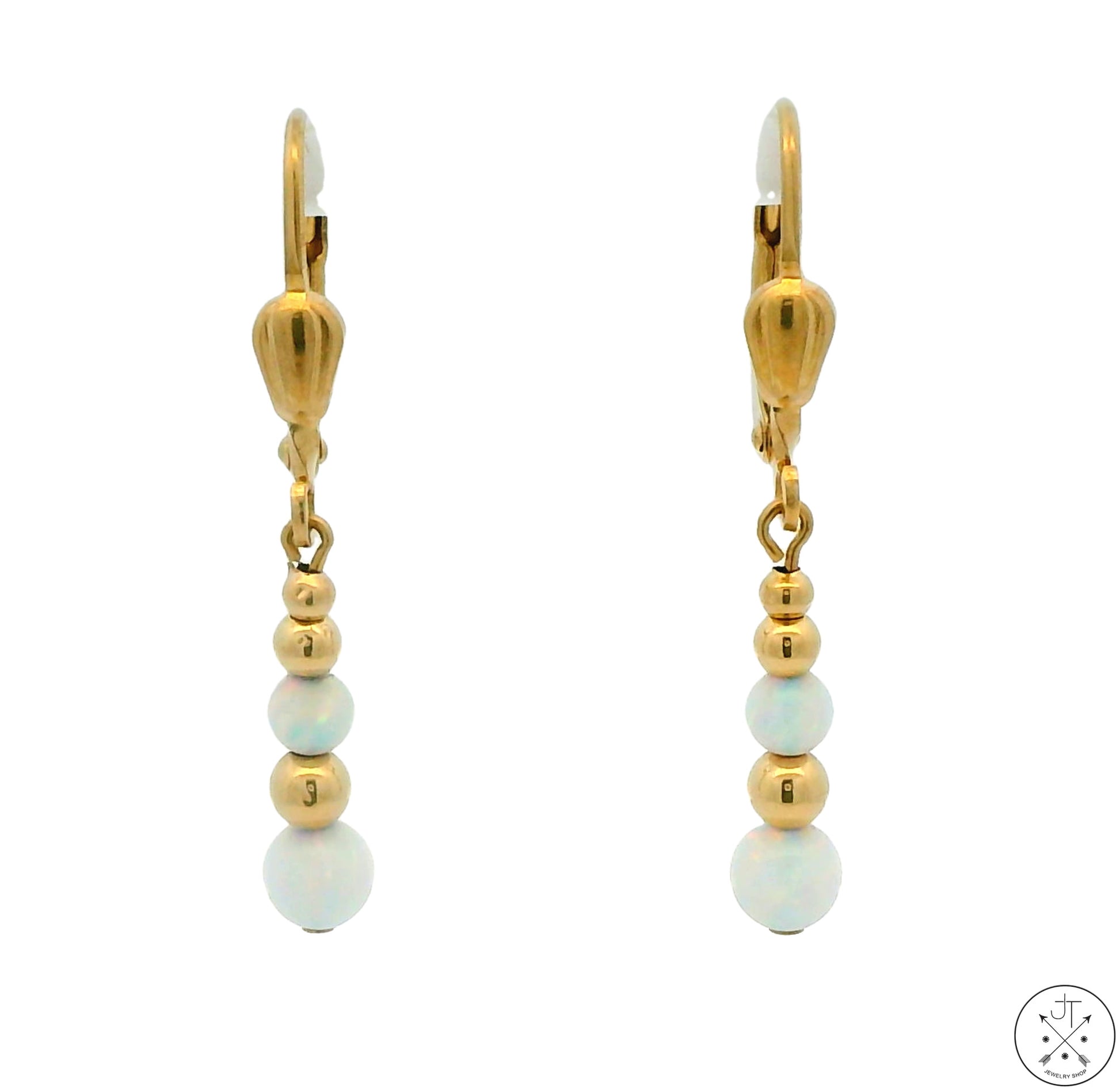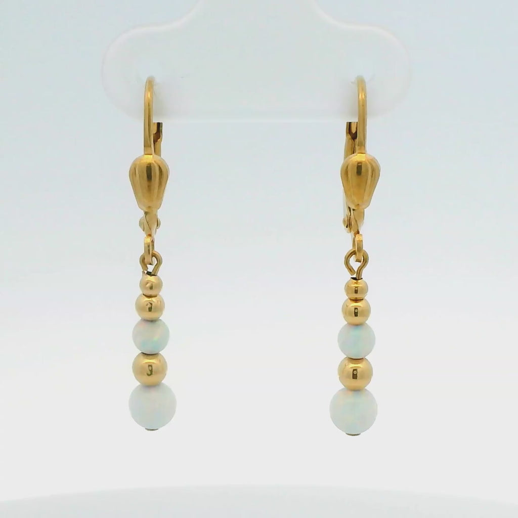Beautiful 30 mm solid 14k Yellow Gold dangle earrings with Gold and created Opal beads, the largest at the bottom is 4 mm in diameter. Stamped '14k' and 'CU' on the secure leverbacks, these wonderful earrings were made in the mid-1990s and are in very good condition.