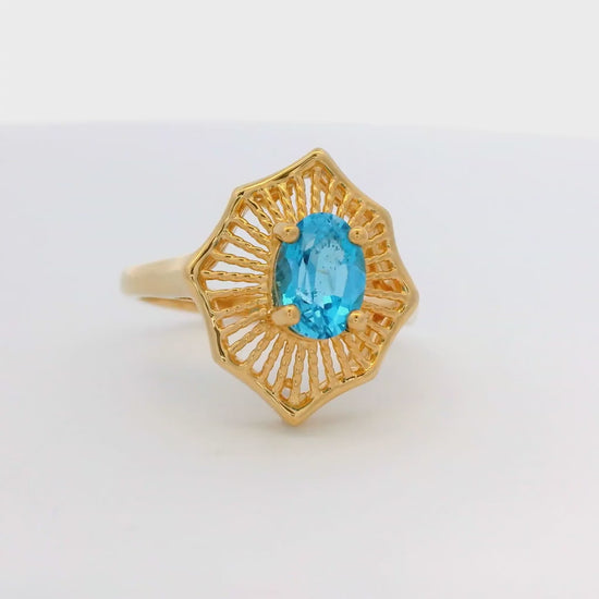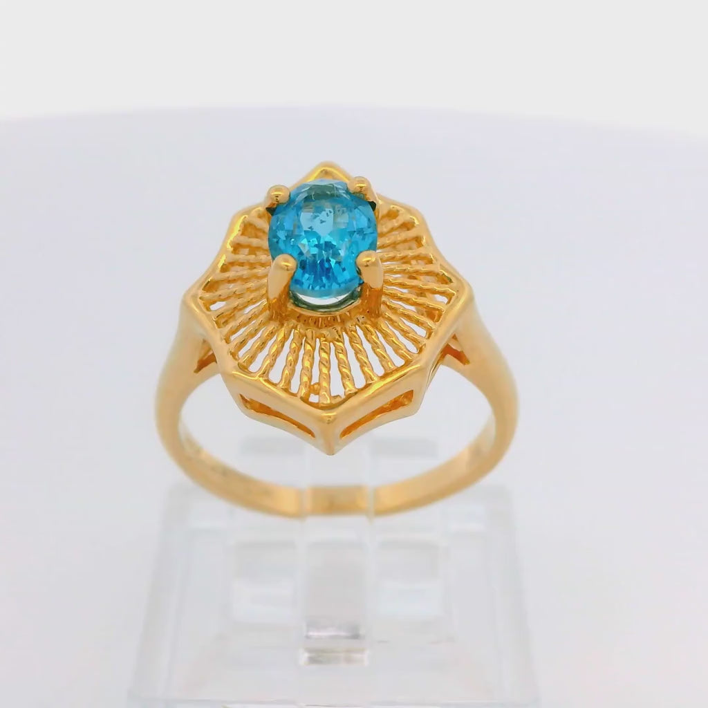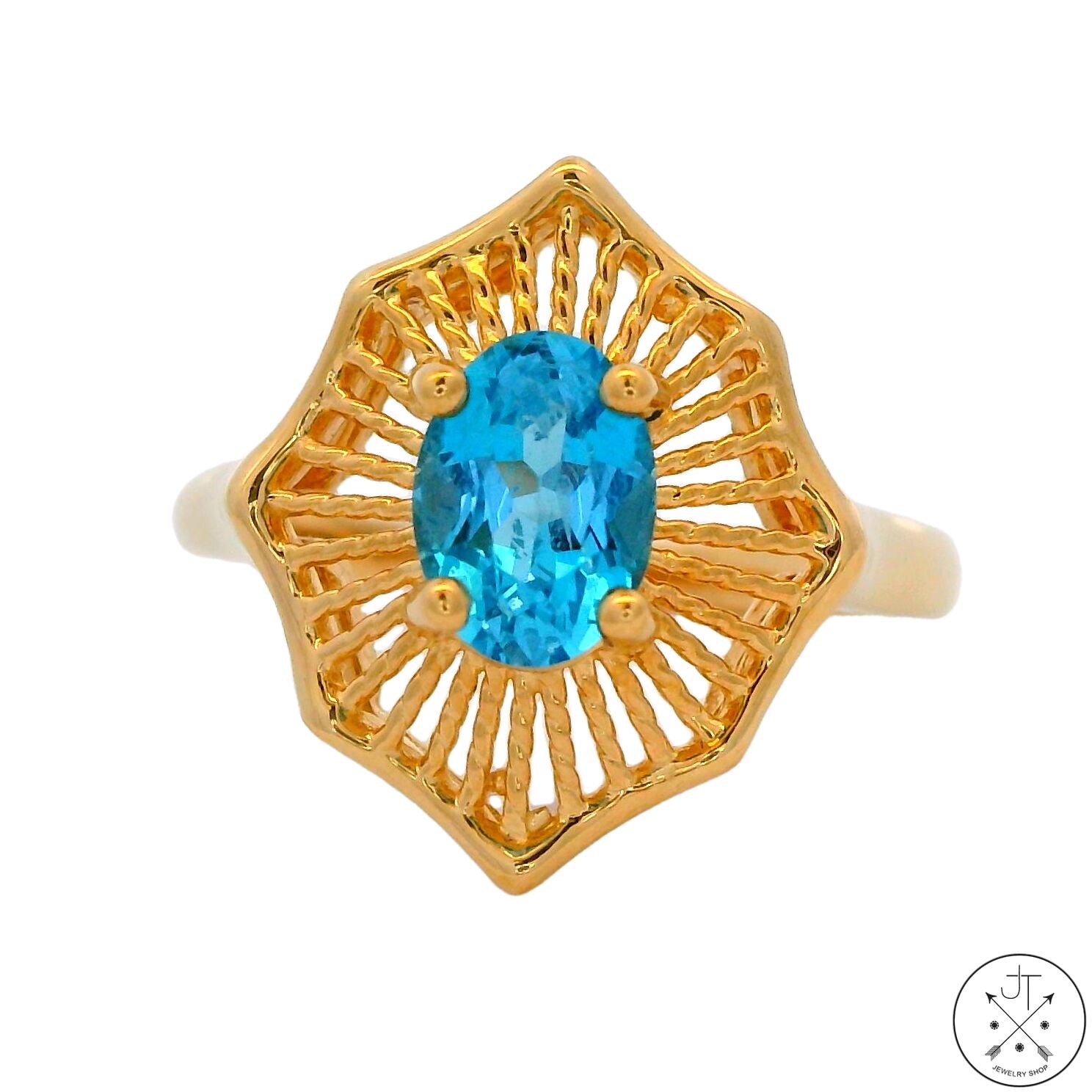 Gorgeous vintage solid 14k Yellow Gold ring with a beautiful 7 mm x 5 mm (approximately 1.10 carat) oval-faceted blue natural Topaz gemstone. The top of the ring measures approximately 16 mm x 14 mm and rises 8 mm above the finger. Stamped with a maker's mark and '14k', this wonderful, circa-1990s, size 6.25 ring weighs approximately 3.71 grams and is in excellent condition.