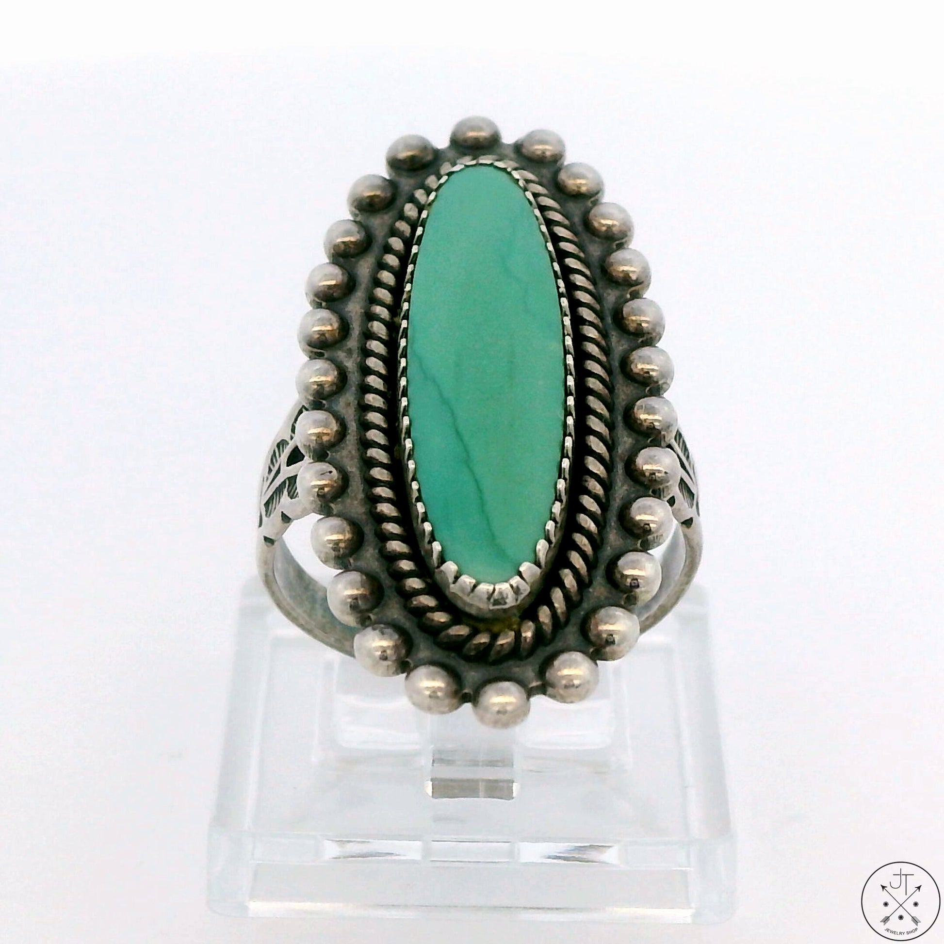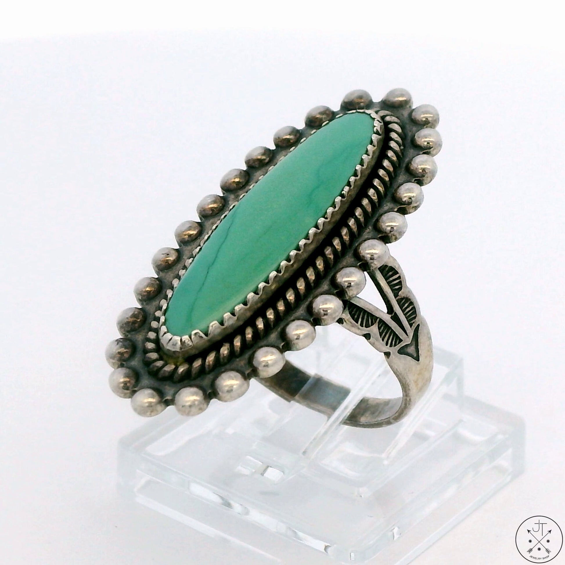 This exquisite vintage ring features a beautiful pale green natural Turquoise cabochon, bezel set in a beautifully crafted Sterling Silver mounting. Stamped with a maker's mark and 'sterling'. This ring is not Native American-made - the maker's mark is from the Pacific Jewelry Company, a manufacturing company in Santa Monica, California, active in the 1930s and 40s that mass-produced Native American-style jewelry. This ring is very cool nonetheless, and for being nearly a century old, it is in excellent condition. The top of the ring is 31.5 mm at its longest, tapering to 2.7 mm at the bottom of the band. The ring displays a dark patina typical of its age and has been cleaned but not polished.