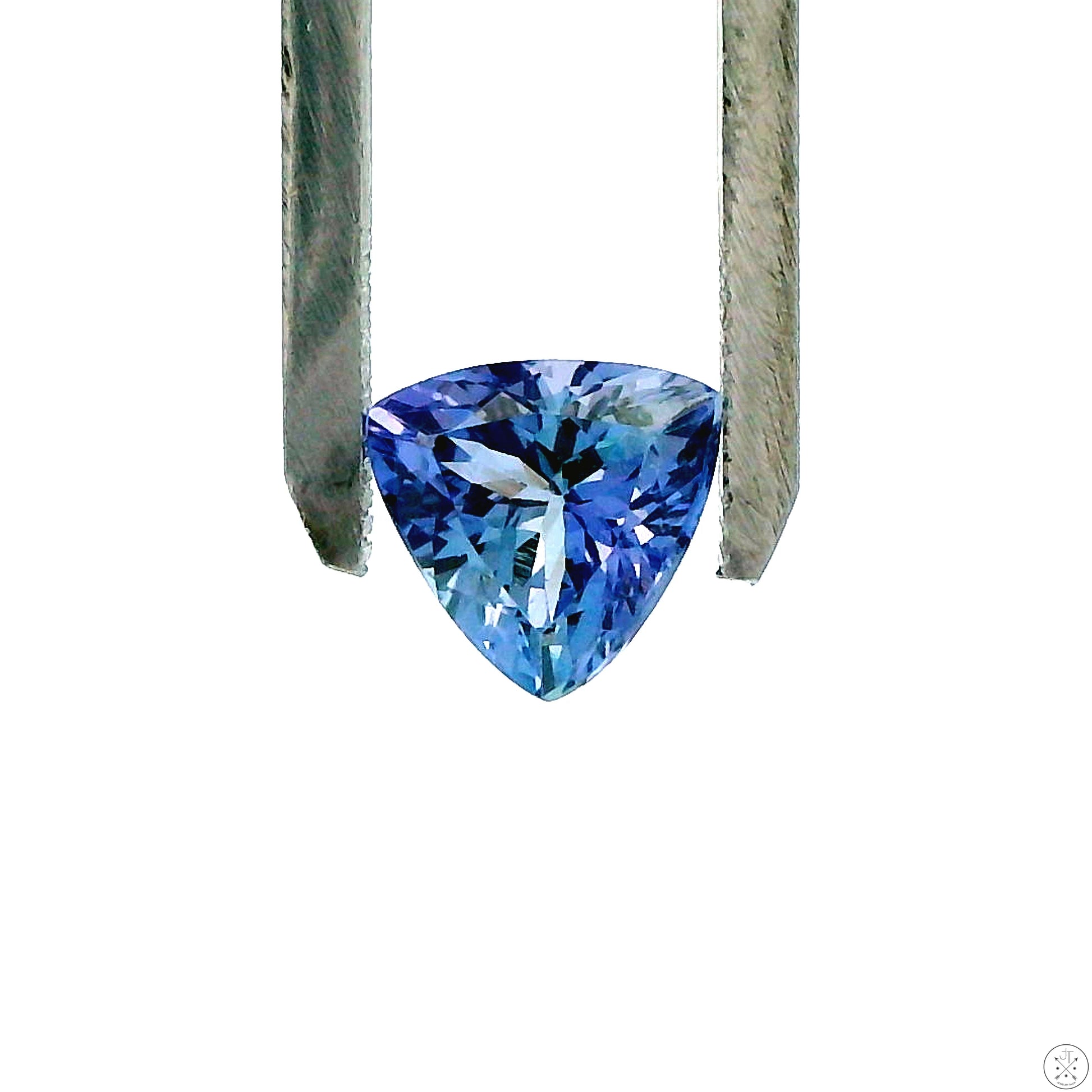 Gorgeous trillion-faceted natural Tanzanite mined in Tanzania, approximately 2.24 Carats and 12.84 x 8.71 x 5.53 mm. This beautiful violetish-light blue gemstone has a light tone and slightly grey saturation, with medium-strong color zoning, and is eye-clean. New and ships in a gem jar.
