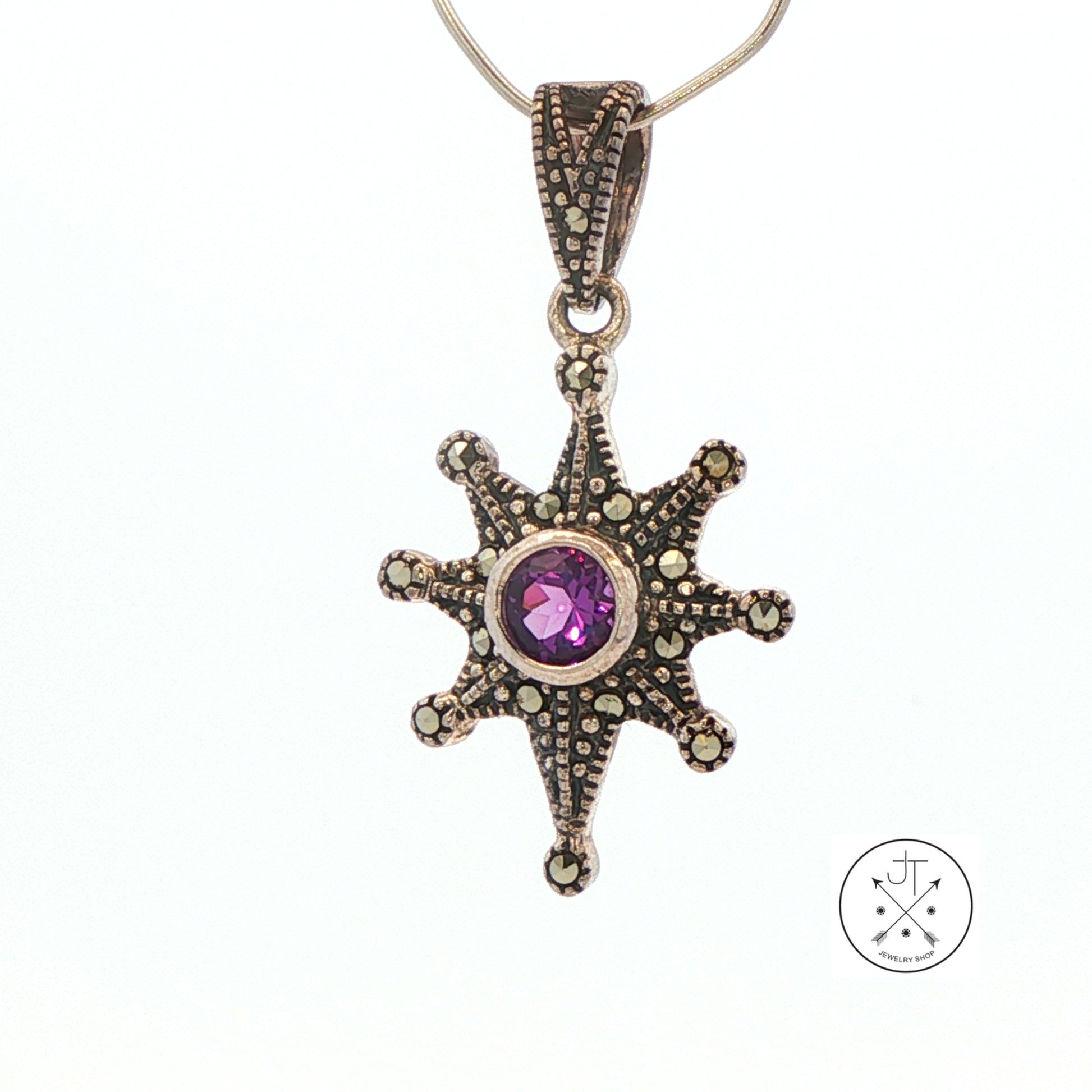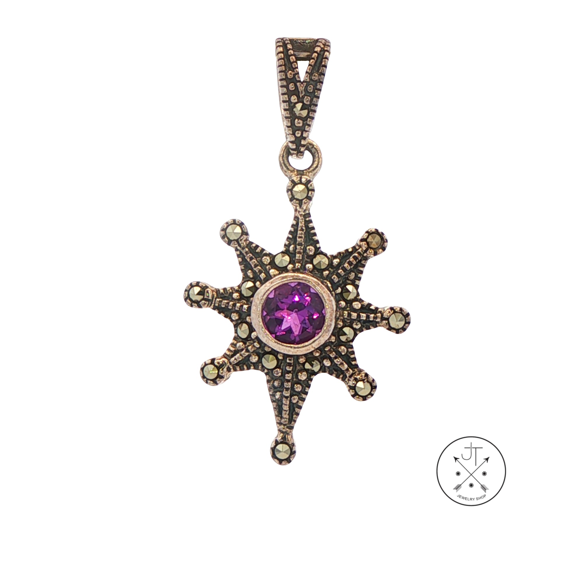 Beautiful Sterling Silver pendant from LeVians' Grand Sample (pre-production for jewelry conventions) collection showcasing a bezel-set 5 mm round-faceted natural Amethyst surrounded by a spread of Marcasite gemstones set in a unique star design. Elevate your jewelry collection with this stunning piece that embodies both elegance and artistry. Stamped '925', this pendant measures approximately 33.2 x 18 mm including the bale, which can accommodate up to a 4.5 mm chain. This beautiful pendant is new, with its original wholesale tag dated 2001.