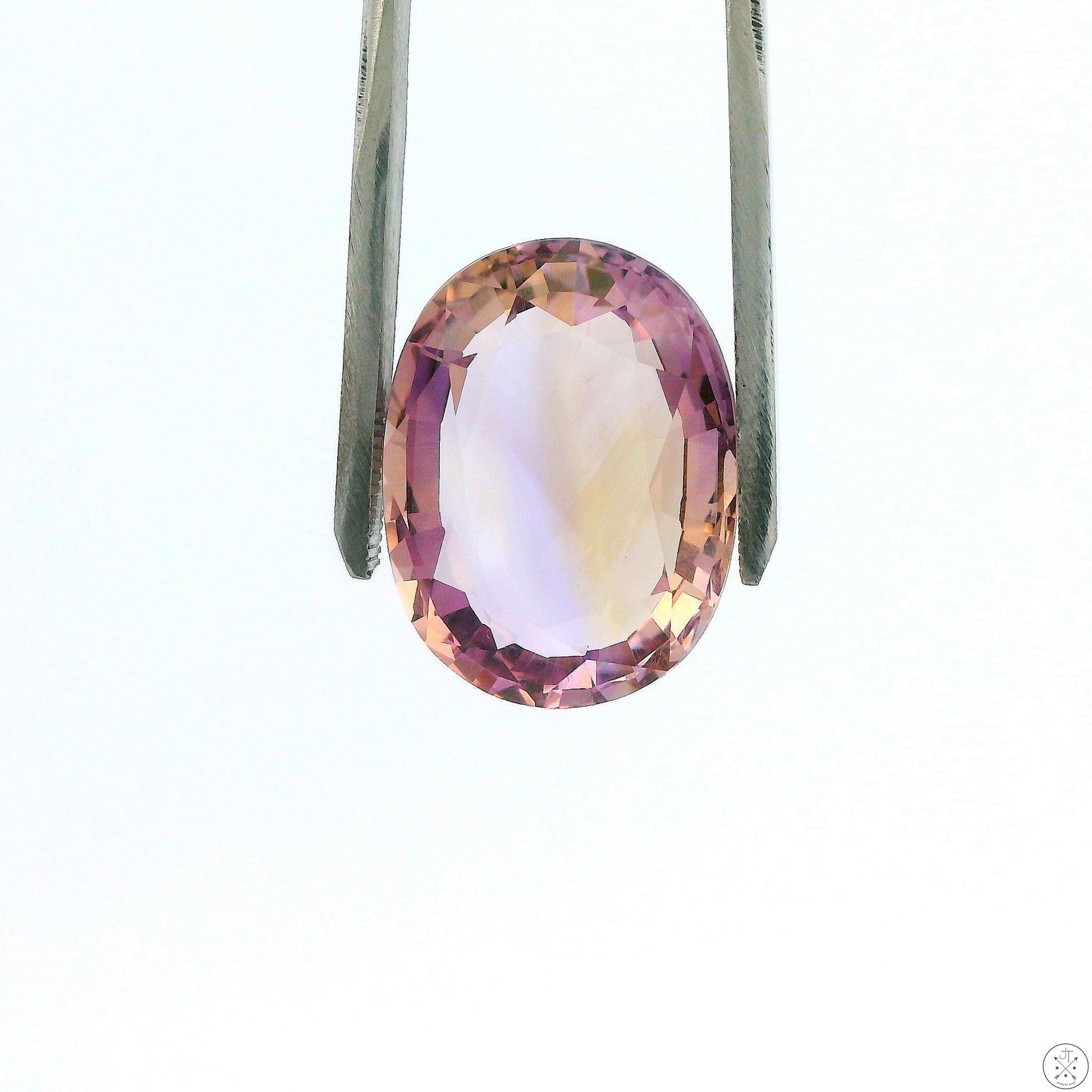 Gorgeous oval-faceted natural Ametrine gemstone, approximately 26.72 carats and 23.47 x 17.73 x 10.04 mm. This beautiful gemstone displays light mauve, purple, and light orange color zoning, and is loupe clean. This gemstone is new and ships in a gem jar.