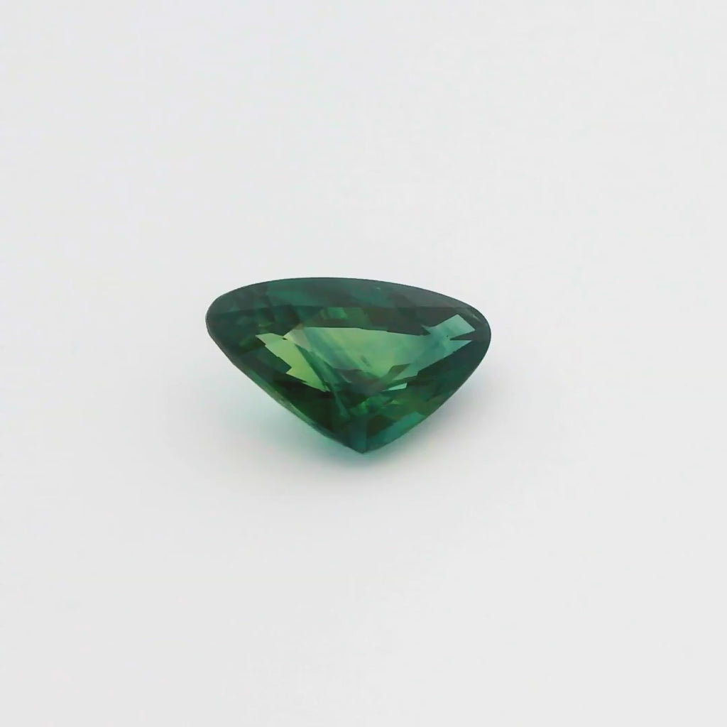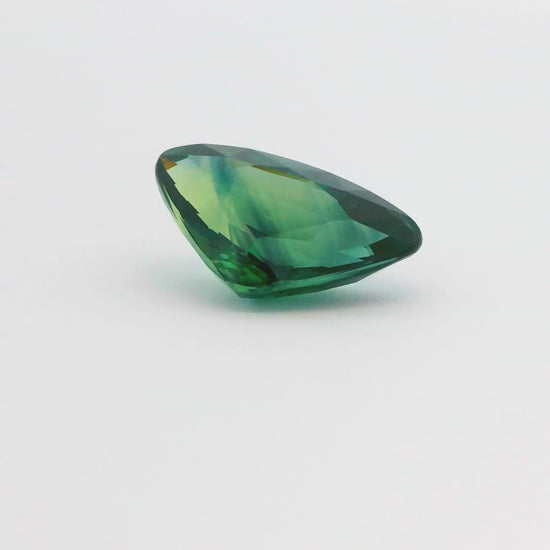 Stunning 3.17 carat triangular-faceted natural bi-color Sapphire gemstone measuring 11.98 x 7.47 x 4.84 mm. This slightly included gemstone has been heat-treated to improve both its color and its clarity, now displaying a medium-dark, strongly bluish-green color. It is best suited as a display specimen or set in a ring or pendant. Includes an independent Retail Replacement Value card ($2,199) dated 2022 and a unique double-box display.
