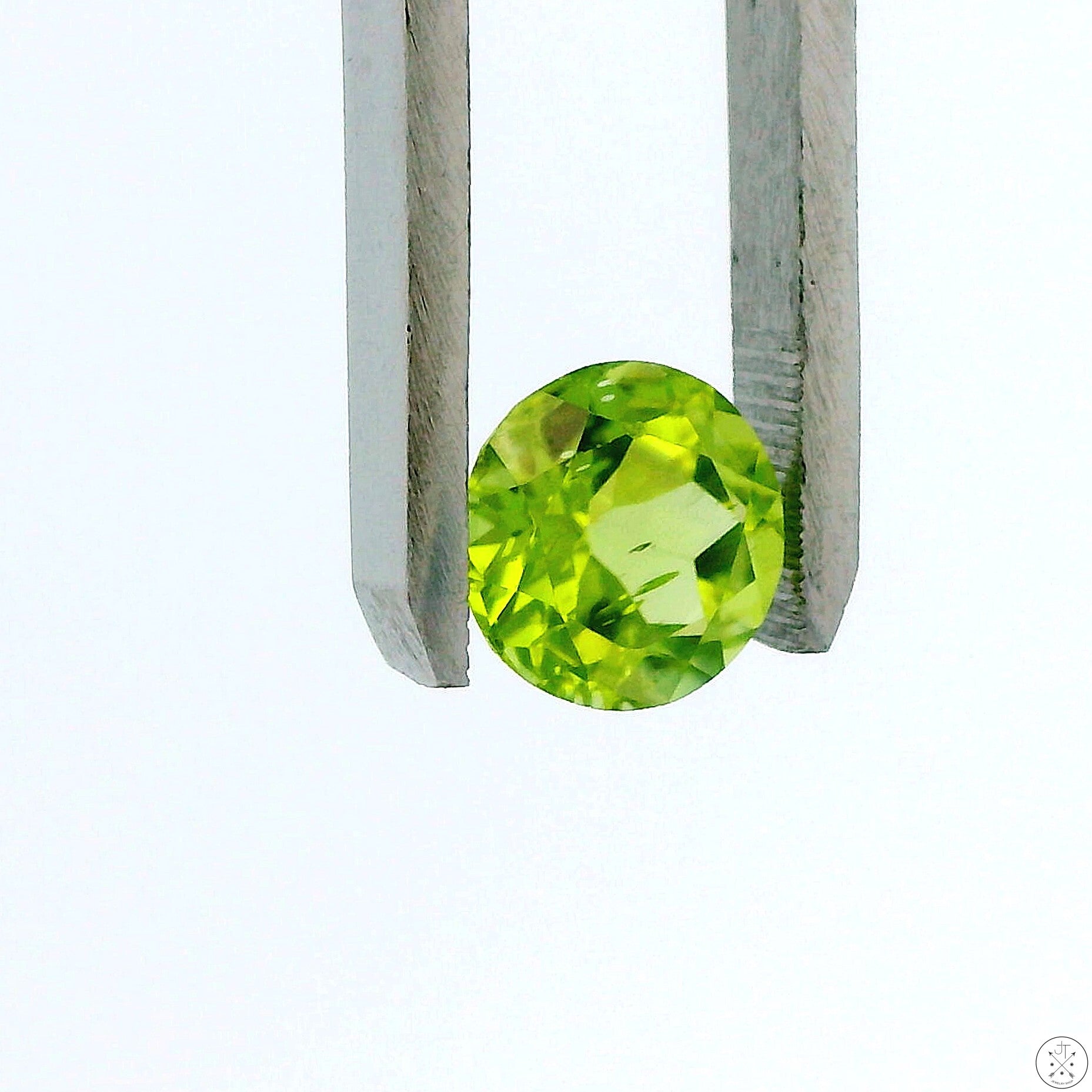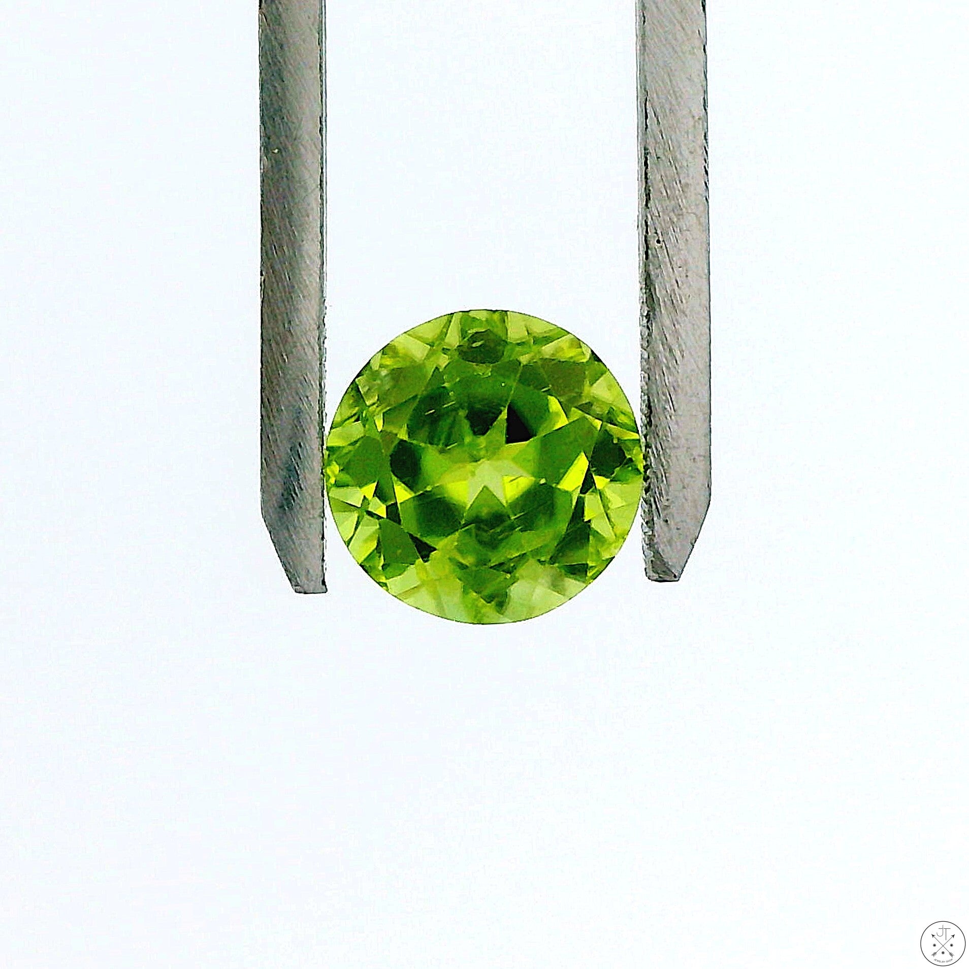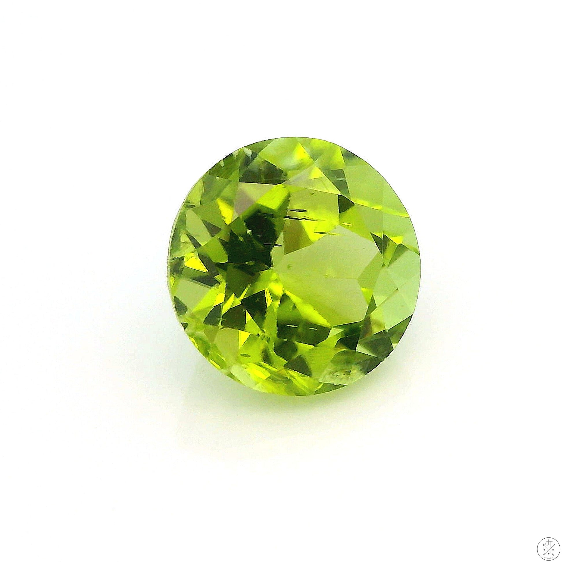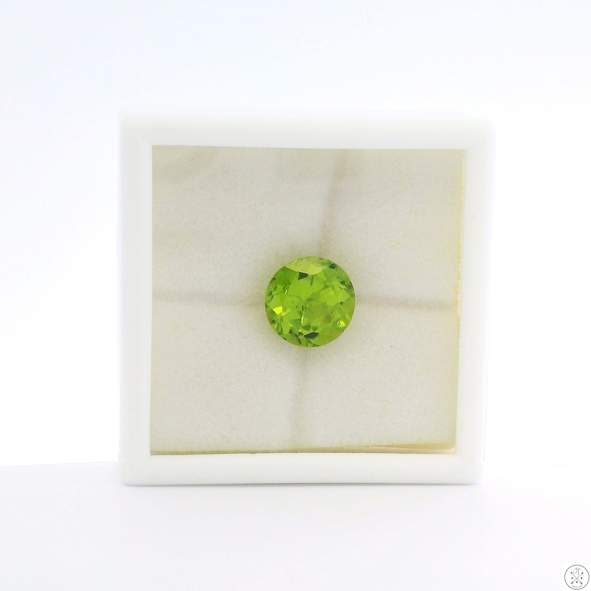 Gorgeous round-faceted natural Peridot, approximately 3.26 Carats and 9.00 x 8.99 x 6.10 mm. This stunning, slightly included, slightly yellowish-green gemstone is new and ships in a gem jar.