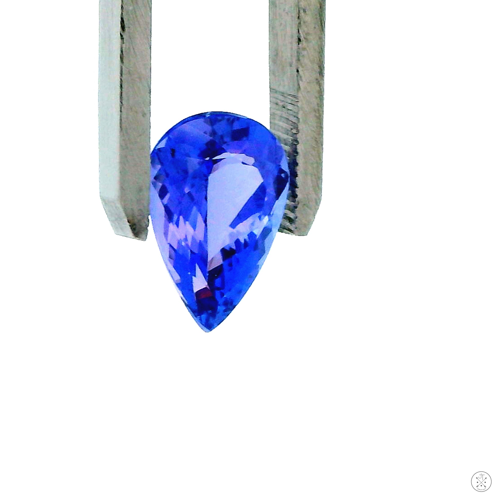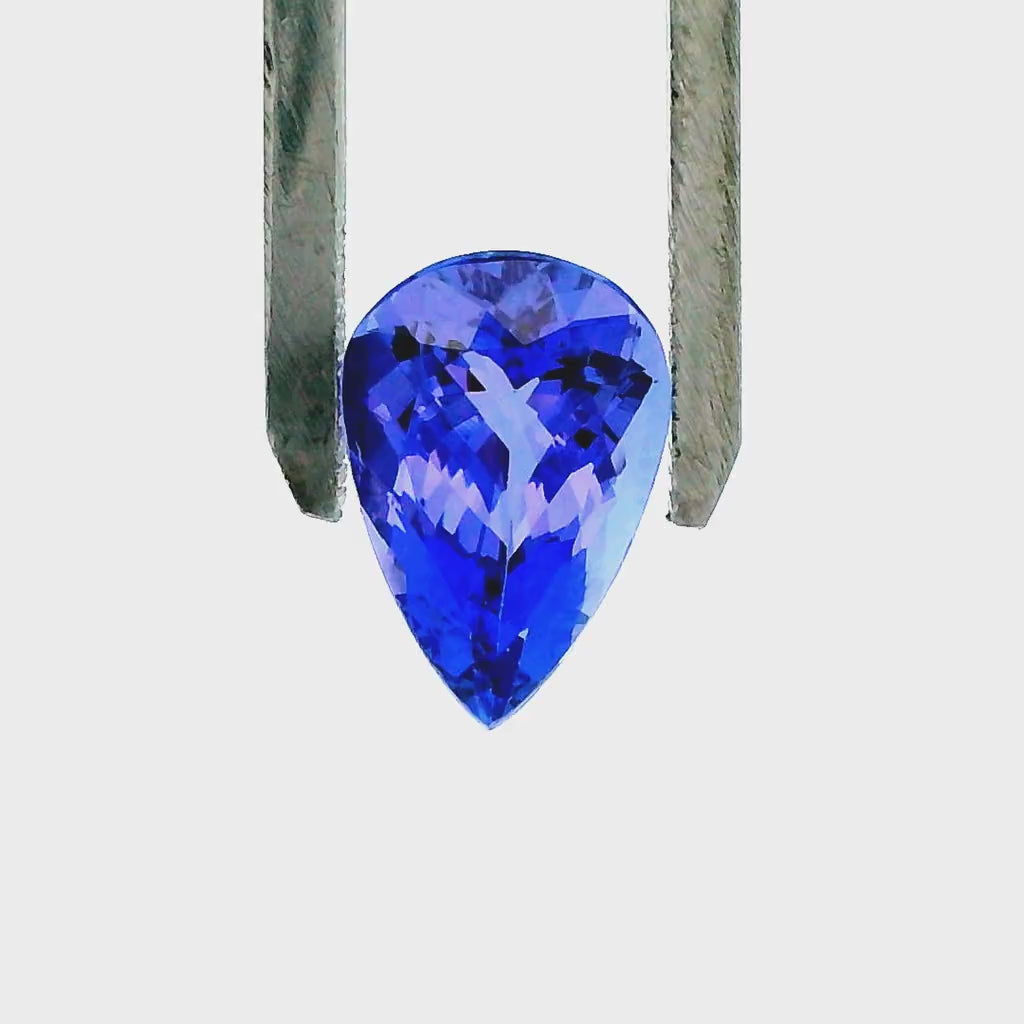 Gorgeous pear-faceted natural Tanzanite mined in Tanzania, approximately 3.91 Carats and 12.84 x 8.71 x 5.53 mm. This beautiful bluish-violet gemstone has a medium-dark tone and strong saturation, and is loupe-clean. New and ships in a gem jar.