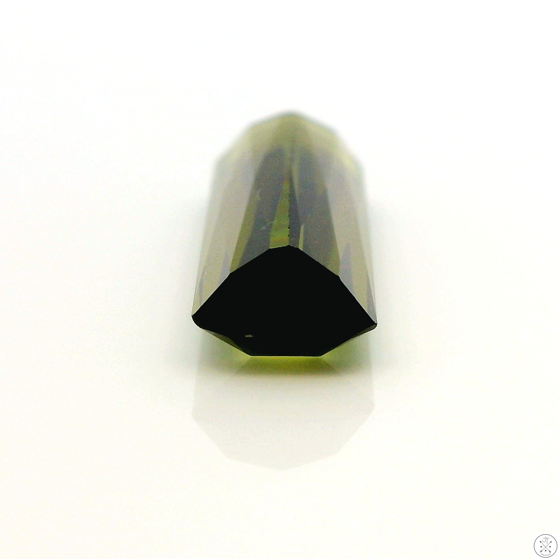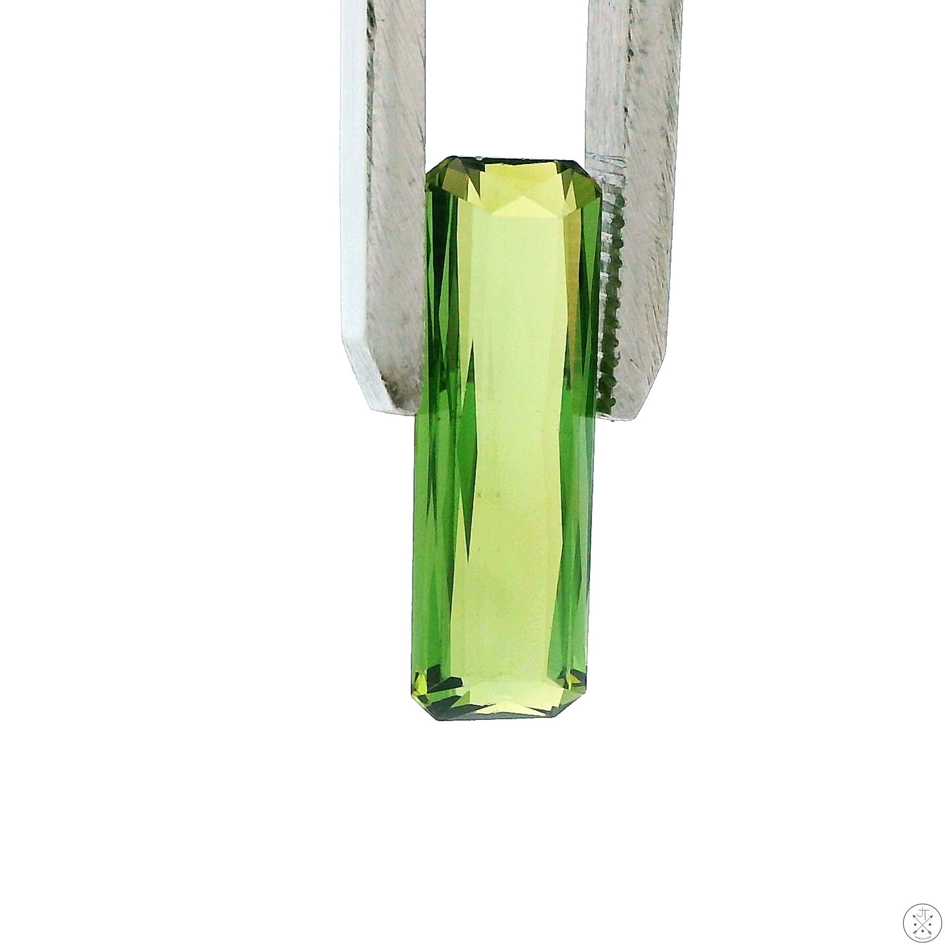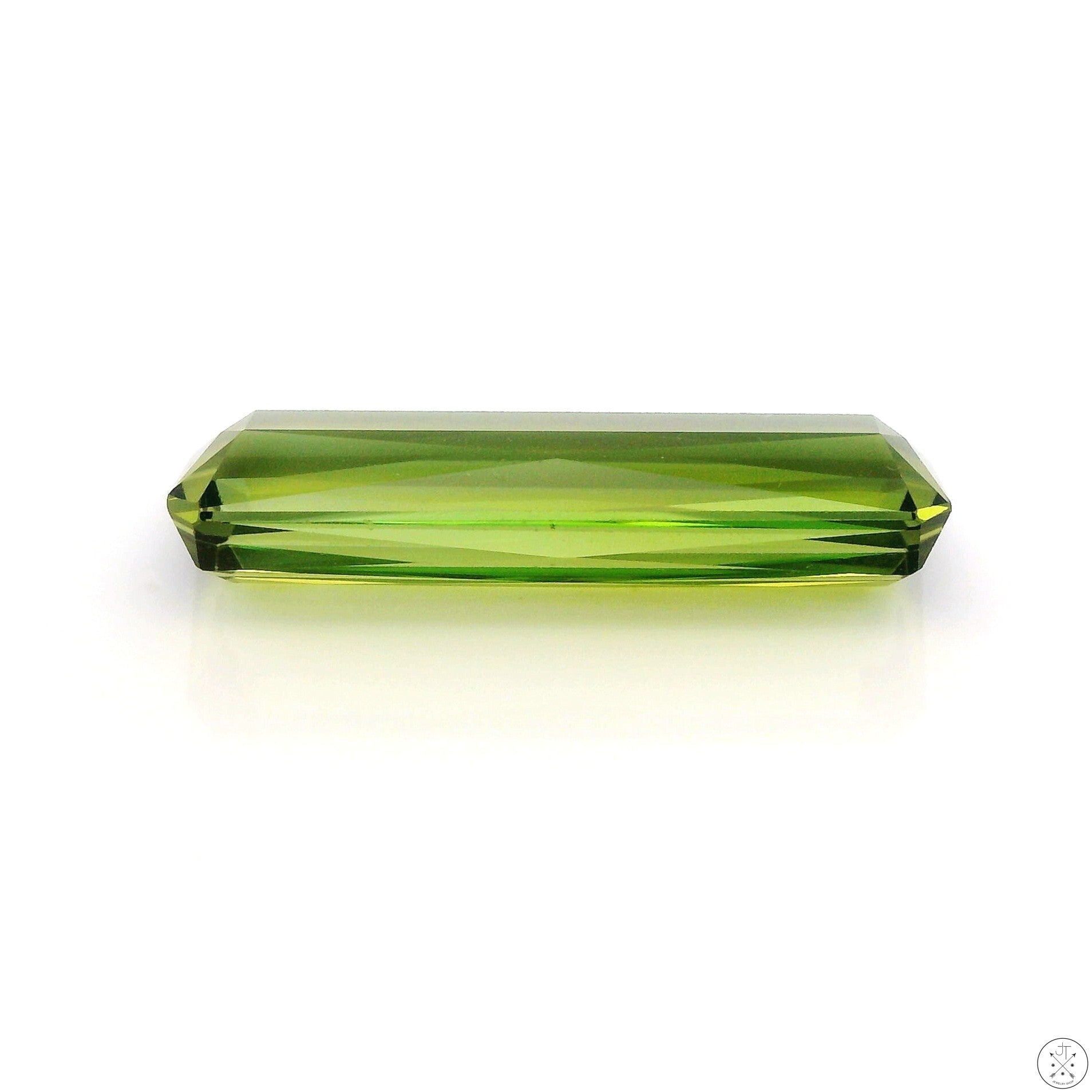 Gorgeous scissor-cut elongated rectangle natural Green Tourmaline gemstone, approximately 4.12 carats and 17.90 x 5.87 x 4.00 mm. This beautiful gemstone displays slightly olive-green and green colors, with slightly light saturation, a small blue color zone, and is loupe-clean. This gemstone is new and ships in a gem jar, best suited as a display specimen or to be set in a pendant.