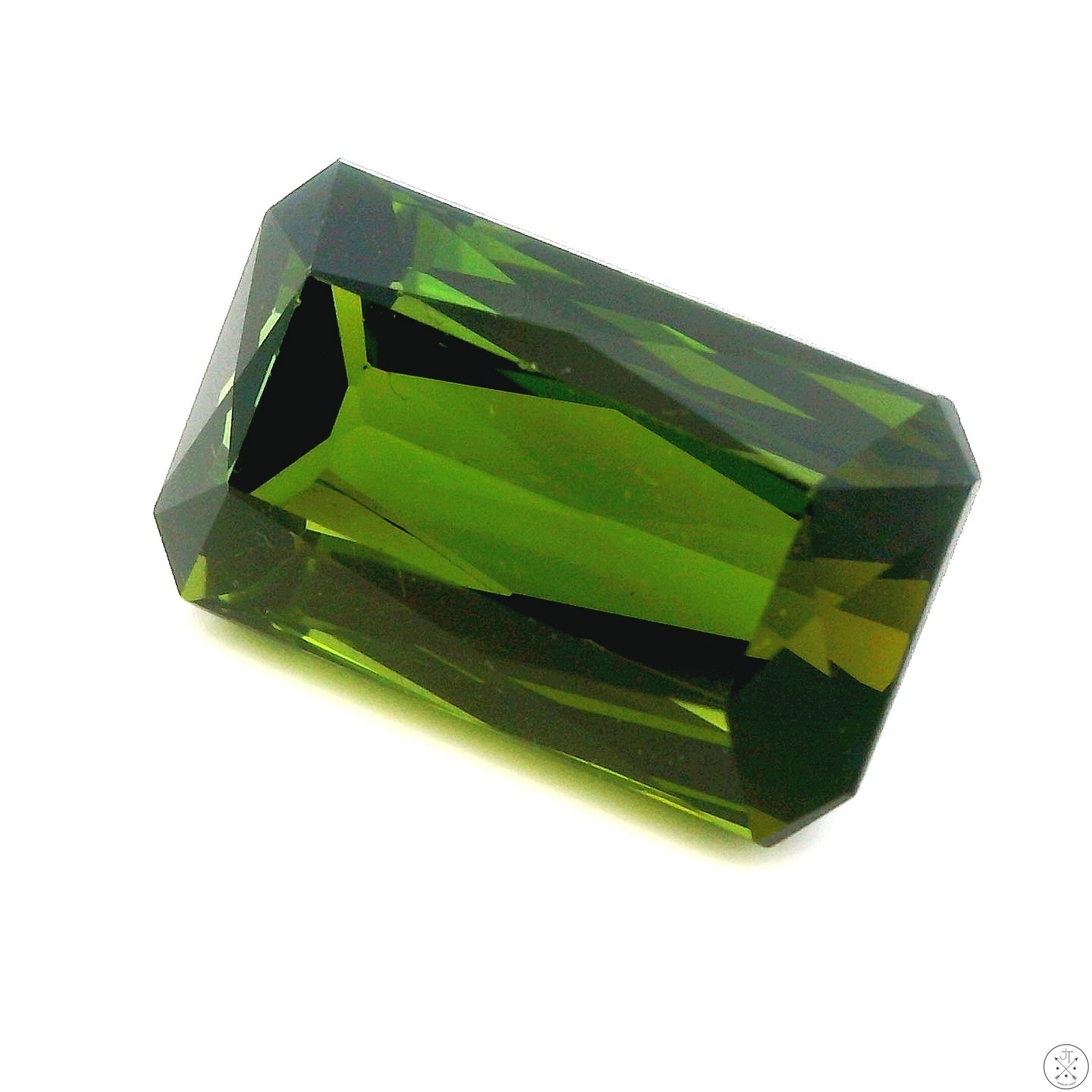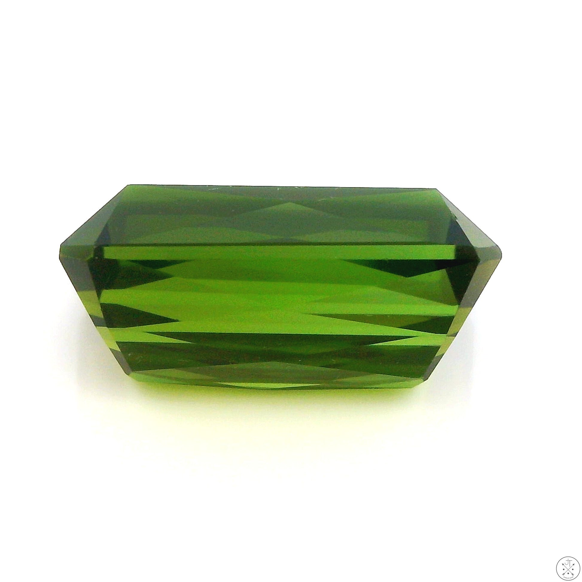 Gorgeous scissor-cut rectangle natural Green Tourmaline gemstone, approximately 5.92 carats and 13.10 x 7.98 x 6.20 mm. This beautiful gemstone displays olive-green and medium-dark green colors, with medium-dark saturation, and is loupe-clean. This gemstone is new and ships in a gem jar, best suited as a display specimen or to be set in a ring or pendant.