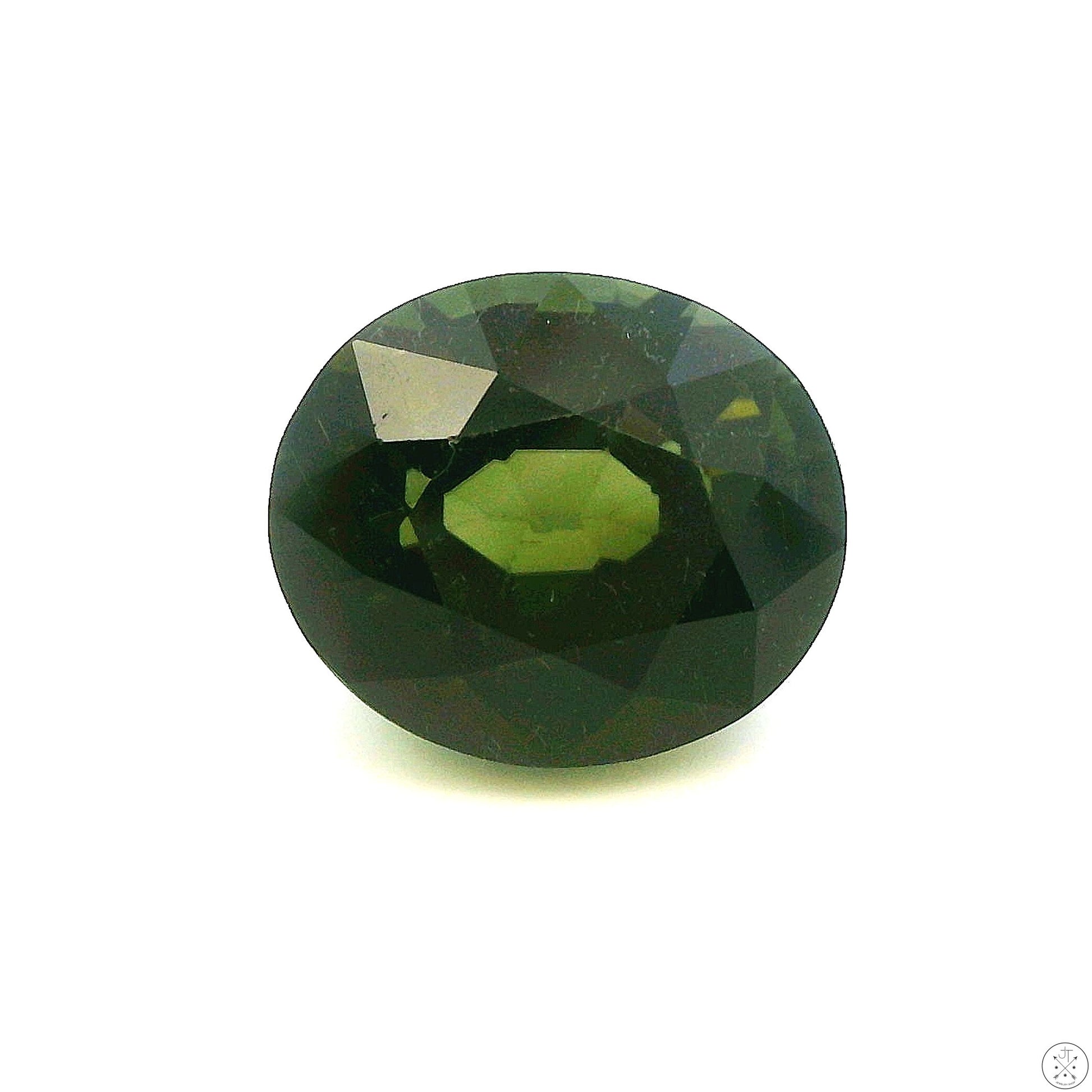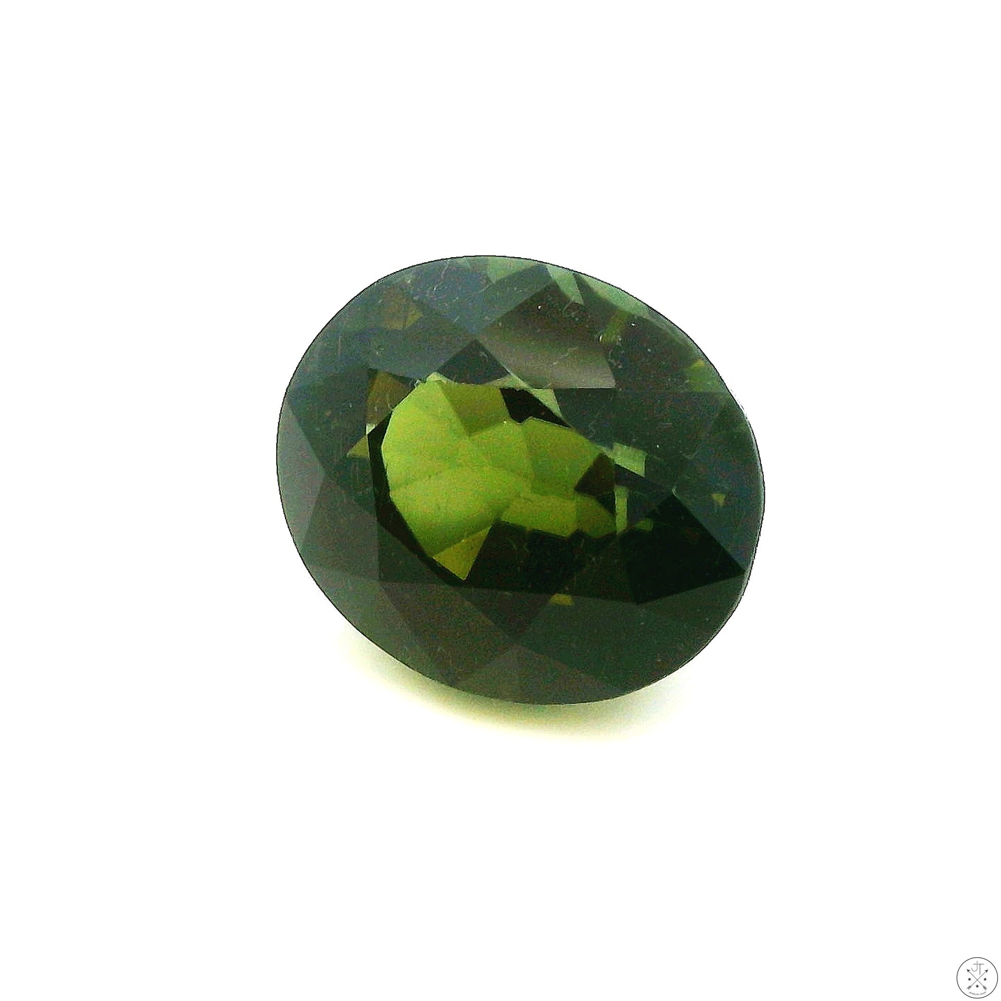 Gorgeous oval-faceted natural Green Tourmaline gemstone, approximately 7.09 carats and 11.89 x 10.20 x 8.51 mm. This beautiful gemstone displays a medium-dark olive green color with slightly dark green zoning and is eye-clean. This gemstone is new and ships in a gem jar, best suited as a display specimen or to be set in a ring or pendant.