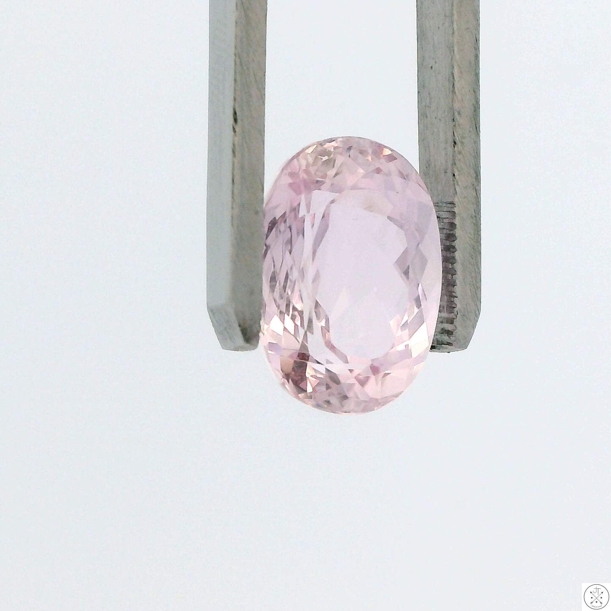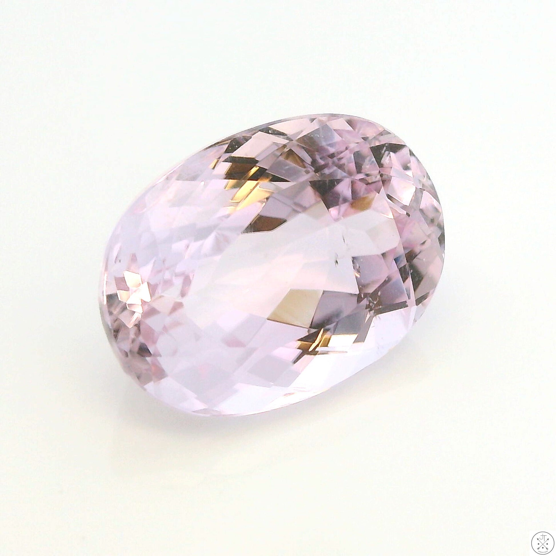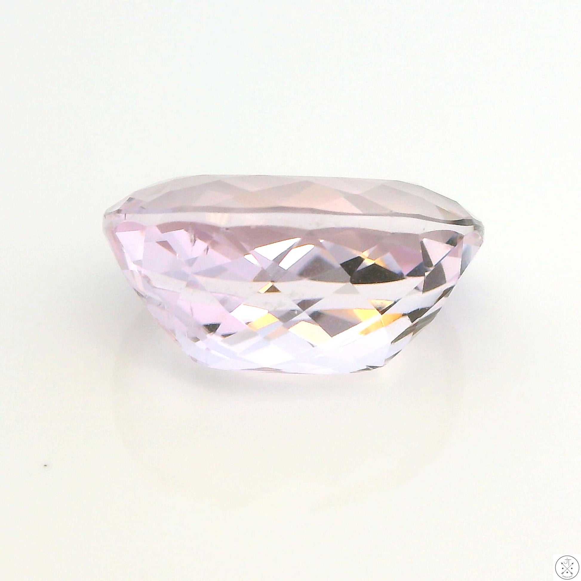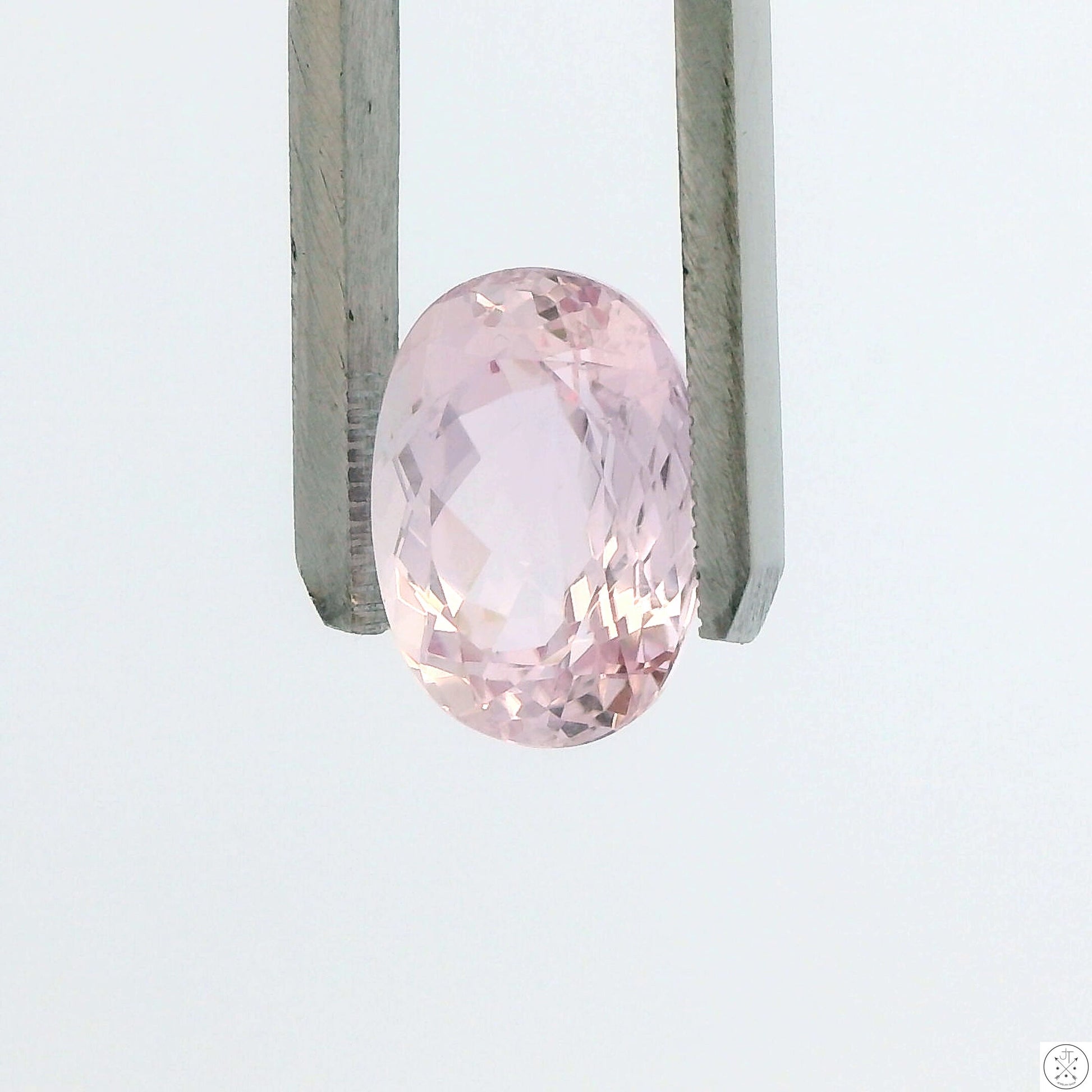 Gorgeous oval-faceted natural Kunzite gemstone, approximately 9.90 Carats and 15.22 x 11.14 x 7.62 mm. This stunning, eye-clean light pink gemstone is new and ships in a gem jar.