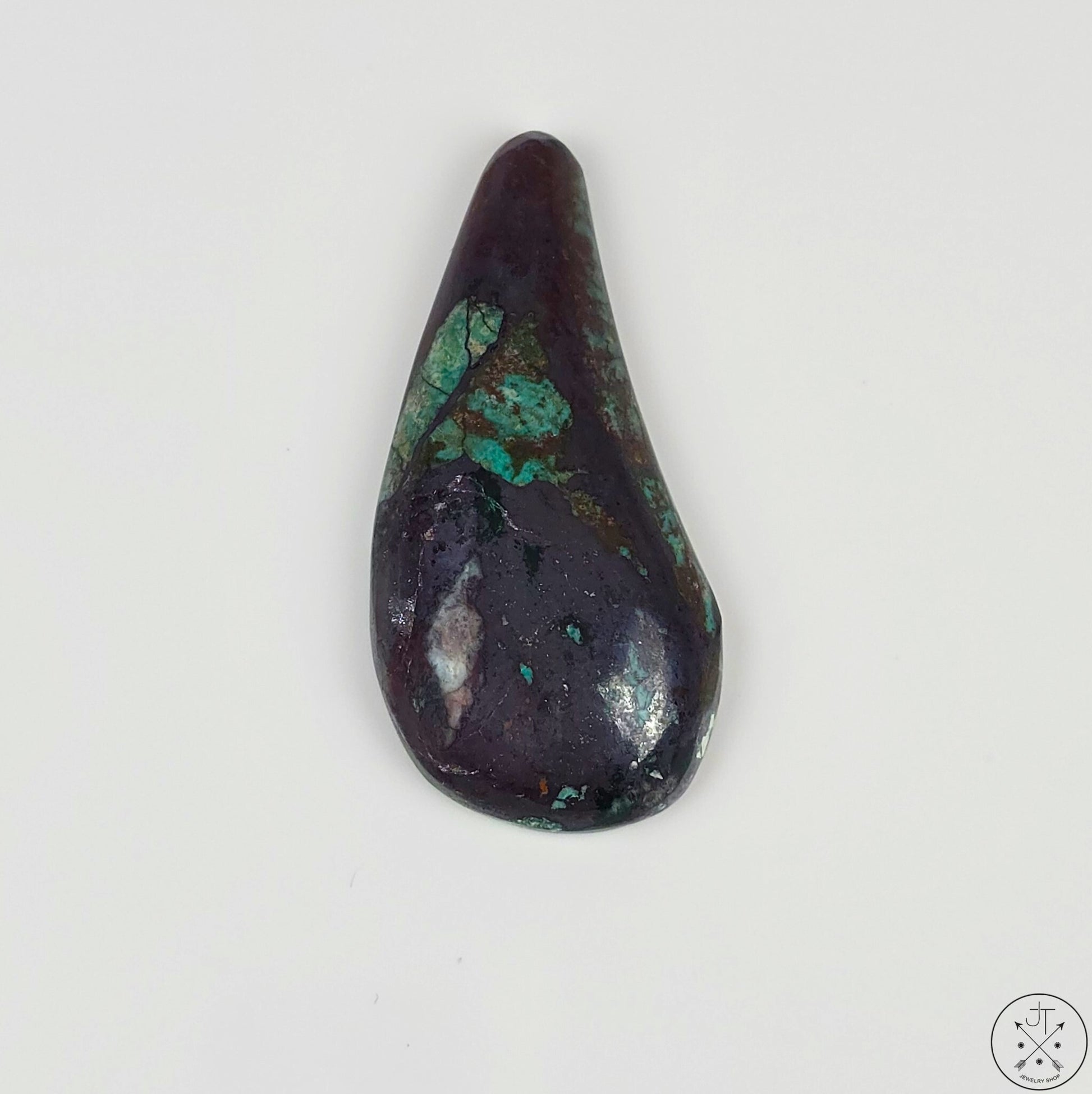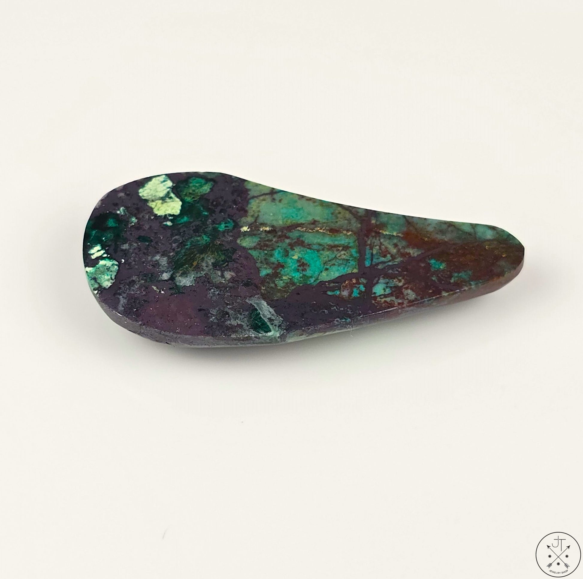 This natural teardrop-shaped Colla Wood cabochon from Zile, Turkey, features beautiful patterns of Turquoise, Chrysocolla, Malachite, and Hematite, as well as touches of Chalcedony. Weight: 57 carats. Dimensions: 41.6 x 20 x 6.6 mm.