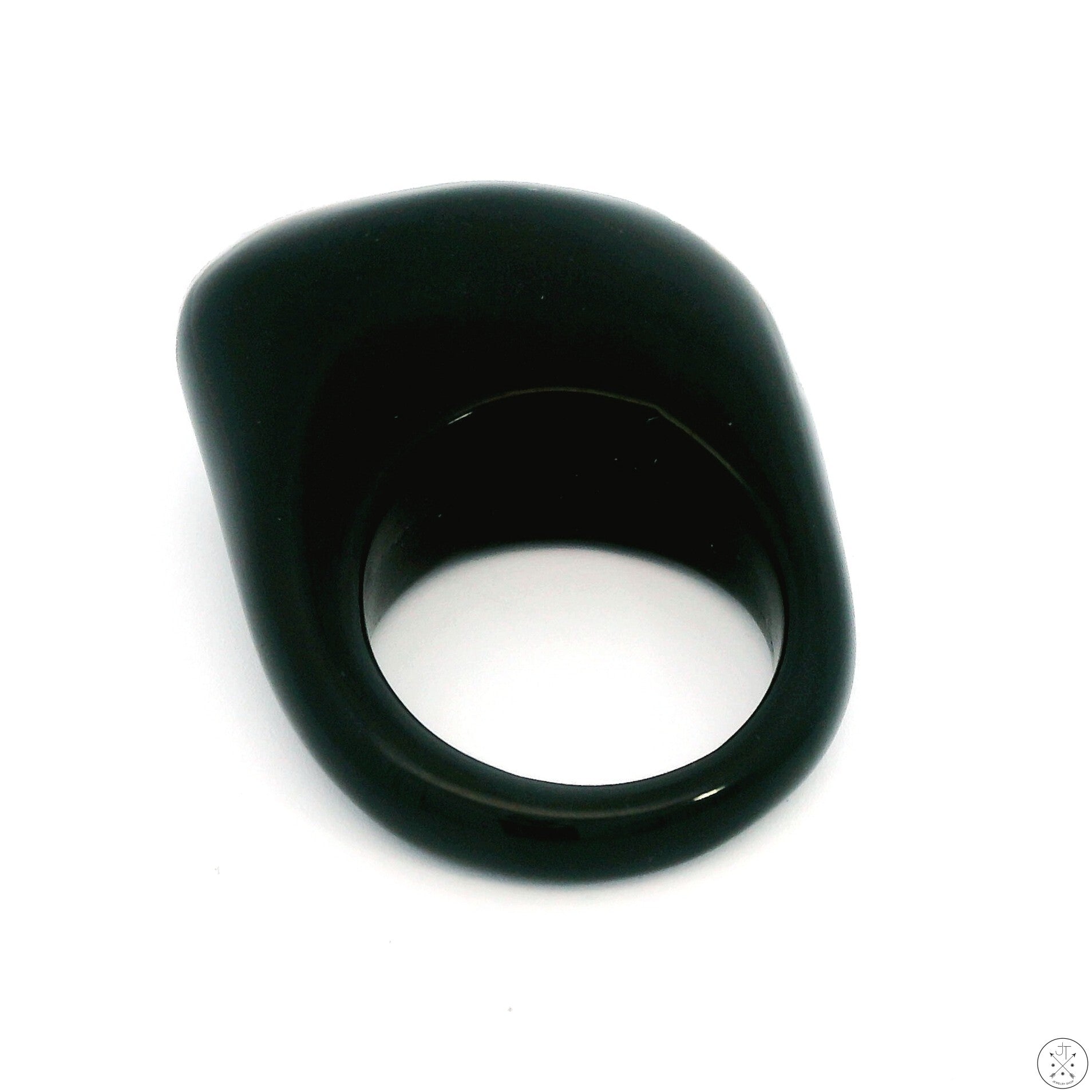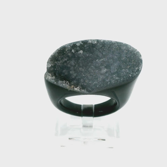 This wonderful natural Drusy ring features a classy black Agate size 6.5 band with Drusy Quartz on top rising to 16.5 mm above the finger. The top of the ring is approximately 11.3 mm at its widest, tapering to 4.2 mm at the bottom of the band. This beautiful circa 1990s ring has minimal wear and weighs approximately 9.90 grams (49.5 carats).