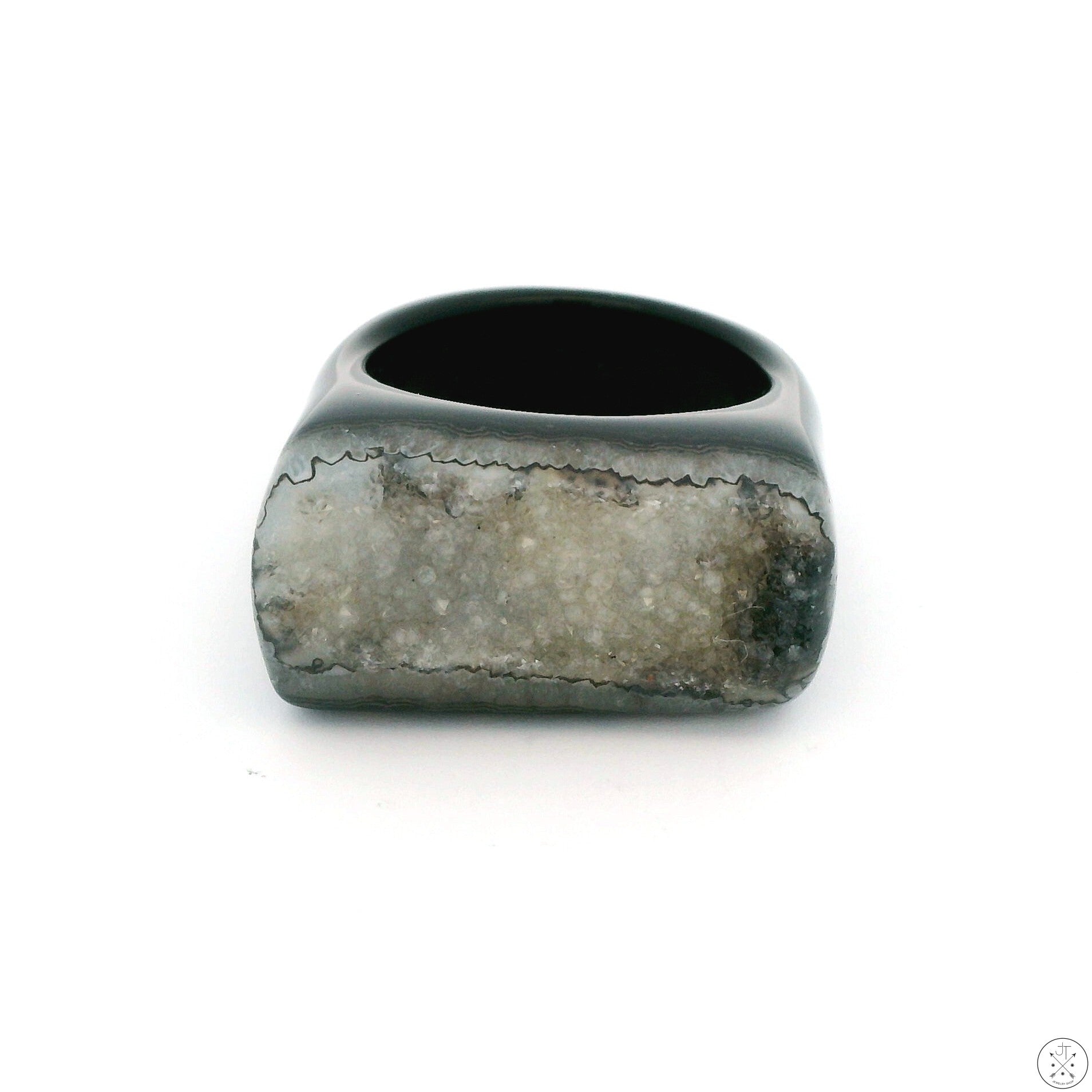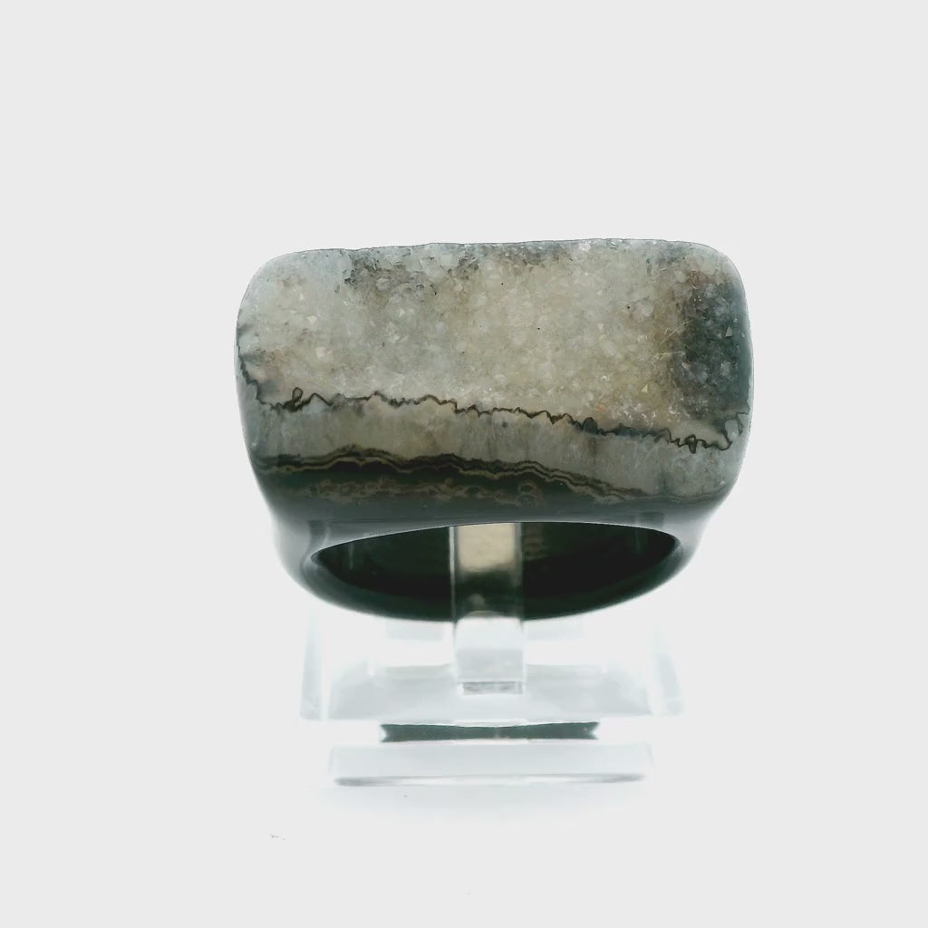 This wonderful natural Drusy ring features a classy black Agate size 8 band with Drusy Quartz on top rising to 9.7 mm above the finger. The top of the ring is approximately 12.9 mm at its widest, tapering to 7.5 mm at the bottom of the band. This beautiful circa 1990s ring has minimal wear and weighs approximately 9.87 grams (49.35 carats).