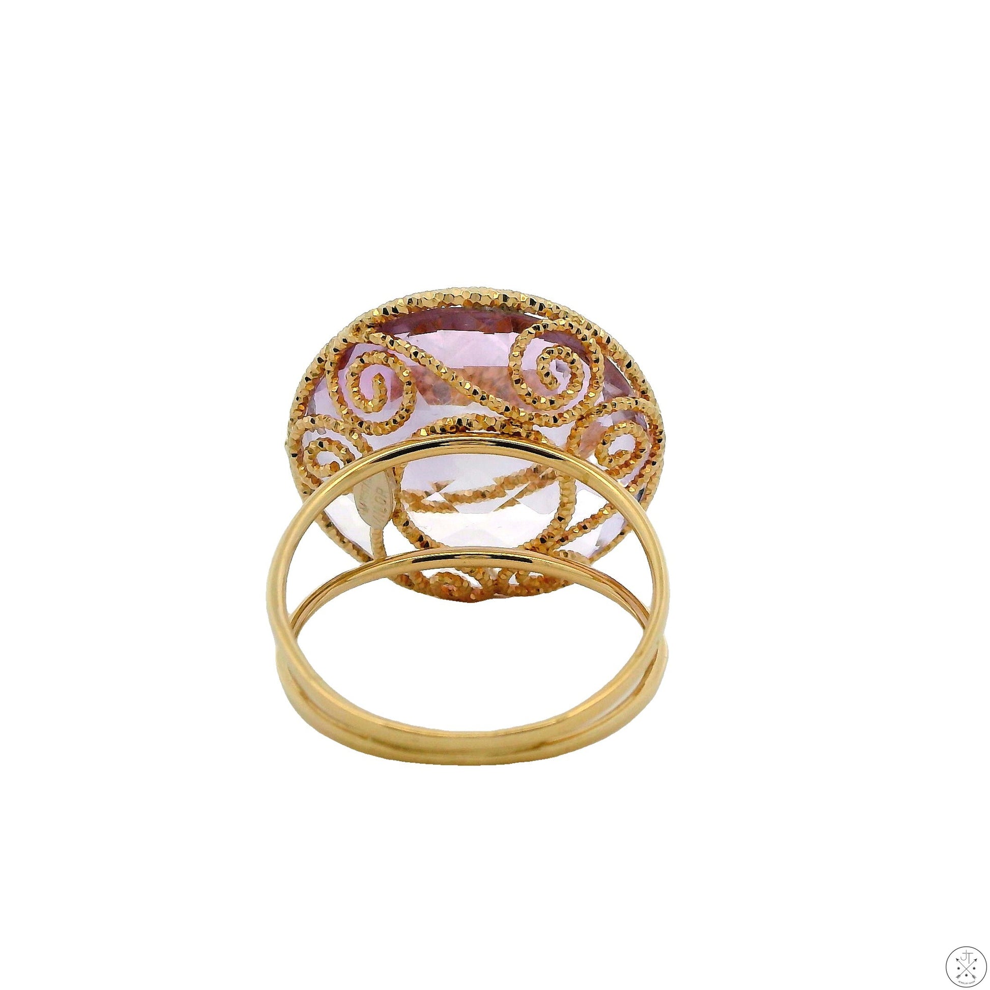 Adorn your hand with this luxurious solid 14k Yellow Gold wire ring, highlighted by a vibrant 20 mm light purple checkerboard cut natural Amethyst gemstone. The intricate diamond-cut gold wire design surrounding the stone adds a unique flair, making it an ideal accessory for both everyday wear and special occasions. A true statement piece for those who appreciate fine jewelry. Stamped '14kt Italy Milor' on a dedicated plate, this beautiful size 9 ring weighs approximately 6.90 grams and is in excellent condition. The top of the ring rises to approximately 9.3 mm above the finger, and is approximately 22.1 mm at its widest, with the tapering band connecting at the bottom at 2.25 mm for comfortable wear.