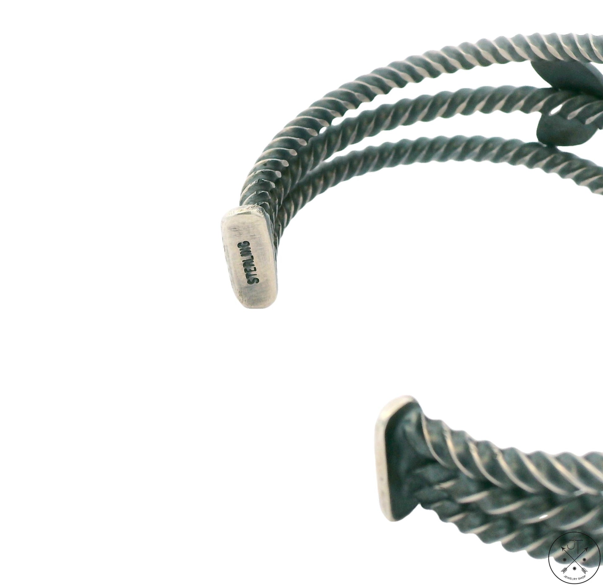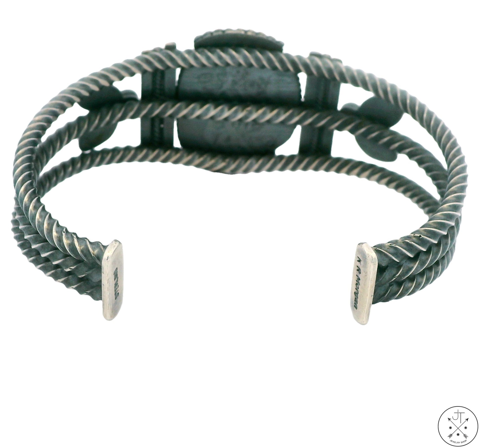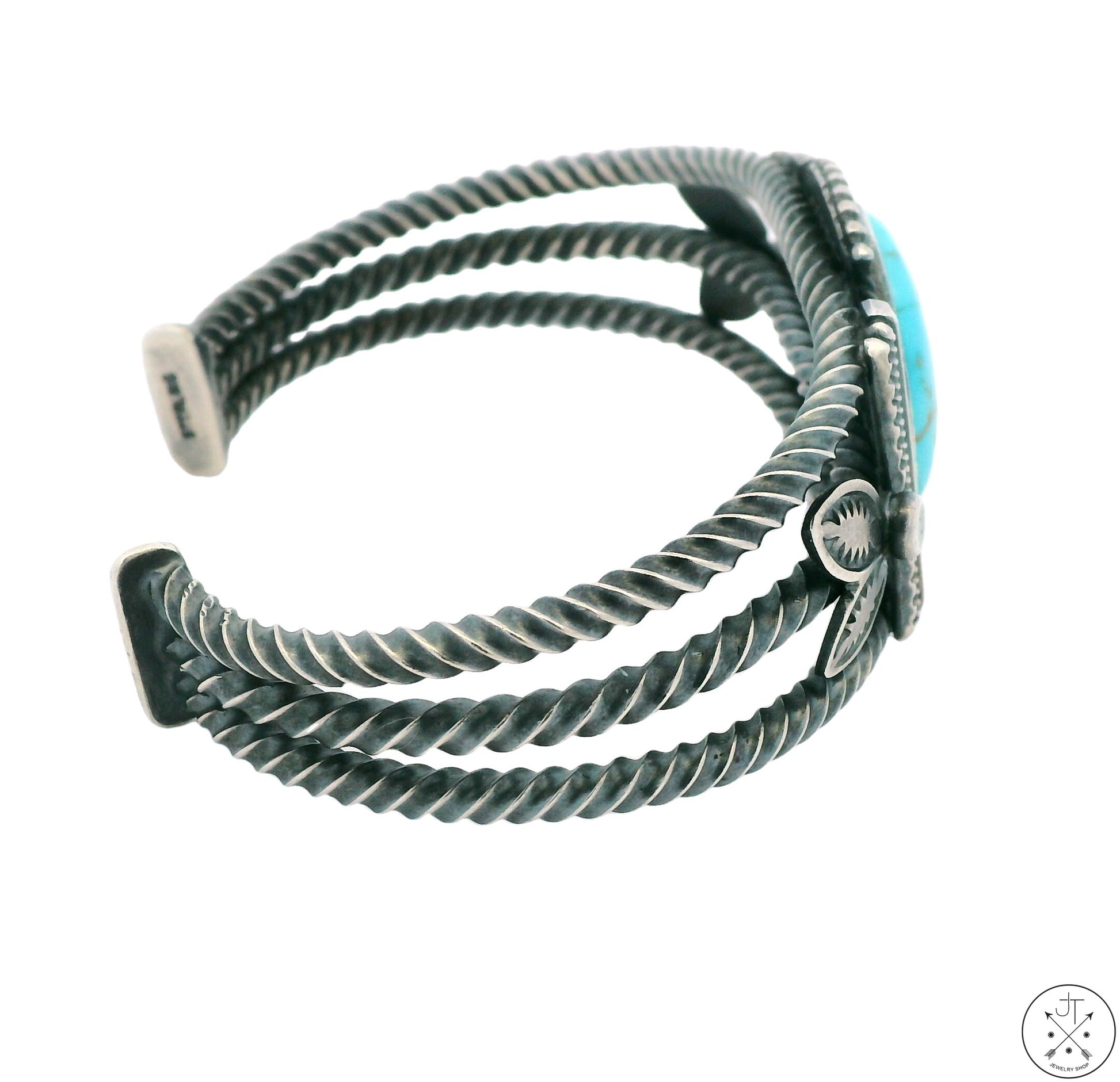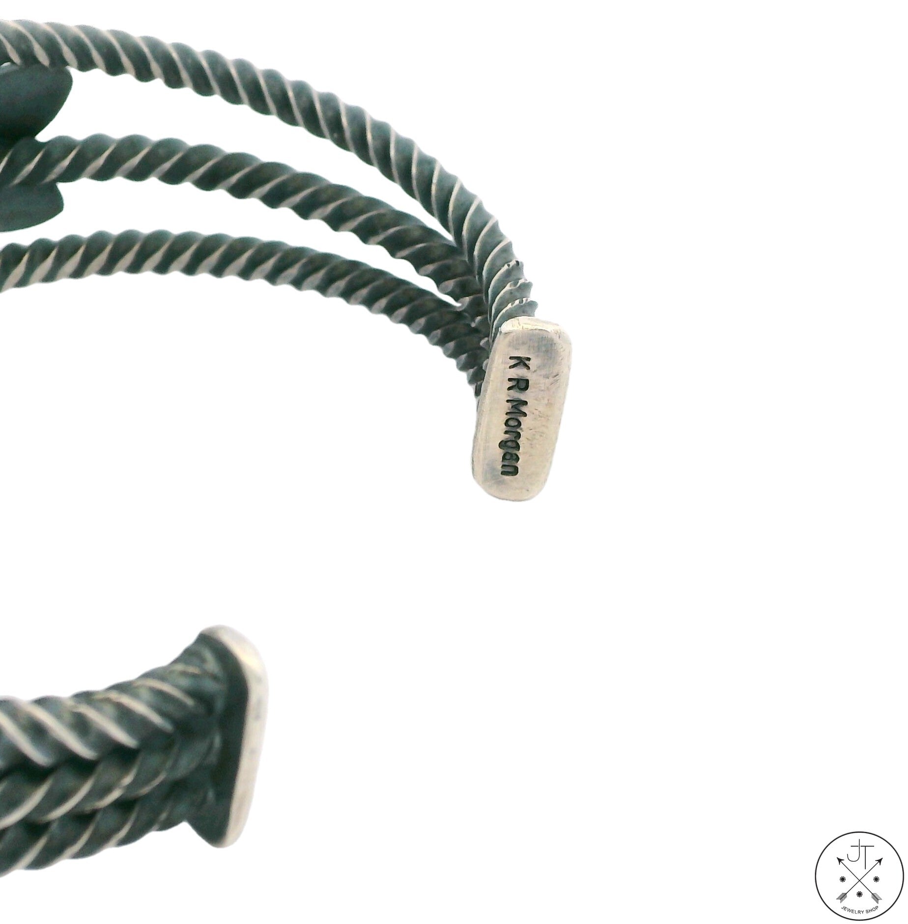 Beautiful twisted-bar Sterling Silver cuff with a natural Turquoise Cabochon from the Royal Blue mine (a section of the Royston mine). Stamped 'K R Morgan' and 'sterling' by Navajo Silversmith Kelly Morgan, this vintage cuff has been cleaned but not polished with some beautiful patina, and is otherwise in nearly new condition. The top of the bracelet is approximately 29 mm at its widest, tapering to 12.7 mm at the 1.2 inch gap with inner dimensions of 61 mm (2.4 in) wide and 44 mm (1.7 in) tall, creating an inner circumference of approximately 172 mm (6.8 in), Ladies size L or Mens size S. This wonderful cuff bracelet weighs approximately 43.80 grams.