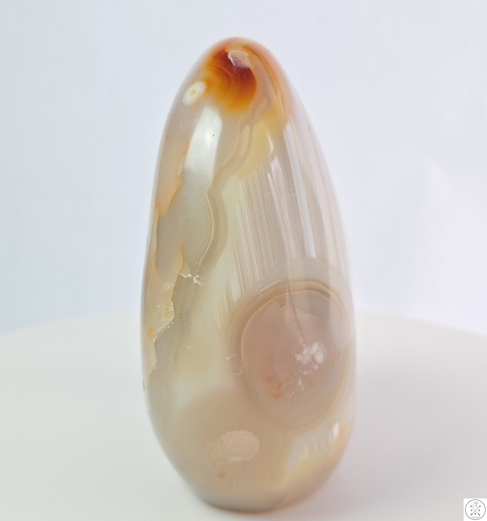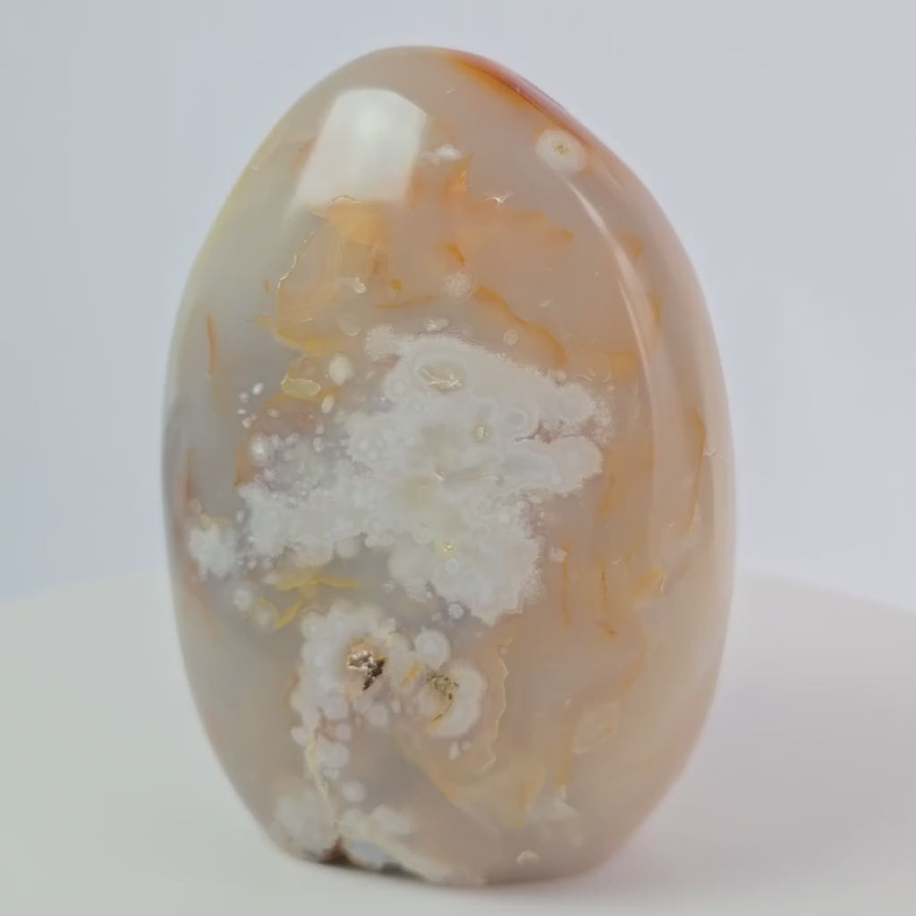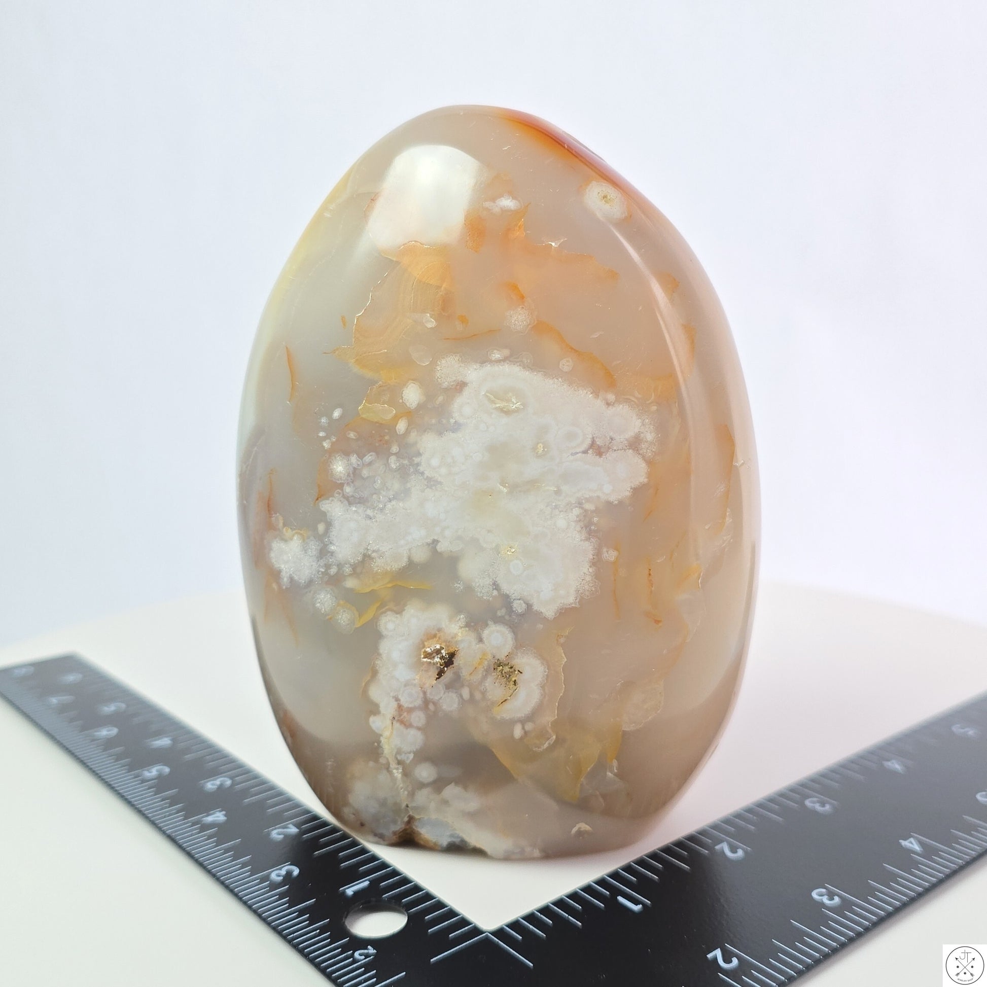 Discover the beauty of nature with this stunning natural Flower Agate freeform. This hand-shaped specimen measures approximately 5.25 x 3.8 x 2.35 inches and weighs approximately 1,195 grams.