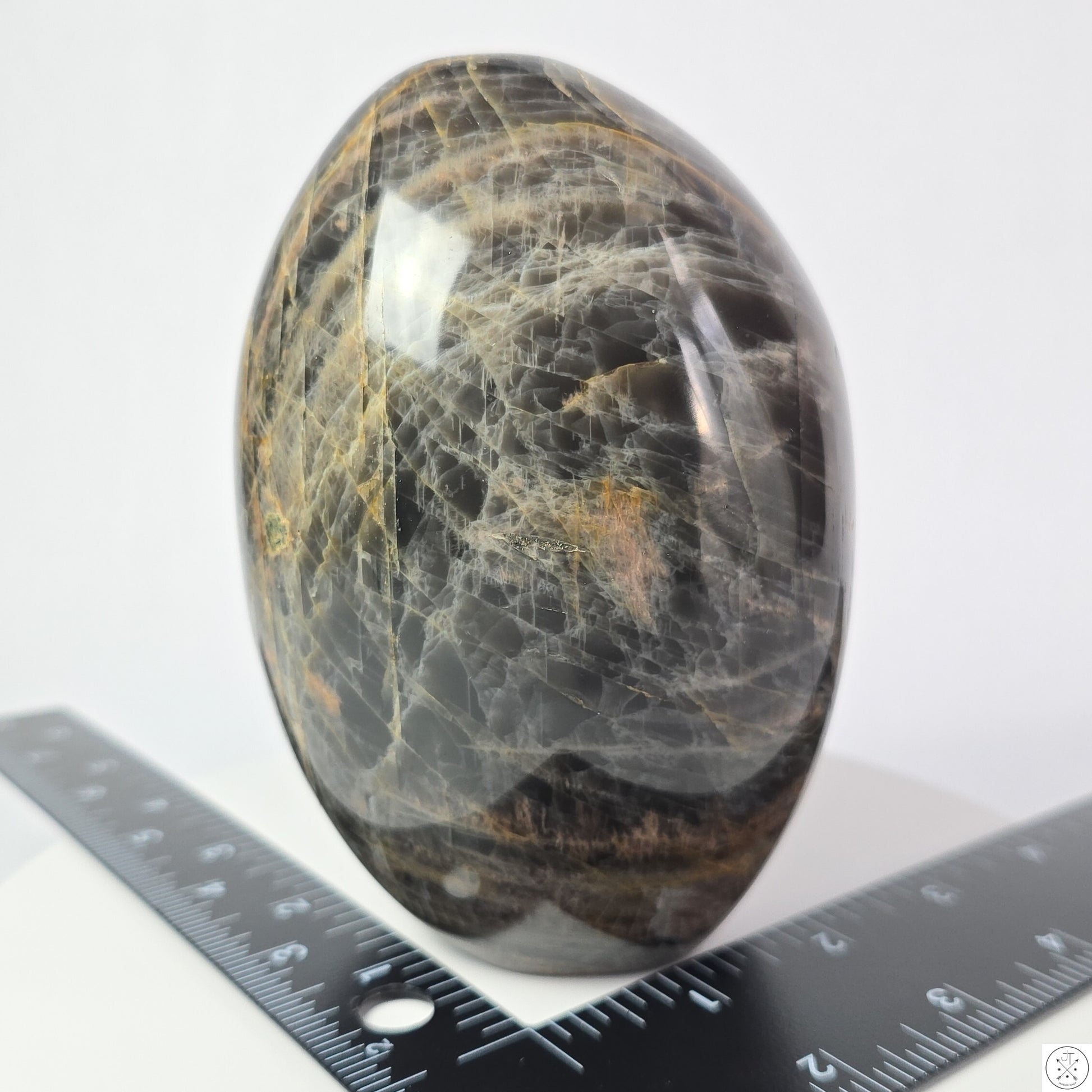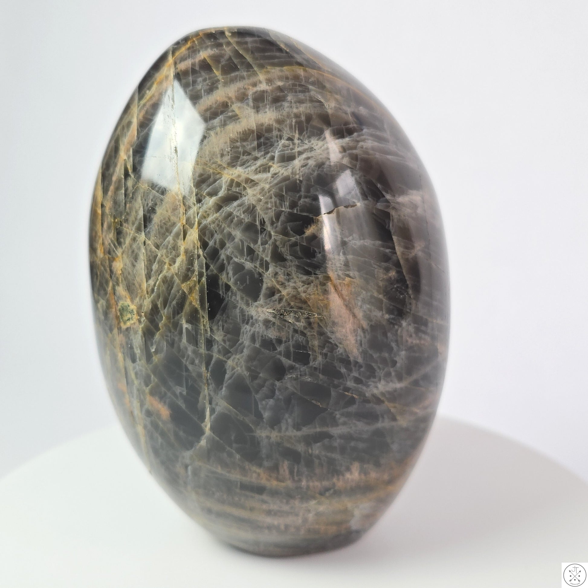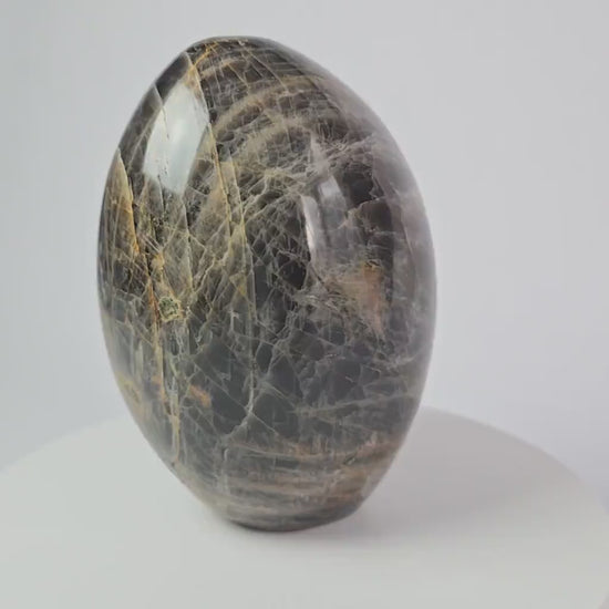 Discover the beauty of nature with this stunning natural Black Moonstone freeform. This hand-shaped specimen measures approximately 5 x 3.6 x 3.4 inches when standing on its flat base, and weighs approximately 1,350 grams (2.98 pounds).