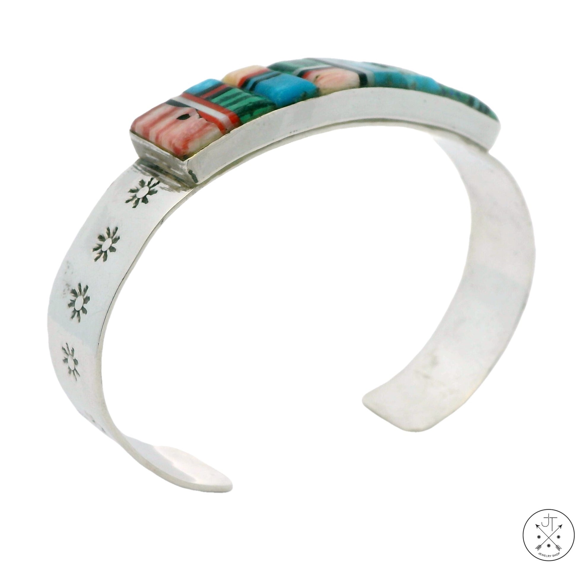 Beautiful Sterling Silver cuff with natural Turquoise, Malachite, Spiny Oyster, Onyx, Coral, Azurite, and Mother of Pearl inlayed in a raised bezel. Stamped 'sterling', this late-2000s cuff weighs approximately 30.20 grams, has been professionally cleaned and polished, and is in very good condition. The top of the bracelet is approximately 13.9 mm at its widest, with inner dimensions of 67 mm (2.6 in) wide and 46 mm (1.8 in) tall with a 28 mm (1.1 in) gap, creating an inner circumference of approximately 180 mm (7 in), Ladies size XL or Mens size M.