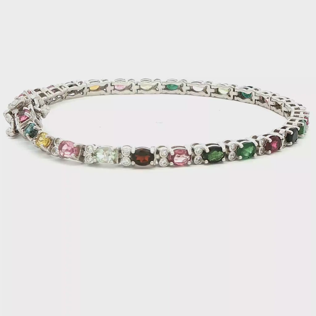 Embrace the variety of colors in natural Tourmaline and the sparkle of Quartz with this stunning Sterling Silver bracelet. The harmonious blend of shimmering Gemstones and polished Silver creates a look of bright elegance. Ideal for those who appreciate fine craftsmanship and timeless design, this bracelet is a must-have for any jewelry lover. Stamped with a maker's mark and '925 china' with a stainless steel clasp tongue, this classy 7.25-inch long, 3.6 mm wide bracelet is in excellent pre-owned condition and weighs approximately 9.19 grams. The 28 oval-faceted natural Tourmaline gemstones weigh approximately 4 carats total, and the 56 round-faceted natural Quartz gemstones weigh approximately .30 carats total.