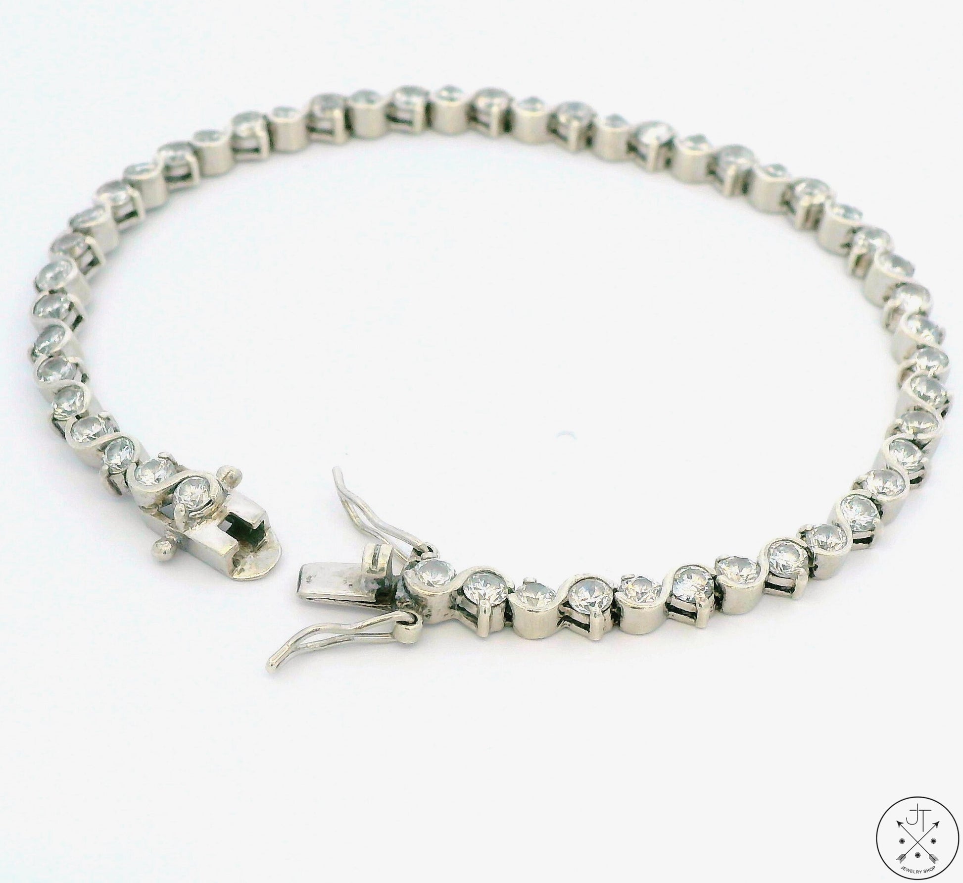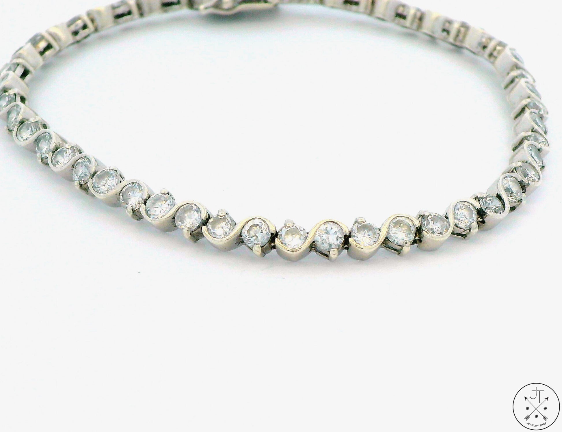 Adorn your wrist with this stunning Sterling Silver tennis bracelet, a symbol of grace and style. The sparkling round-faceted cubic zirconia are set in a modern take on a classic design that complements both casual and formal attire. Whether you're attending a gala or a casual brunch, this bracelet is sure to make a statement. Stamped '925' on the secure triple-locking clasp, this classy 7.25 inch long bracelet weighs 10.78 grams and is in excellent pre-owned condition.