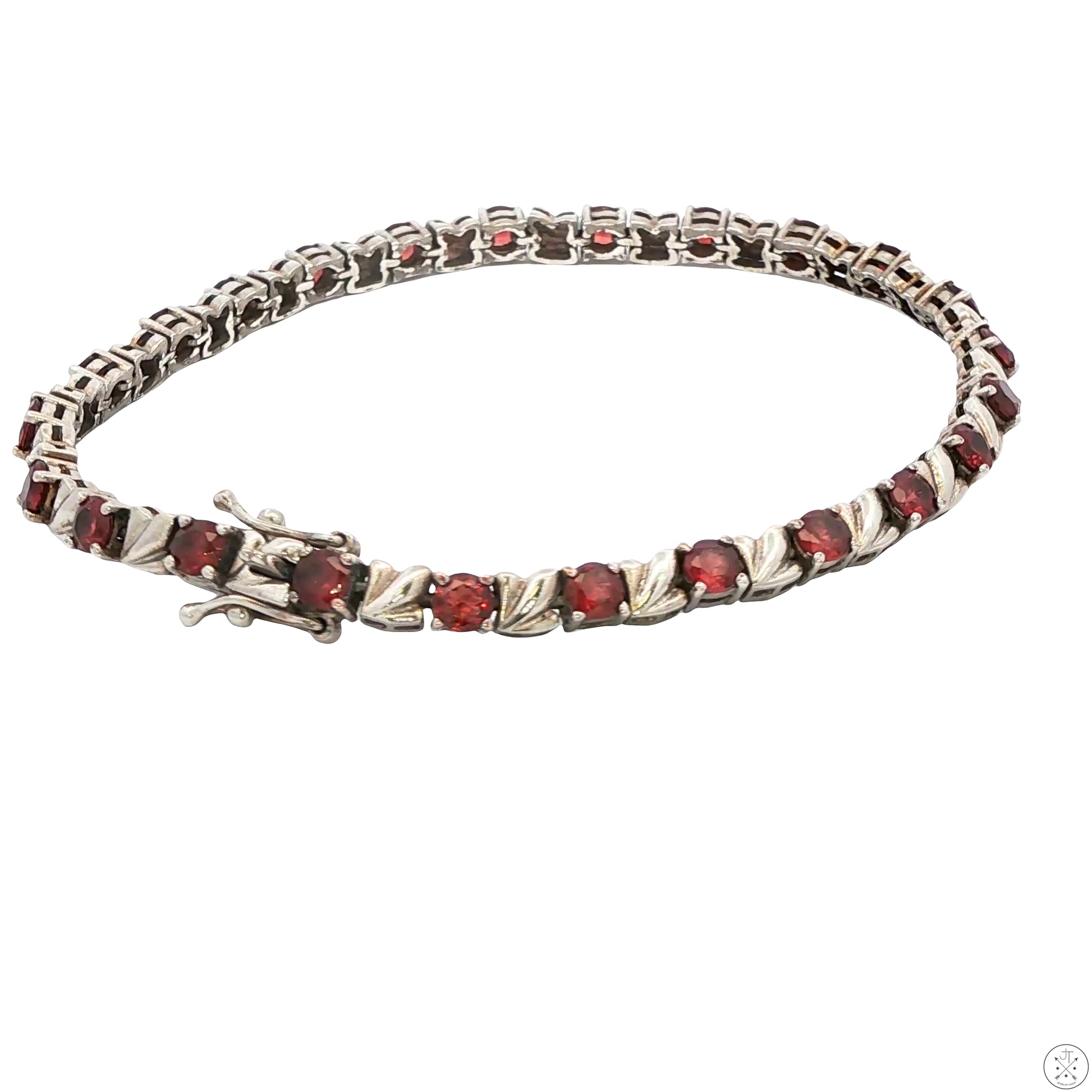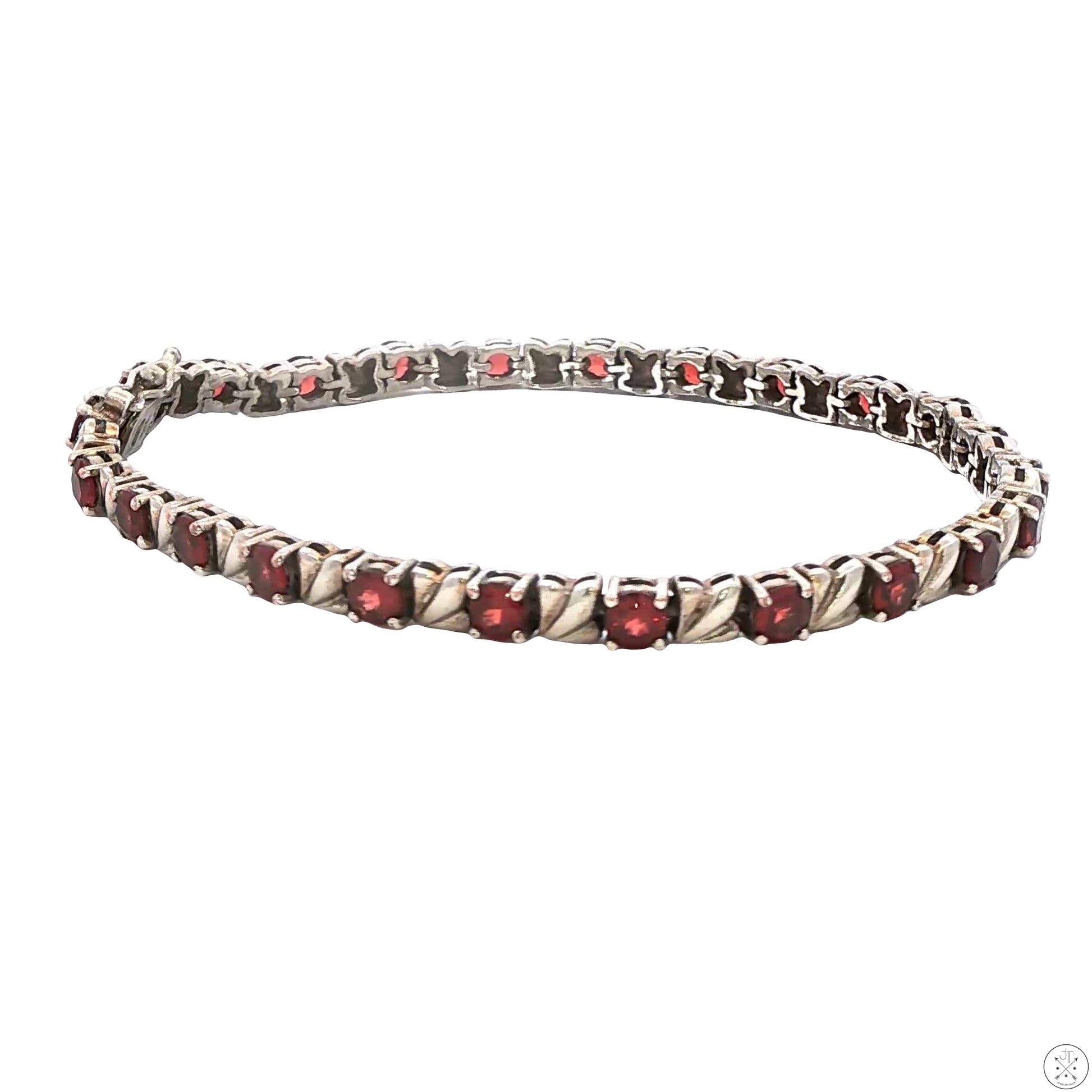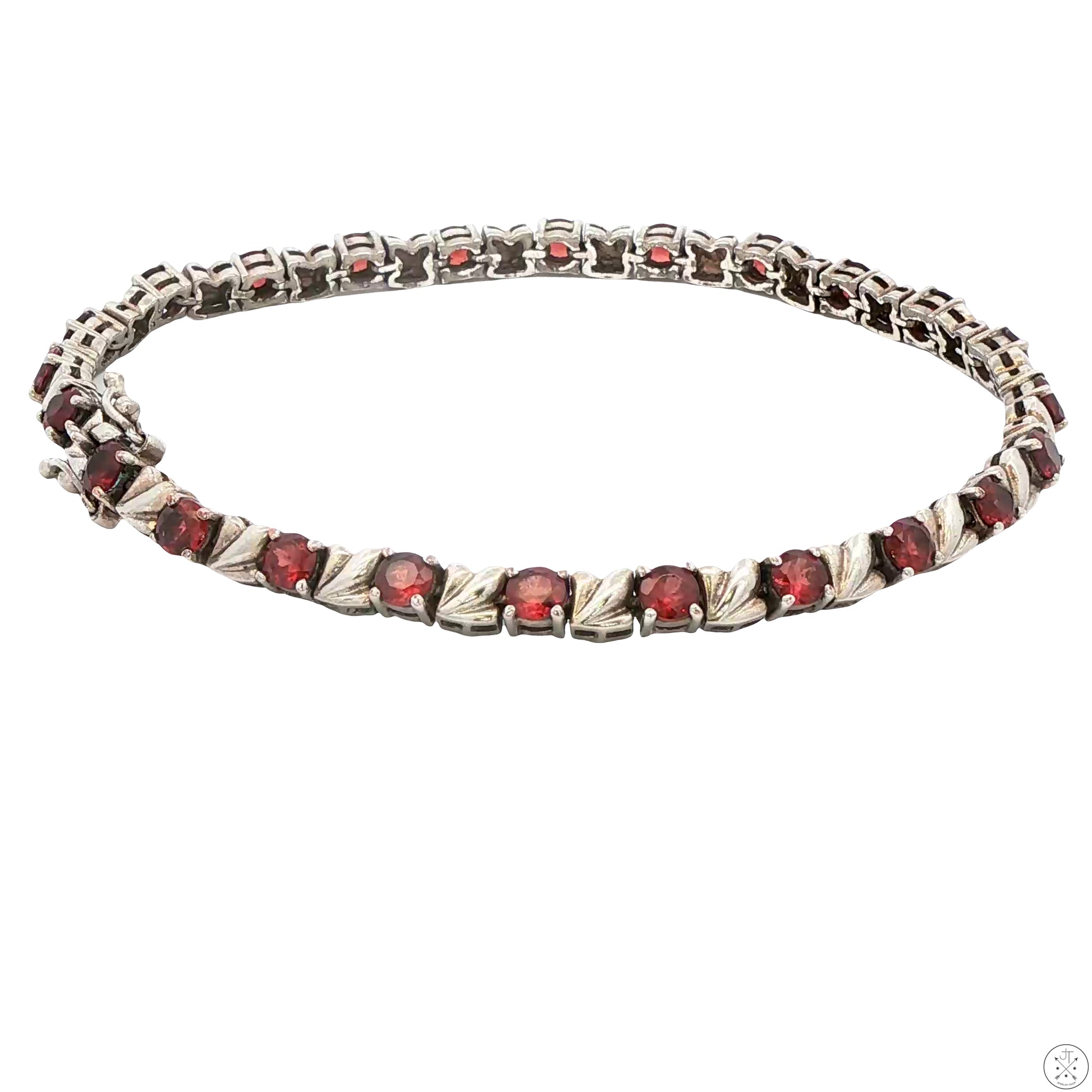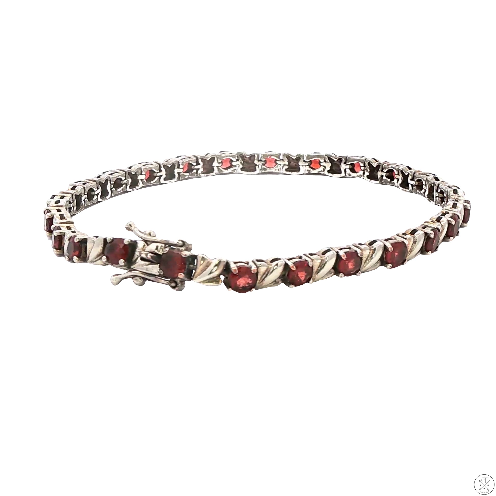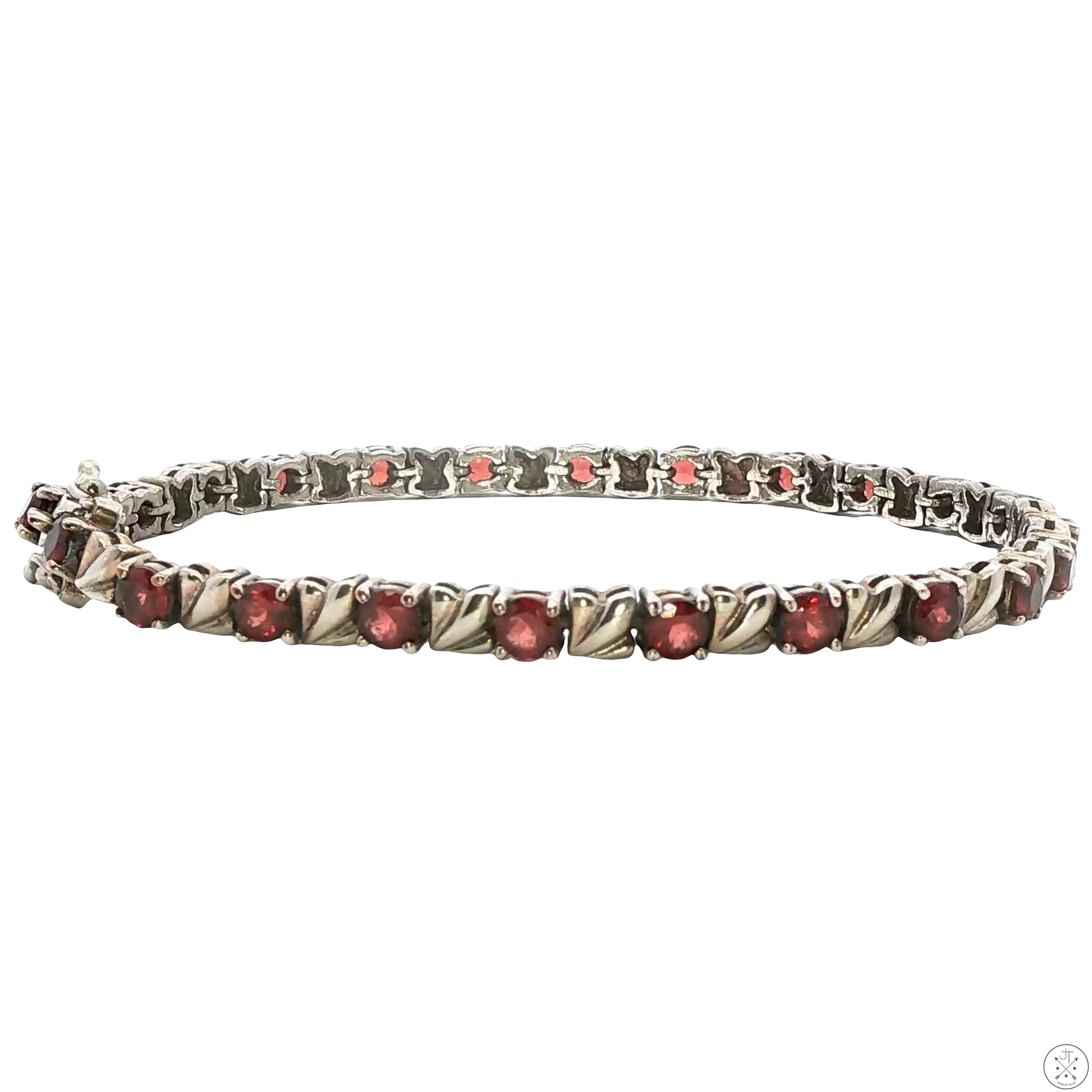 Embrace the beauty of natural Garnet with this stunning Sterling Silver bracelet. The harmonious blend of shimmering Gemstones and Sterling Silver creates a look of bright elegance. Ideal for those who appreciate fine craftsmanship and timeless design, this bracelet is a must-have for any jewelry lover. Stamped with a maker's mark, '925', and 'taiwan', this classy 8.25-inch long, 4.6 mm wide bracelet is in very good pre-owned condition and weighs approximately 14.53 grams. The 24 round-faceted natural Spessartine Garnet gemstones weigh approximately 8 carats total.