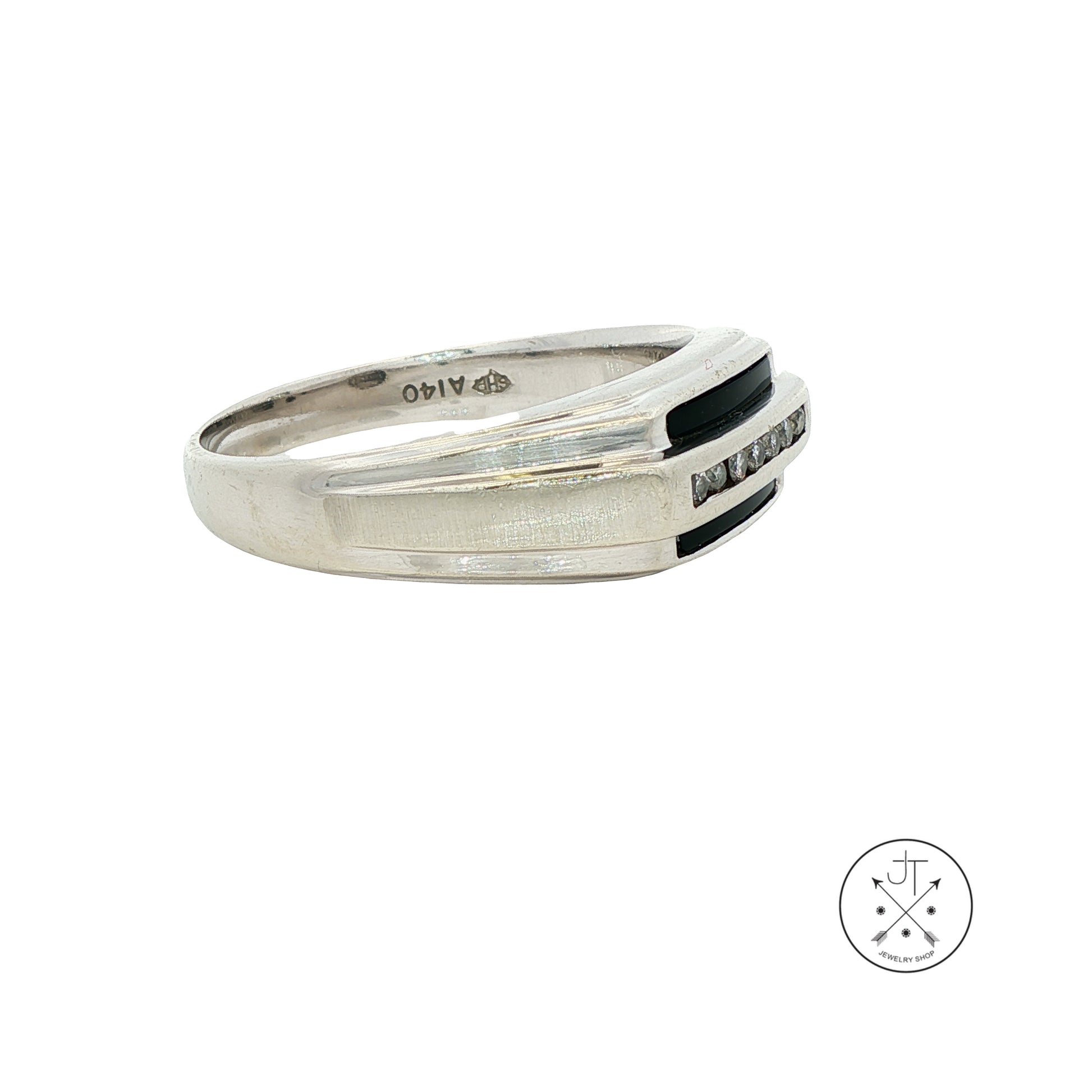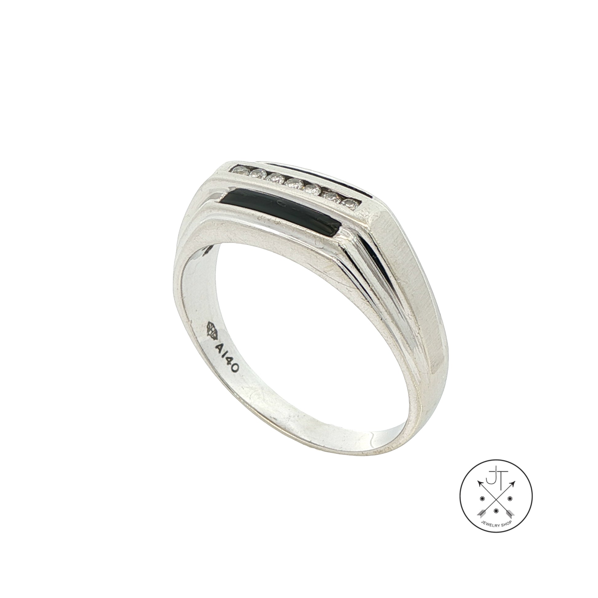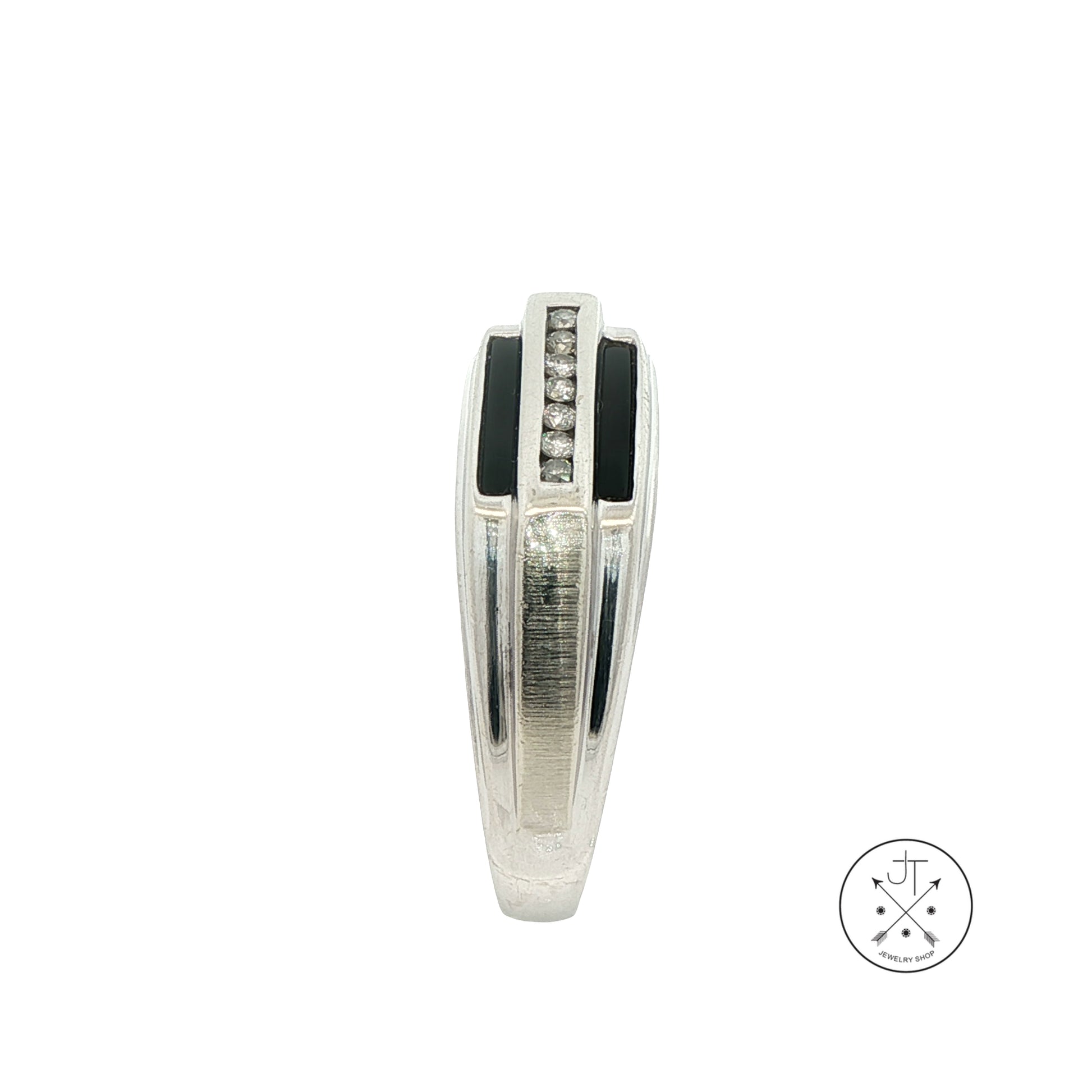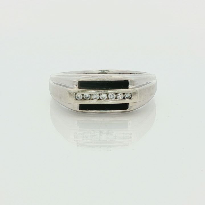 Wonderful vintage solid 10k White Gold ring with 7 small round-faceted natural channel-set Diamonds, approximately I-color and SI2-clarity, accented by 2 bars of Onyx. Stamped with a maker's mark, style number, copyright mark, and '10k', this wonderful size 13.5 vintage ring is in very good condition for its age and weighs approximately 6.89 grams. The top of the ring is approximately 8.8 mm at its widest, tapering to 3.2 mm at the bottom of the band.