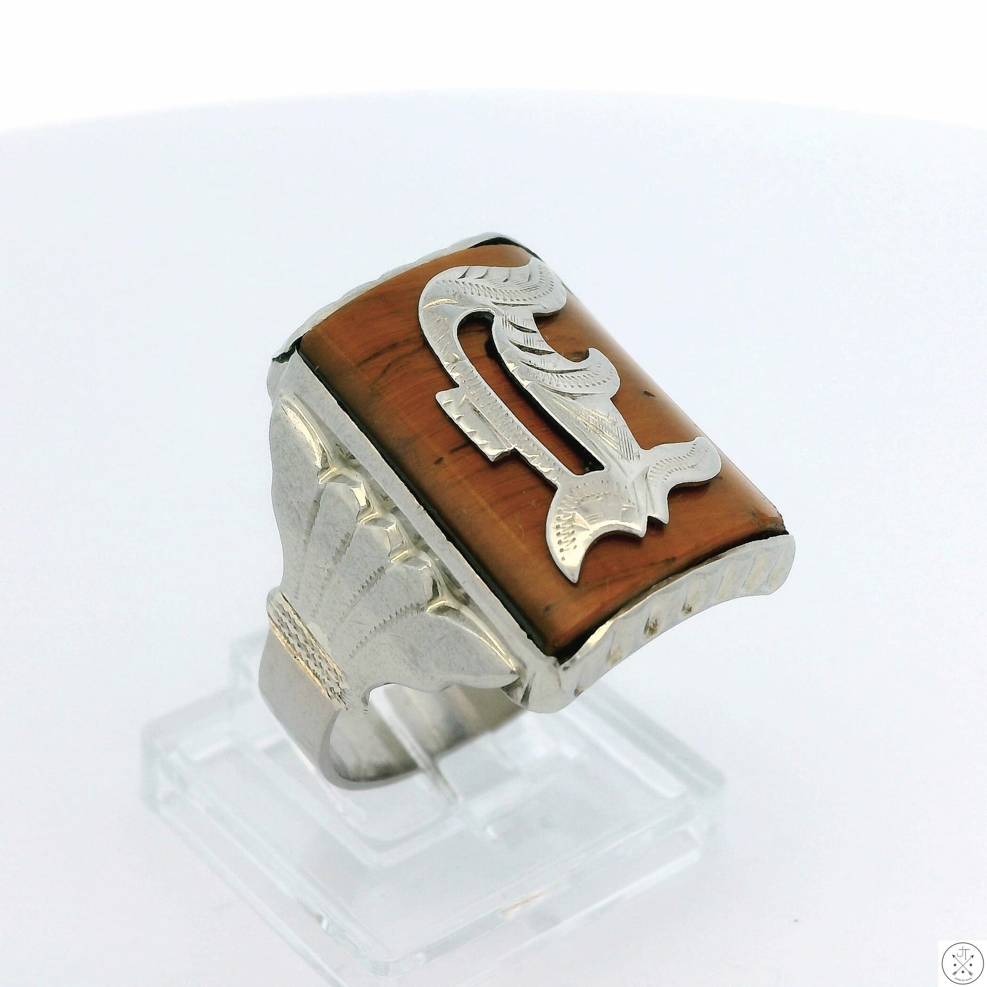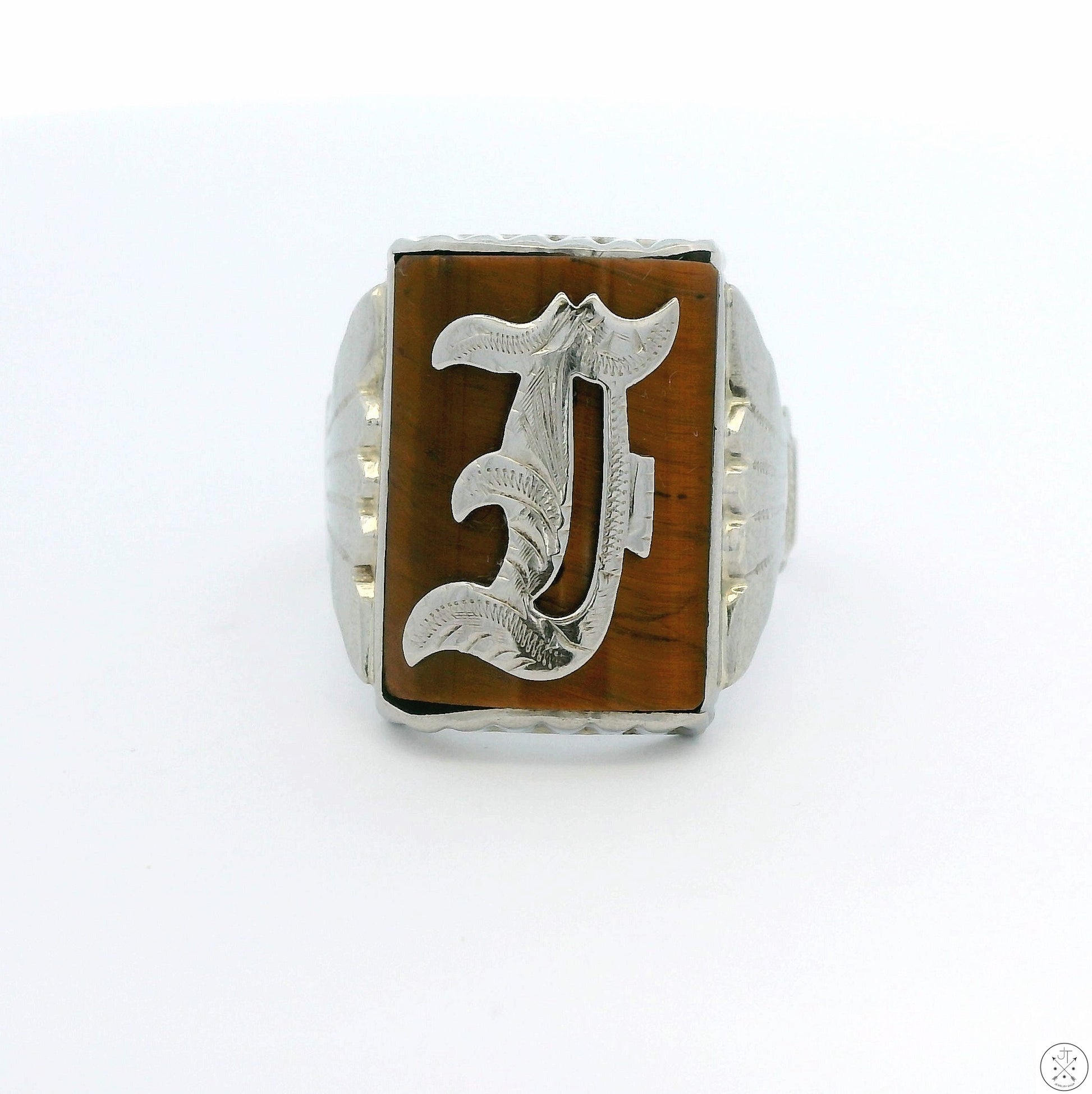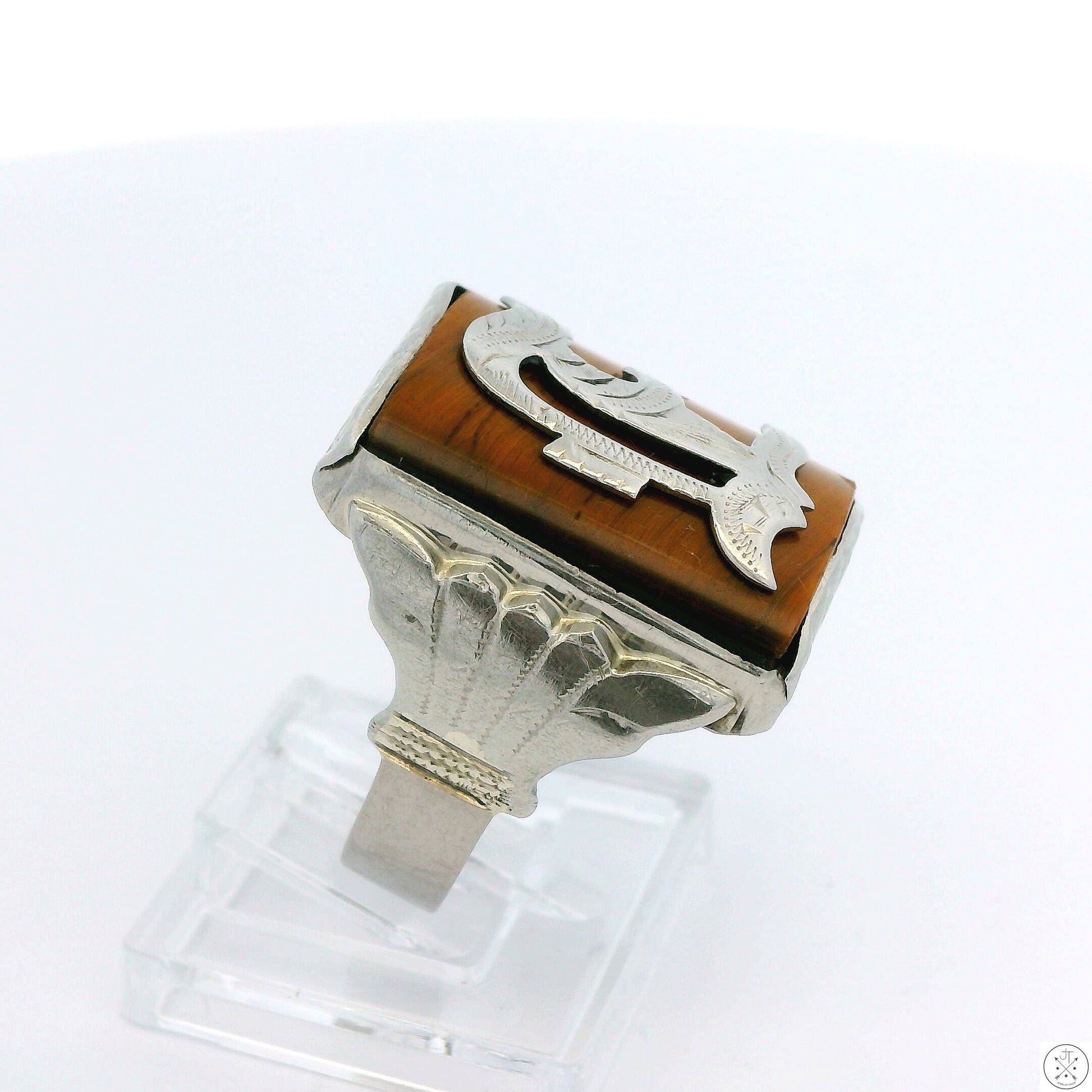 This exquisite 1980s ring features a striking natural Tiger's Eye gemstone slab with a 10k White Gold letter (make of it what you want - we see 3 letter possibilities) set in a 10k White Gold mounting. Although unstamped, this vintage size 10 ring has been independently tested as 10k-12k Gold, depending on the exact testing point, so we are calling it 10k Gold. Total weight is approximately 7.27 grams. The top of the ring is 20.4 mm at its longest, tapering to 4.5 mm at the bottom of the band, and is in excellent condition for its age.