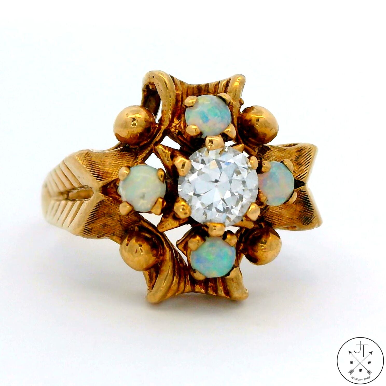 Vintage 10k Yellow Gold Ring with 1/2 carat Old Euro Diamond and Opal Size 5.5