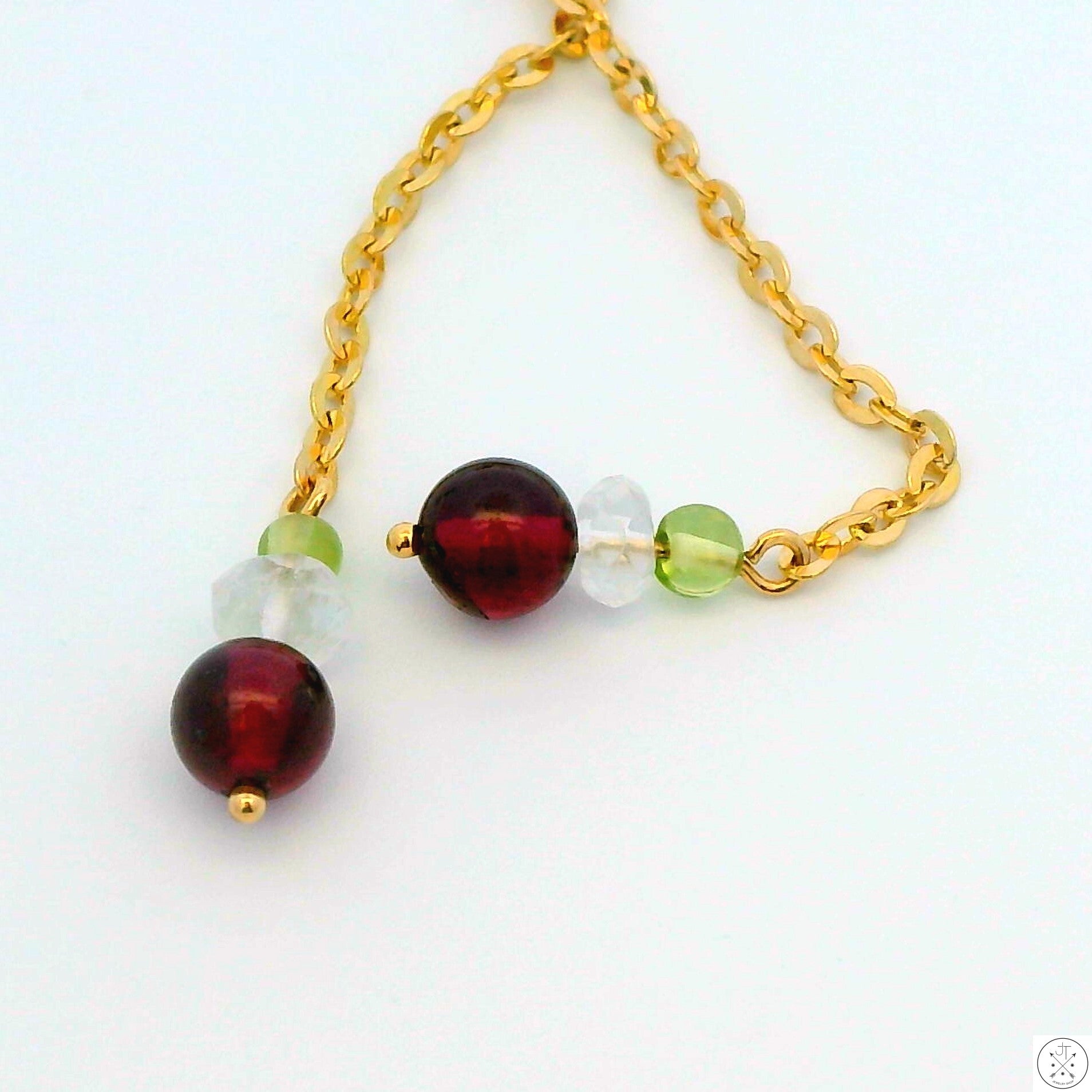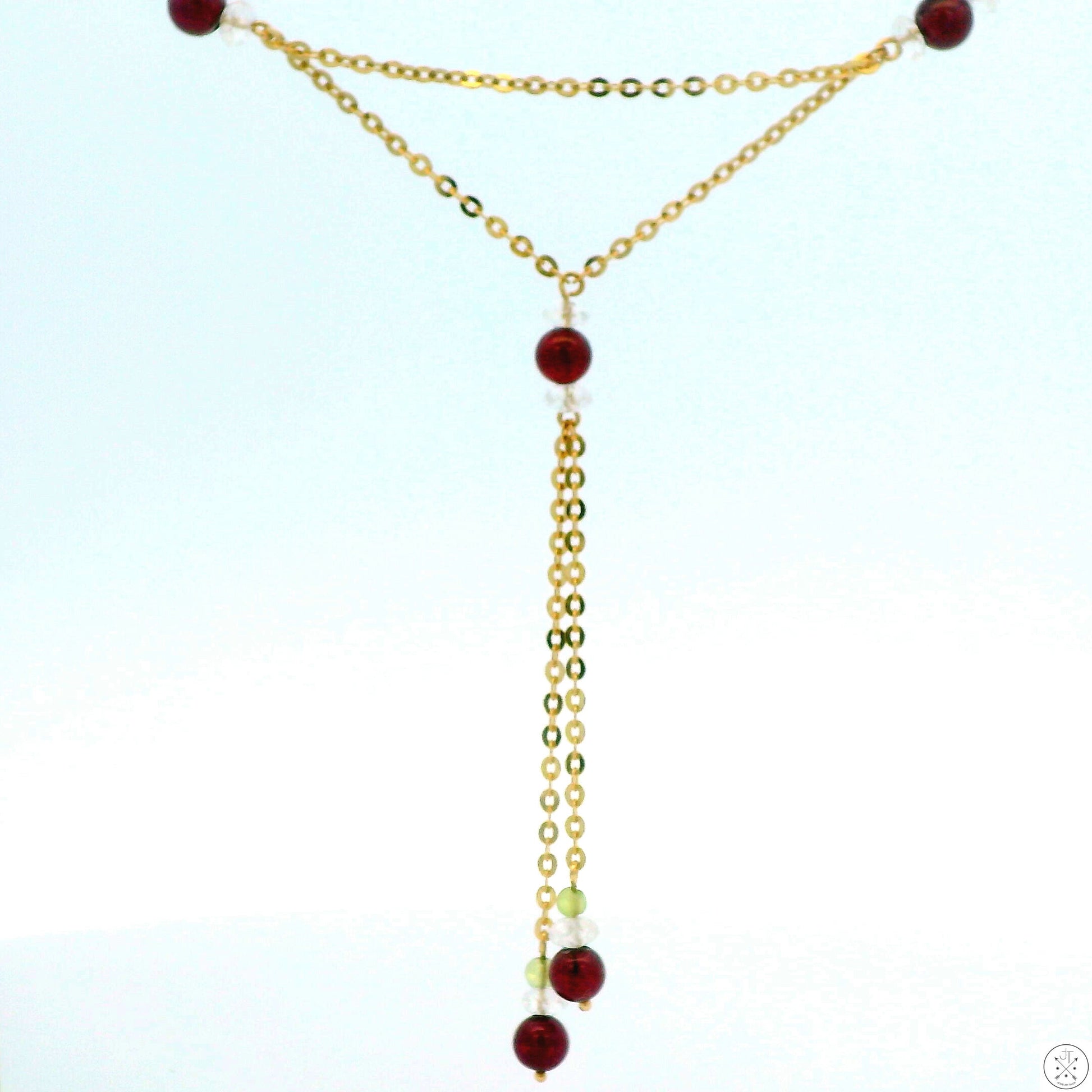 This stunning Lariat-style necklace features a beautiful combination of 14k Yellow Gold, lustrous round natural Garnet beads, faceted natural Quartz beads, and 2 small green beads that appear to be Peridot. Perfect for adding a touch of elegance to any outfit, this is an ideal accessory for any occasion. The timeless design ensures it will remain a cherished piece in your jewelry collection. Stamped with a maker's mark and '14k' on the spring ring clasp and end piece, this wonderful vintage necklace weighs approximately 5.00 grams and is in excellent condition for its age. The 7 Garnet beads are approximately 4.7 mm in diameter. The 1.6 mm wide link chain necklace is worn at approximately 16 inches and has a tassel drop of 2 1/4 inches.