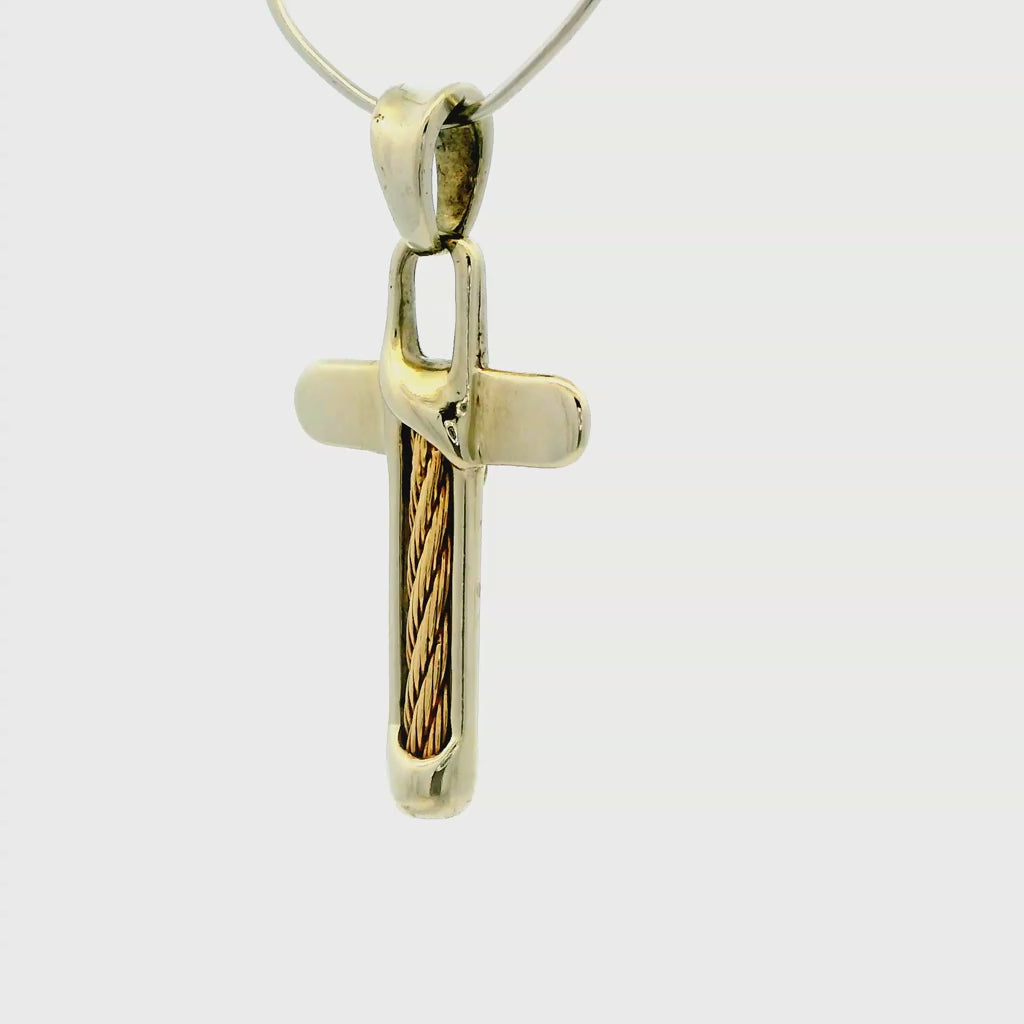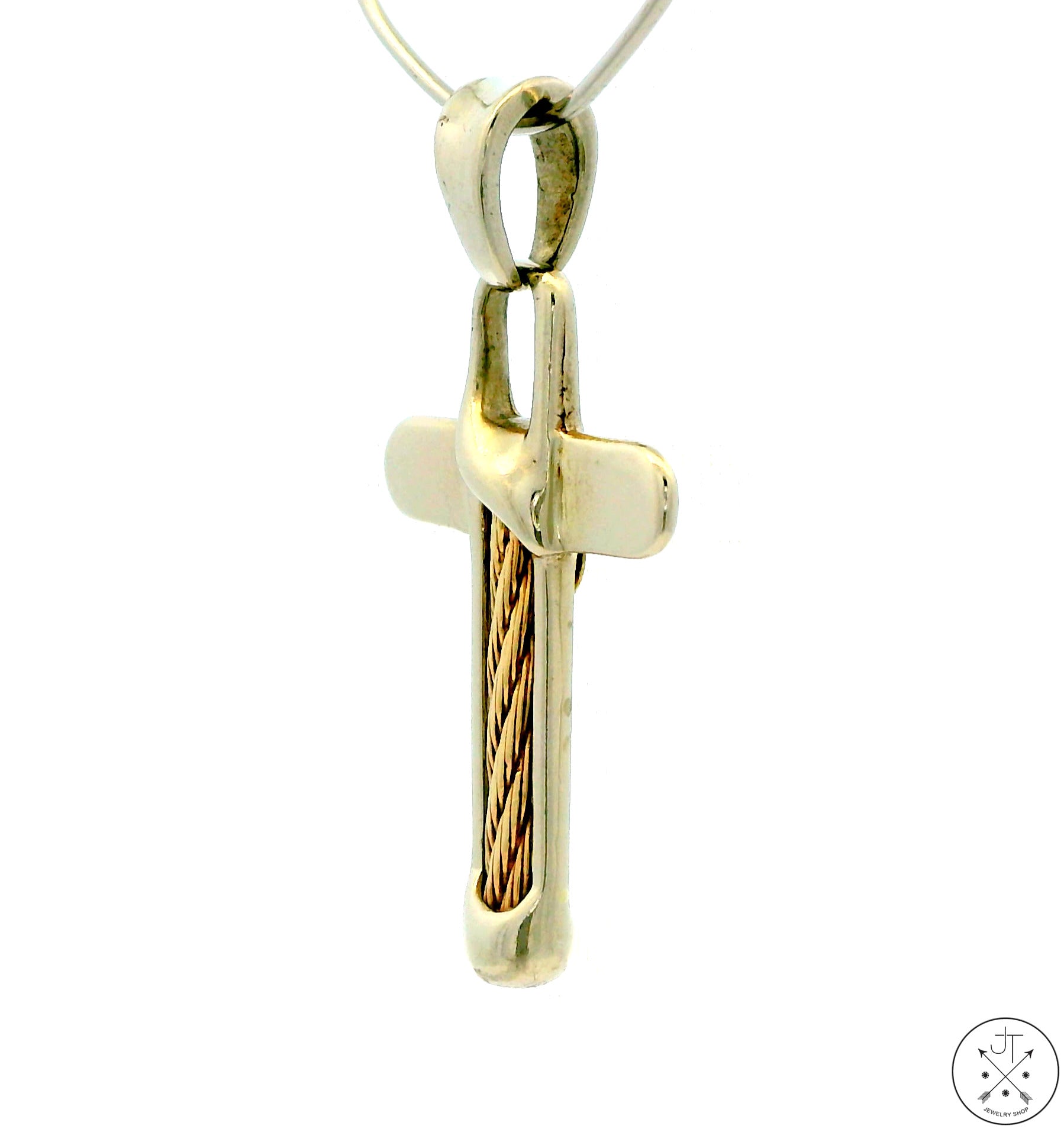 Gorgeous vintage solid 14k White Gold pendant with a 14k Yellow Gold twisted rope insert, and a Yellow Gold seal stamped '14kt Lee Italy' on the back. This unique Cross pendant is in excellent condition, weighs approximately 2.20 grams, and measures approximately 30 mm x 14 mm, including the bale, which can accommodate up to a 2.6 mm chain.