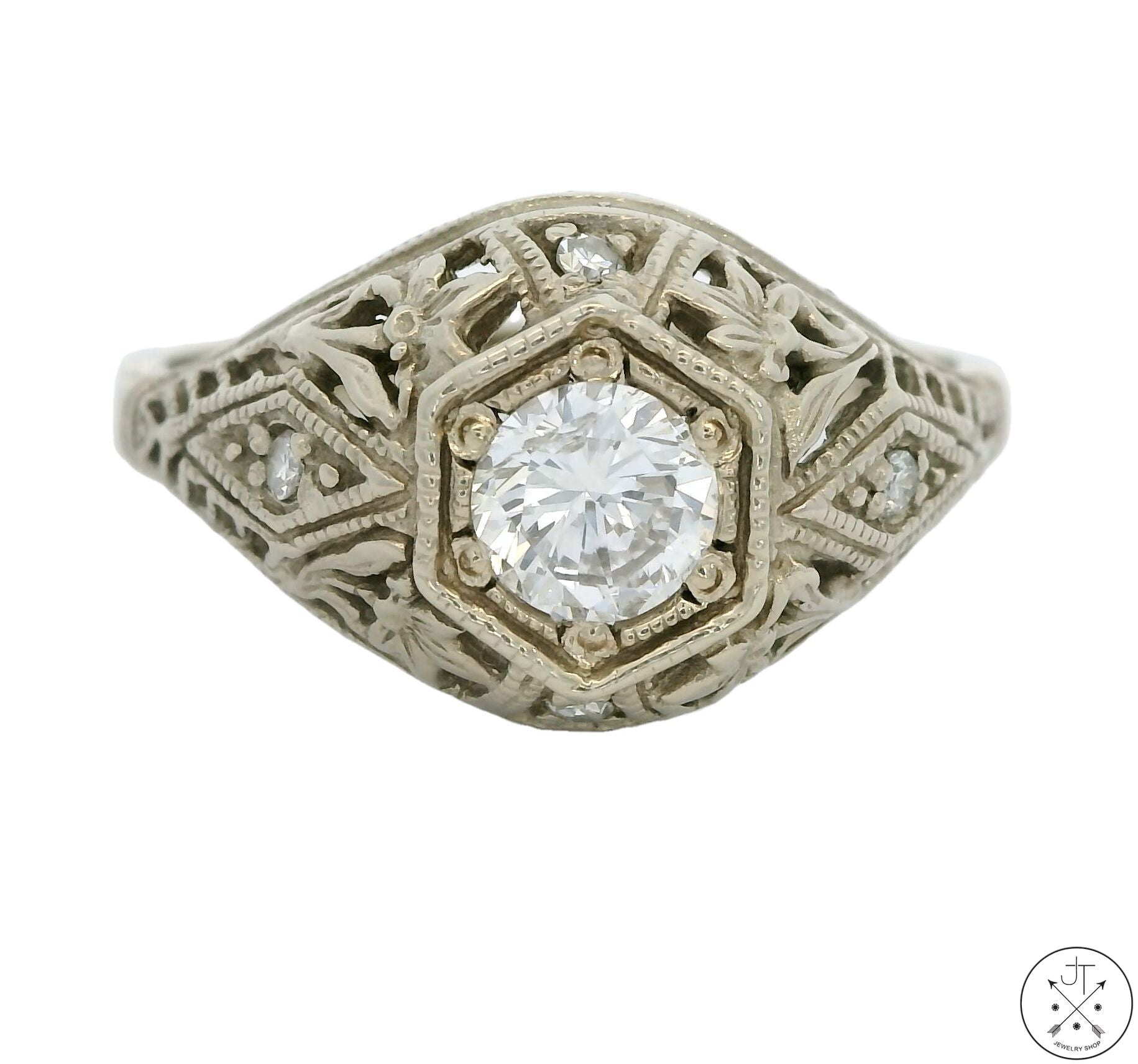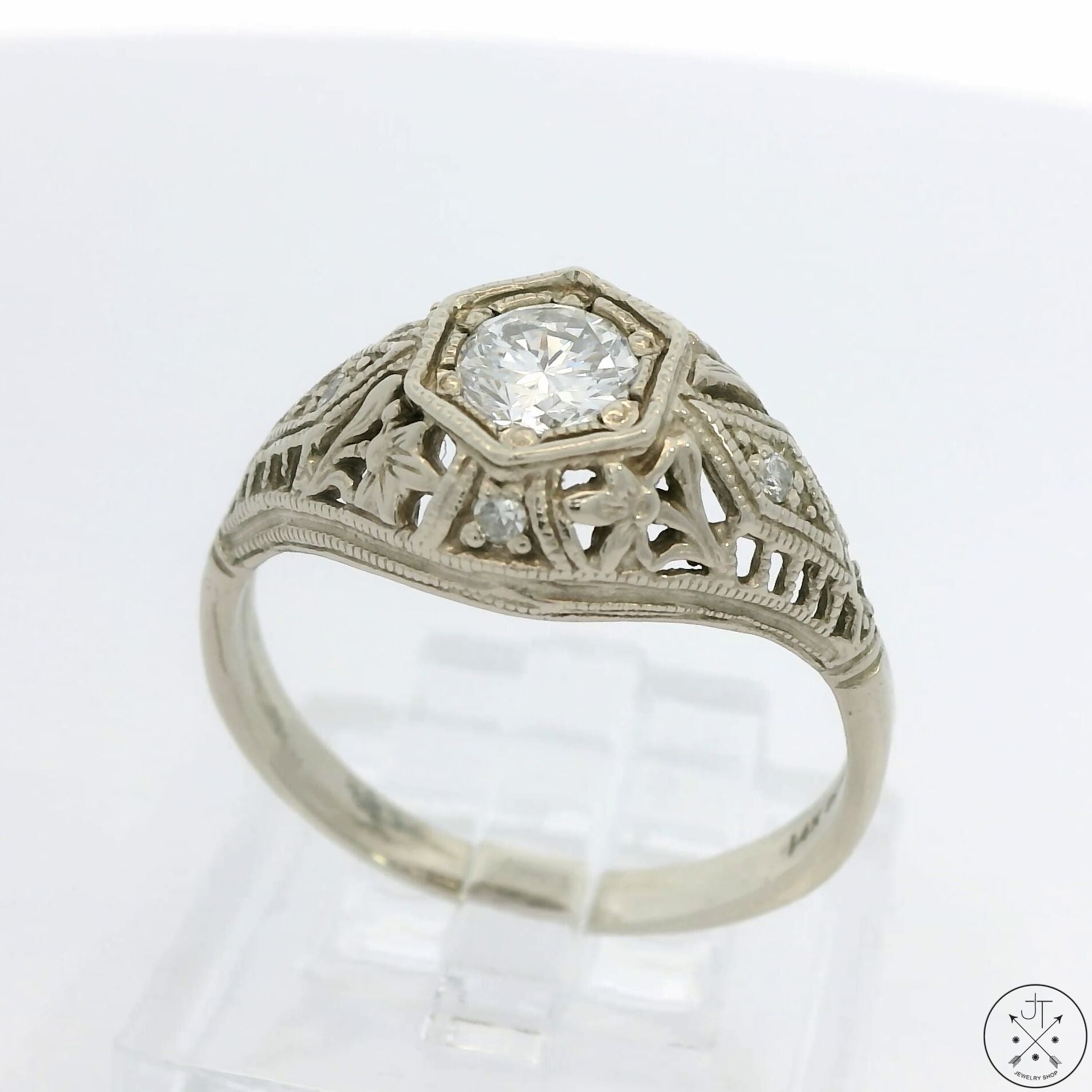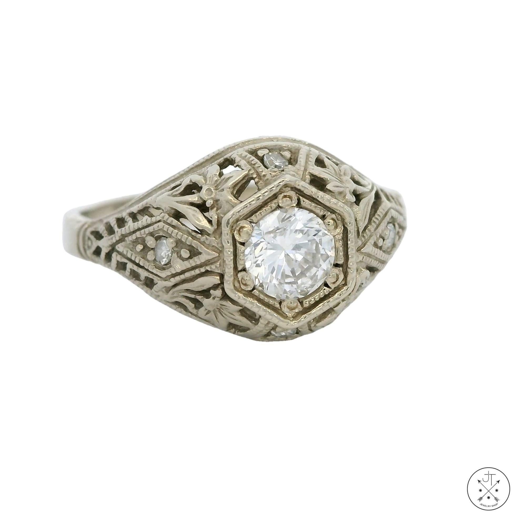 Gorgeous 1930s solid 14k White Gold filigree ring with a beautiful .45 carat G-color and SI2-clarity round-faceted natural Diamond accented by 4 single cut natural Diamonds, approximately .03 ctw. The main Diamond has been replaced at some point from the original Old Mine Cut stone this ring was made for. Stamped '14k cjd', this wonderful size 7.75 vintage ring is in excellent condition, especially for its age.