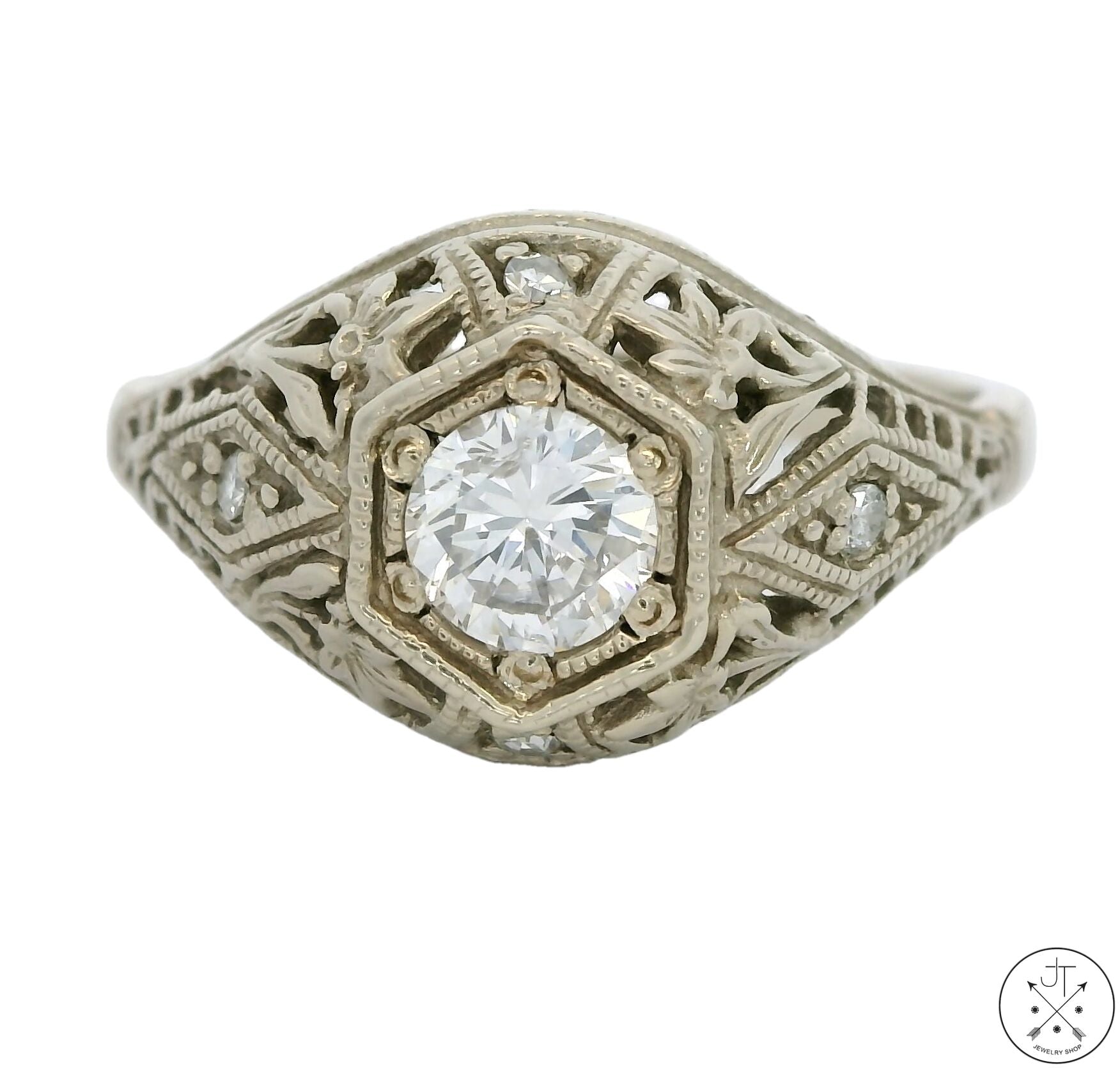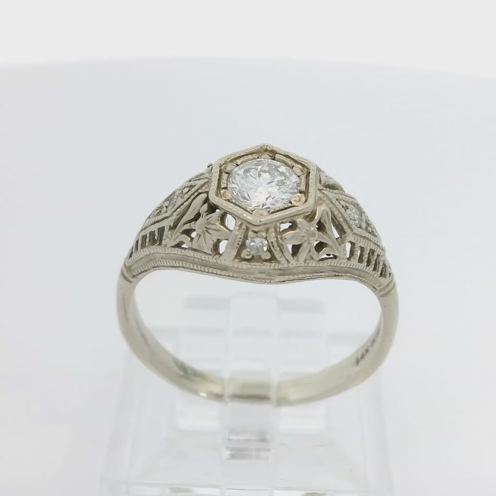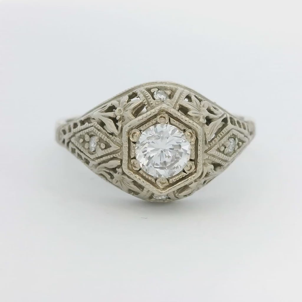 Gorgeous 1930s solid 14k White Gold filigree ring with a beautiful .45 carat G-color and SI2-clarity round-faceted natural Diamond accented by 4 single cut natural Diamonds, approximately .03 ctw. The main Diamond has been replaced at some point from the original Old Mine Cut stone this ring was made for. Stamped '14k cjd', this wonderful size 7.75 vintage ring is in excellent condition, especially for its age.