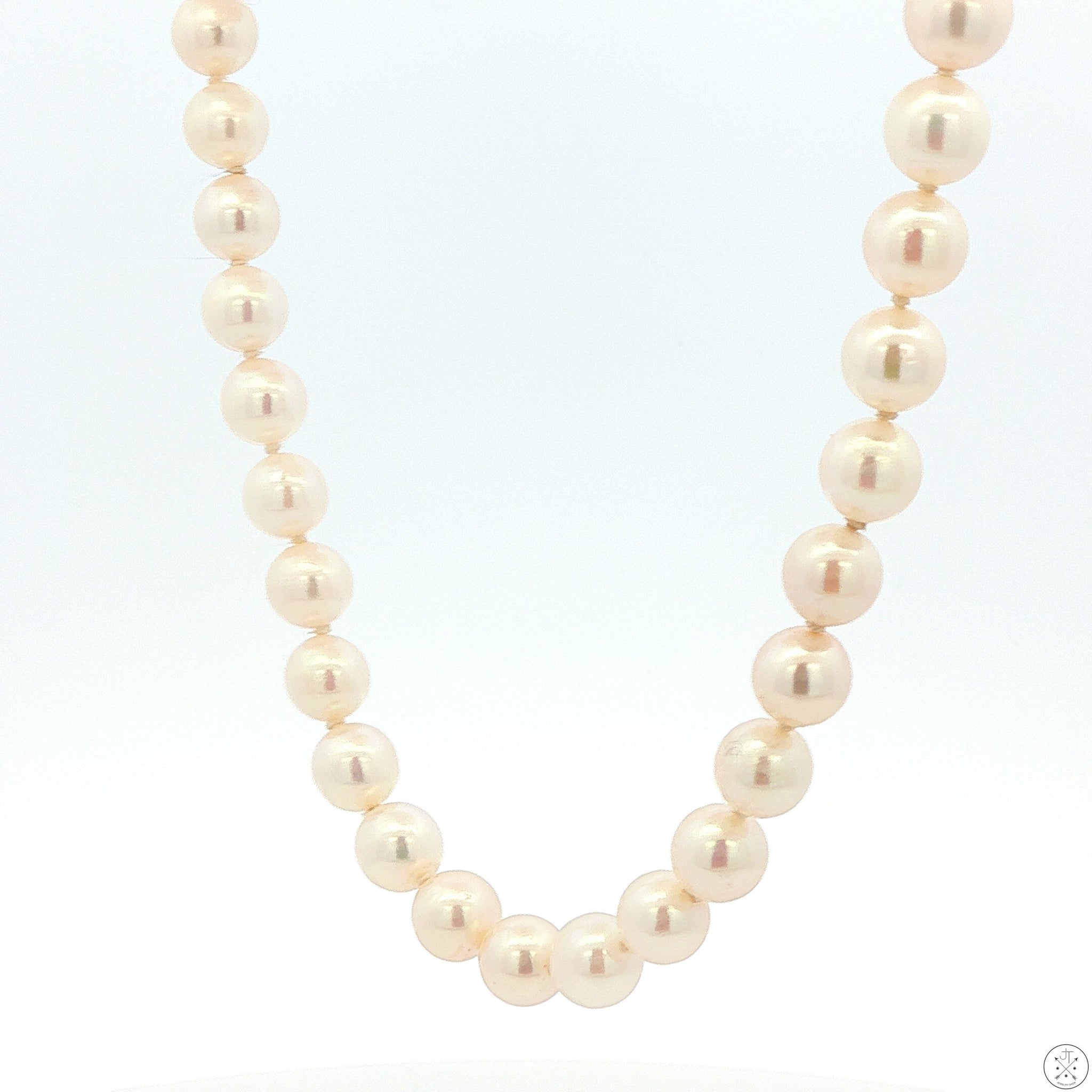 This exquisite necklace features a stunning array of lustrous Pearls with a solid 14k Gold clasp. Perfect for both casual and formal occasions, this necklace is a timeless addition to your jewelry collection. Stamped with an 'M' maker's mark and '14k' on the clasp, this wonderful, vintage, 24-inch long necklace weighs approximately 33.35 grams, and is in excellent condition. The 89 hand-knotted Pearls range from approximately 6.3 mm to 6.6 mm in diameter, are slightly pinkish to peachy with excellent luster, and appear to be cultured.